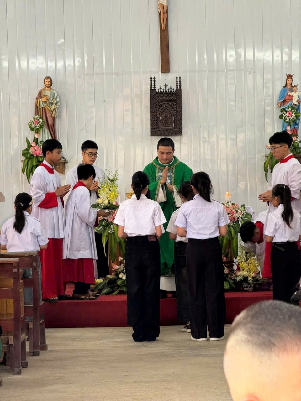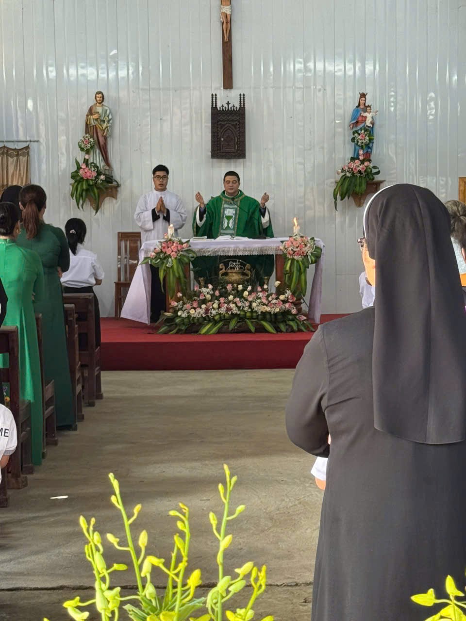 Ngay sau đó, đỉnh cao của ngày Chầu lượt là Thánh lễ Tạ ơn ngày Chầu do Cha xứ Giuse long trọng cử hành. Hiện diện trong Thánh lễ còn có sự hiện diện của quý Thầy, quý Dì cộng đoàn Mến Thánh Giá Văn Bàn và đông đảo cộng đoàn dân Chúa.