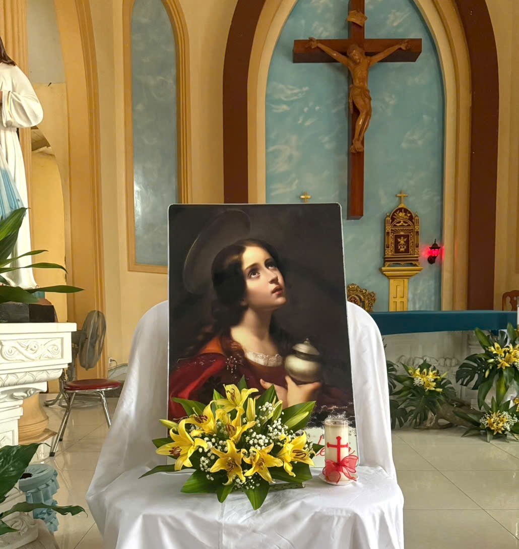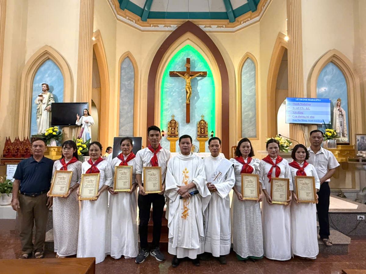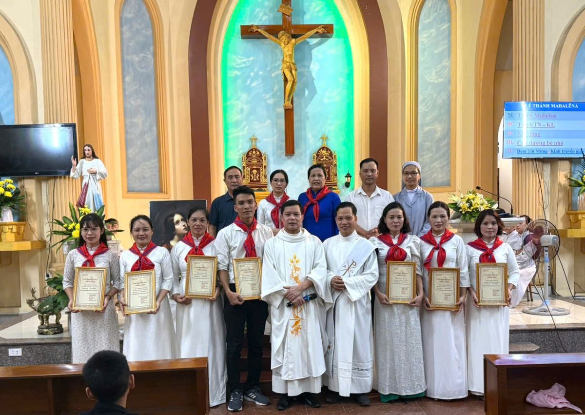 WGPHH – Chiều thứ Hai, ngày 21/7/2025, anh chị em Giáo lý viên Giáo xứ Tân Quang đã hân hoan quy tụ về ngôi thánh đường của giáo xứ để mừng kính Thánh Maria Mađalêna – vị thánh Quan thầy mà các anh chị em chính thức chọn làm bổn mạng. Đây là lần đầu tiên lễ Quan thầy được tổ chức riêng và cách trọng thể dành cho Giáo lý viên tại giáo xứ. Nhân dịp đặc biệt này, 9 Giáo lý viên đã vinh dự được trao chứng nhận hoàn thành khóa đào tạo sư phạm giáo lý cấp I. Ngay từ buổi chiều, các anh chị em Giáo lý viên đã cùng nhau chuẩn bị trang hoàng bàn thờ, cắm hoa, làm đẹp ảnh vị Thánh Quan Thầy.