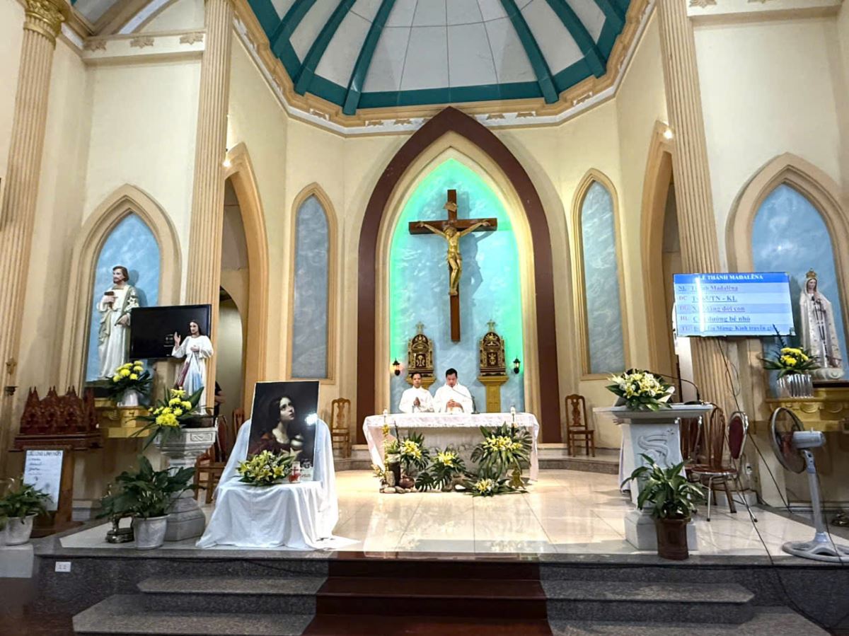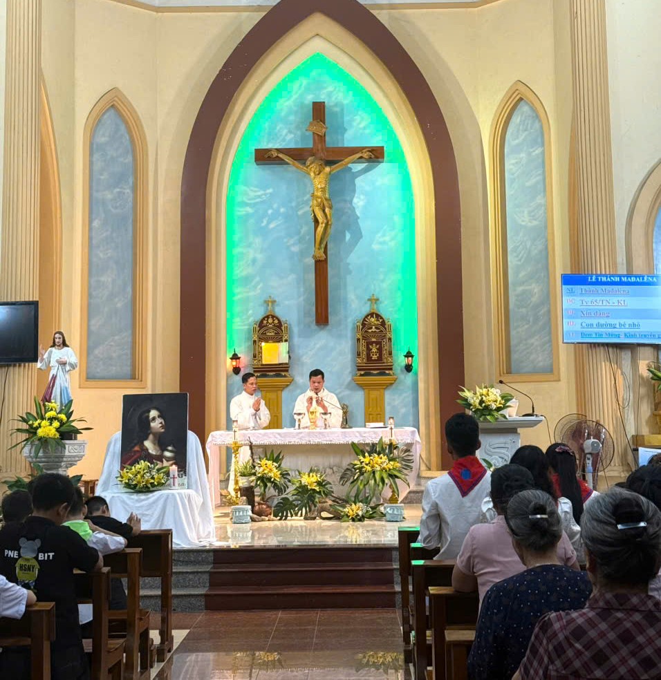 Vào lúc 19g30, Thánh lễ mừng kính Thánh nữ Maria Mađalêna được cử hành do Cha quản xứ Giuse Cấn Xuân Bằng chủ tế. Hiện diện trong Thánh lễ có thầy phó tế Giuse Nguyễn Văn Lan cùng đông đảo cộng đoàn dân Chúa.