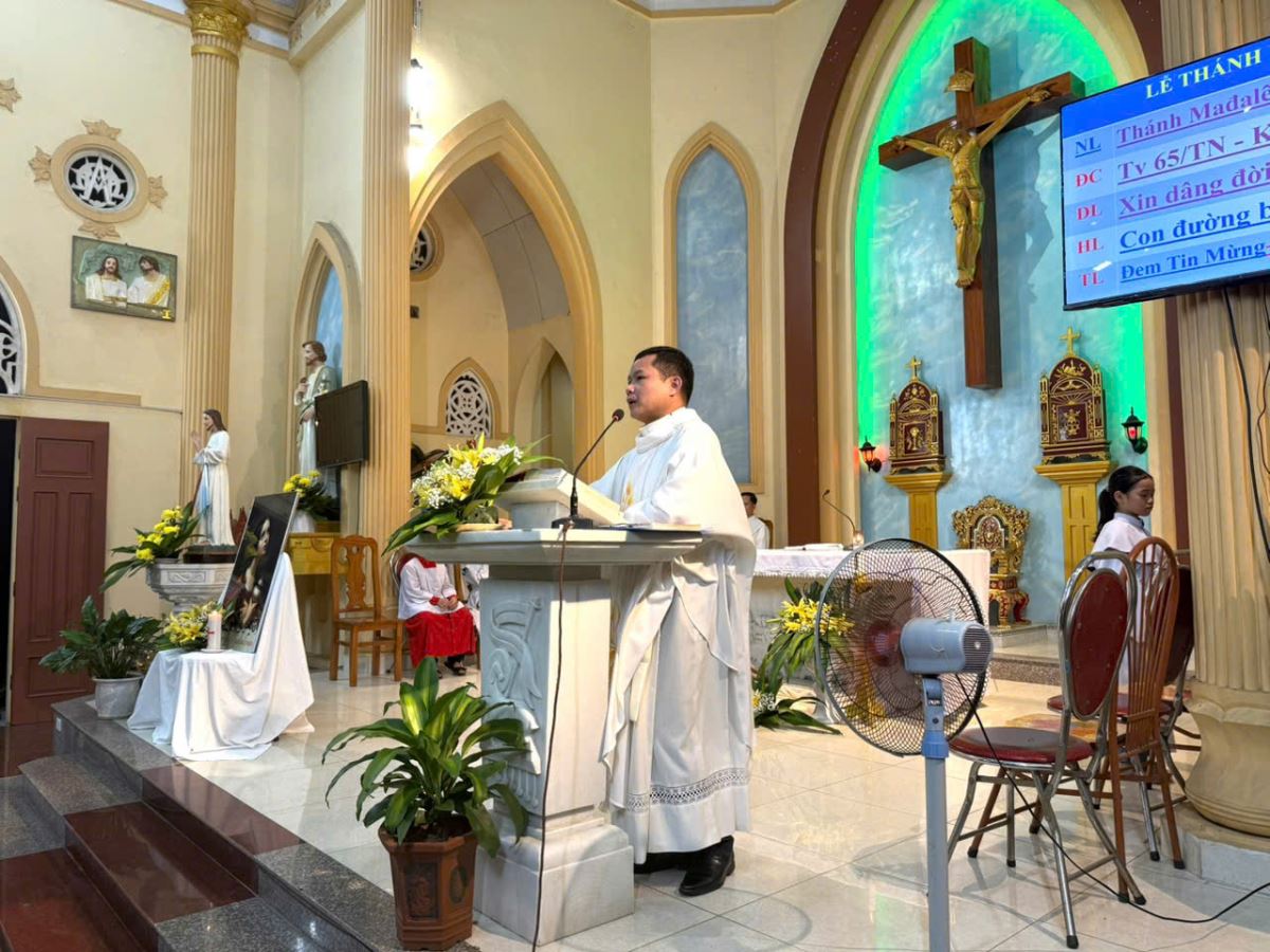Giảng trong Thánh lễ, Cha Giuse đã phác họa chân dung và hành trình đức tin của Thánh nữ Maria Mađalêna, người được mệnh danh là “Tông đồ của các Tông đồ”. Dù thuộc phái yếu, Thánh nữ đã can đảm làm chứng và loan báo Tin Mừng Phục Sinh nhờ lòng mến Chúa nồng nàn. Cha Giuse nhắn nhủ các Giáo lý viên hãy noi gương Thánh Quan thầy, sống đời chứng nhân qua sứ vụ giảng dạy Giáo lý, đặc biệt bằng tình yêu và sự gần gũi với các em thiếu nhi.