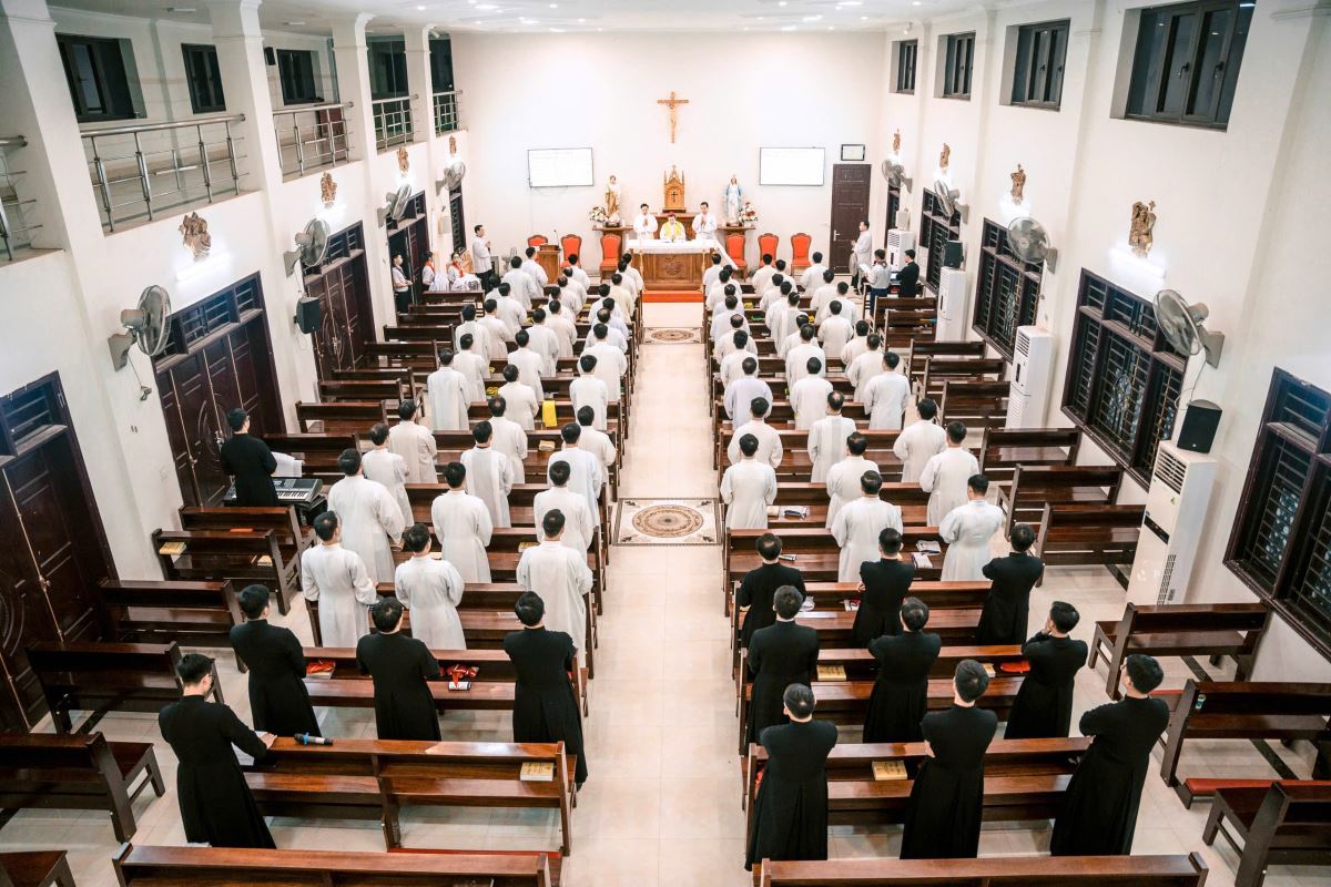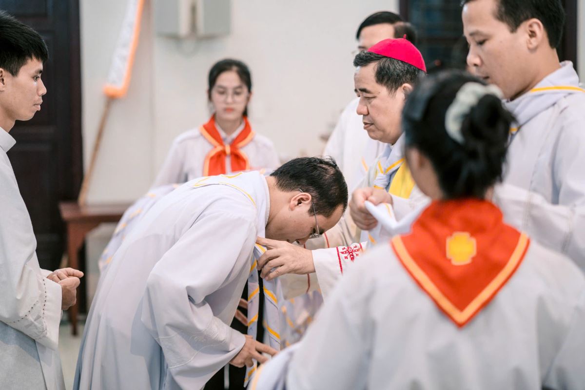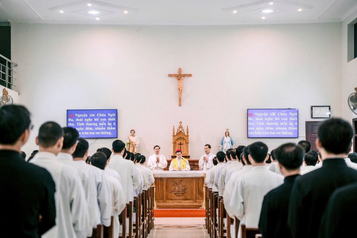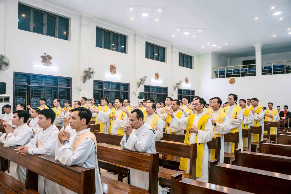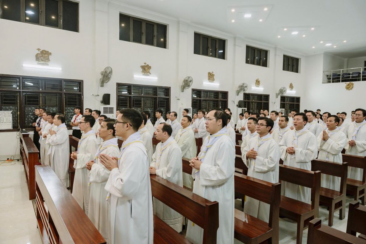 Lúc 19g00, tại Nhà nguyện Trung Tâm Mục Vụ Hà Thạch, Đức Cha Đaminh, Giám mục giáo phận đã chủ sự Nghi thức trao khăn Tuyên Úy cho quý cha.