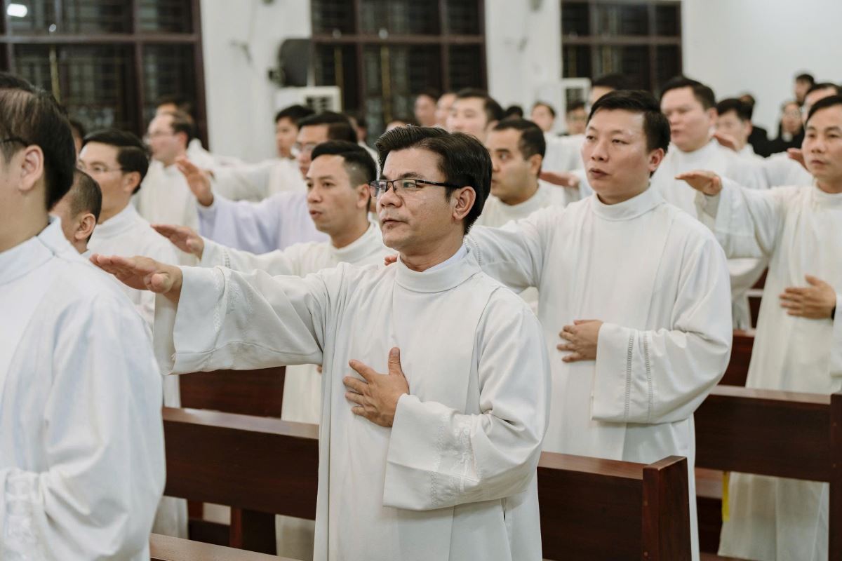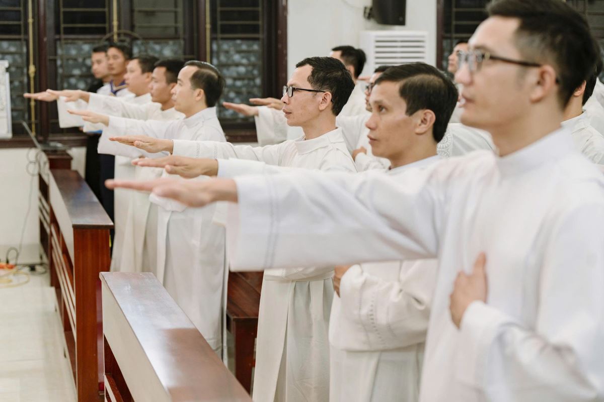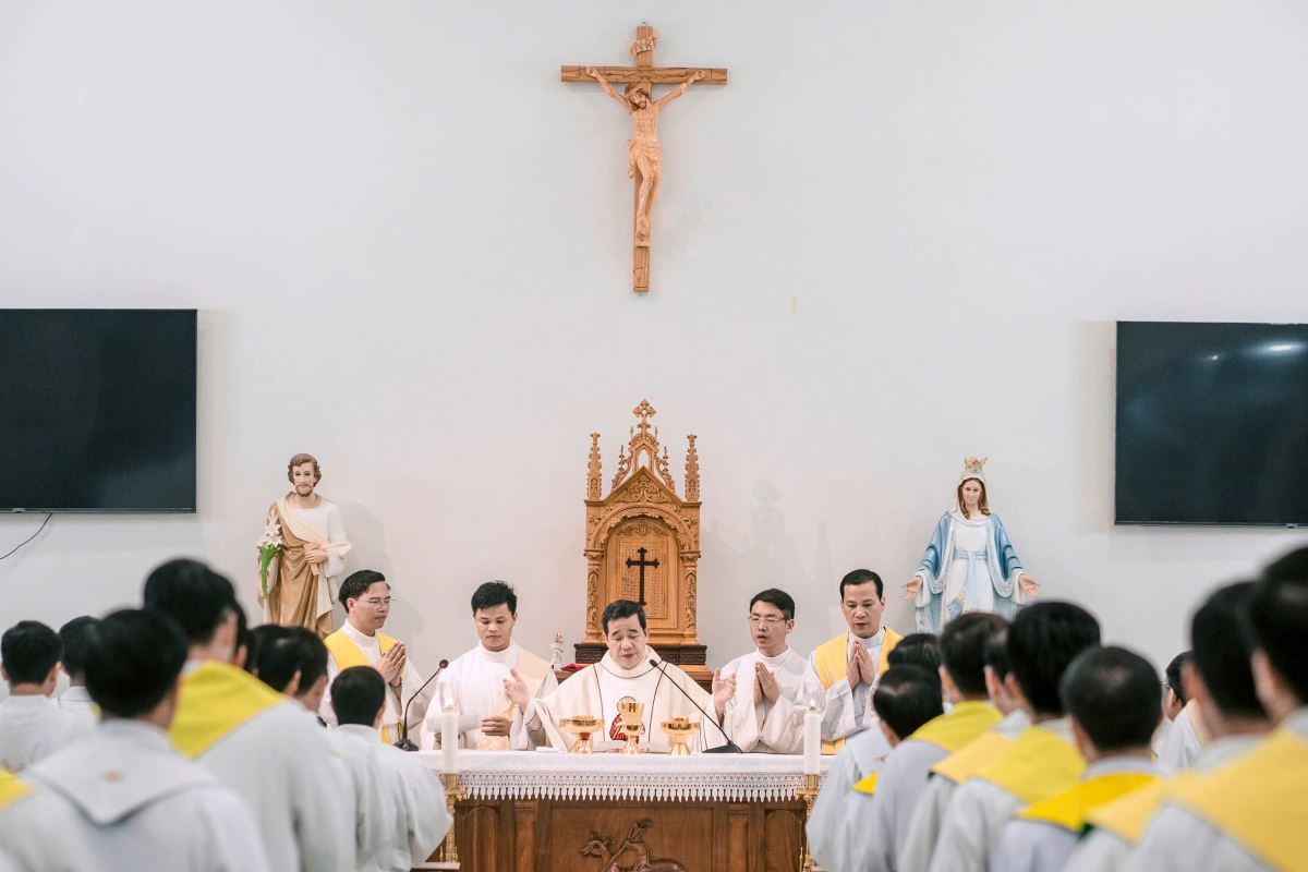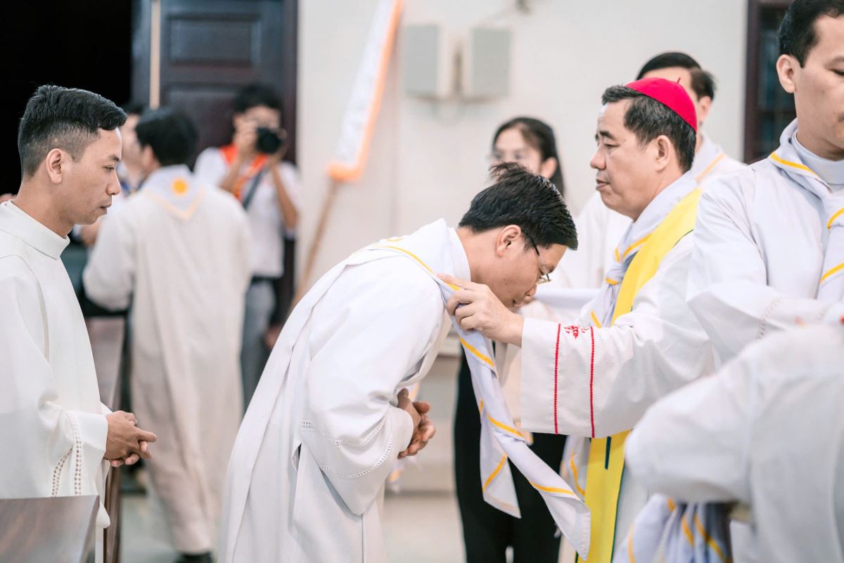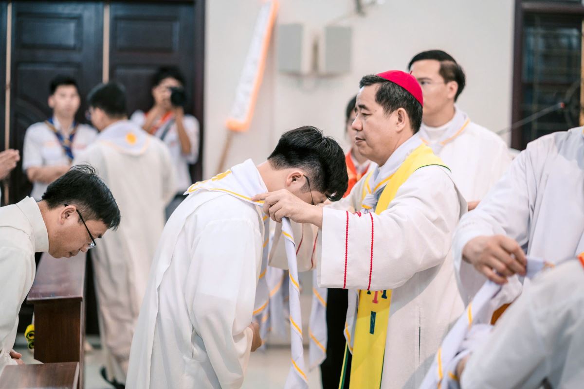 Lúc 19g00, tại Nhà nguyện Trung Tâm Mục Vụ Hà Thạch, Đức Cha Đaminh, Giám mục giáo phận đã chủ sự Nghi thức trao khăn Tuyên Úy cho quý cha.