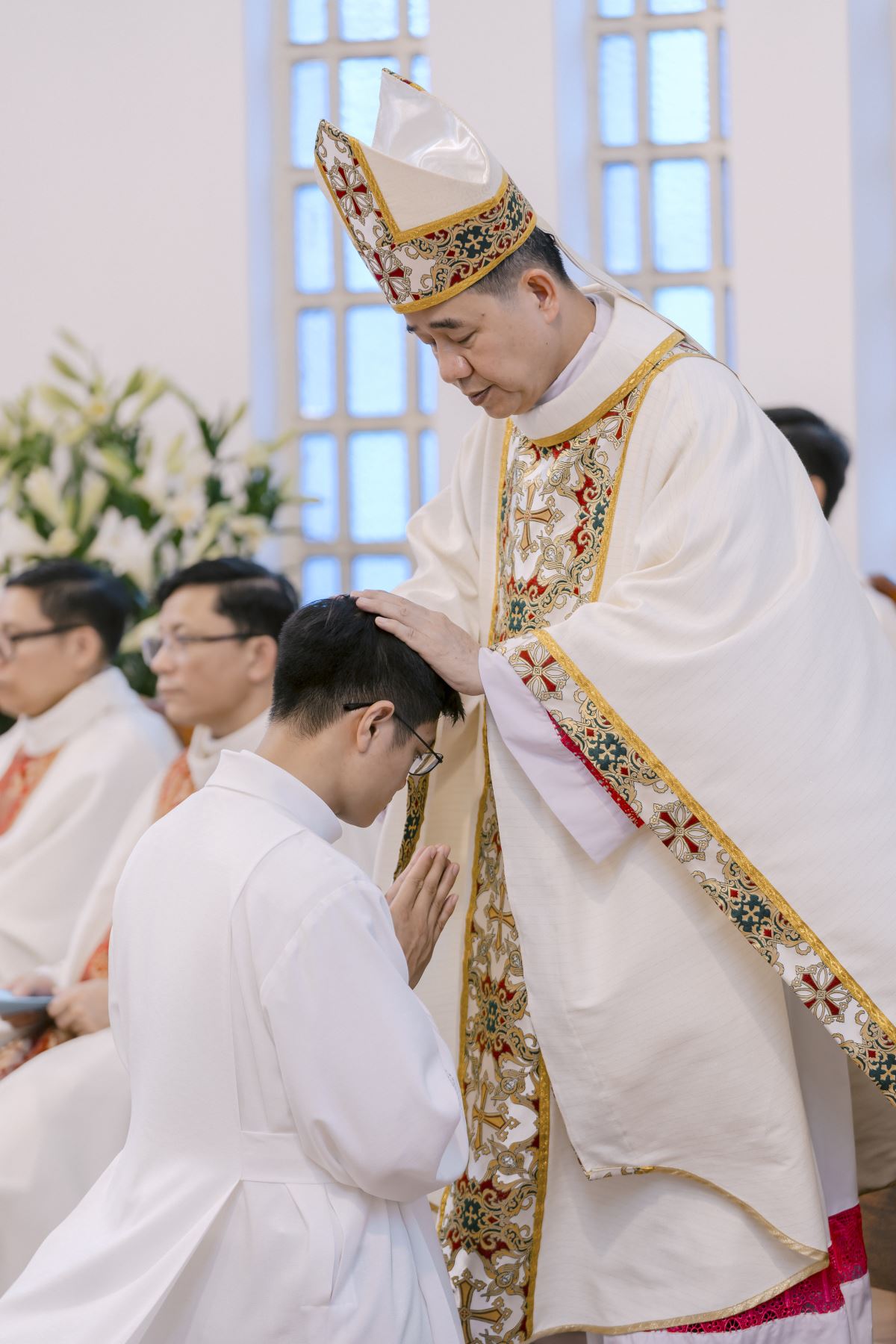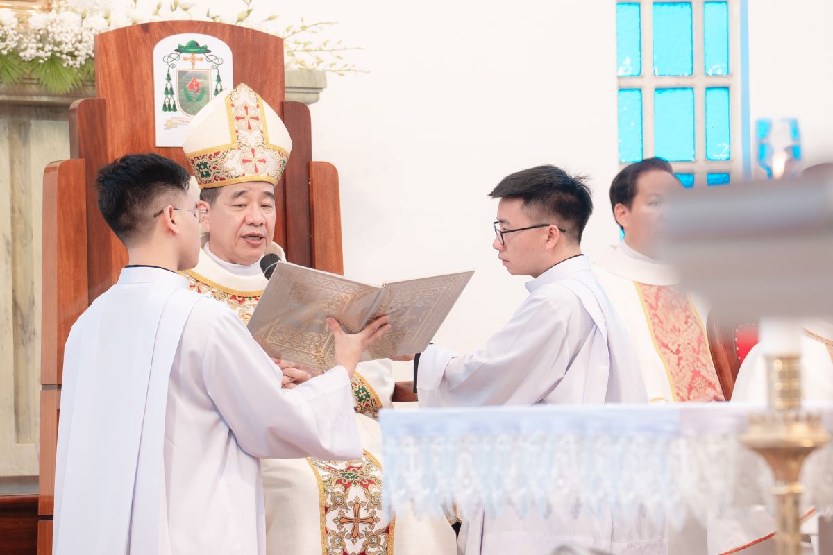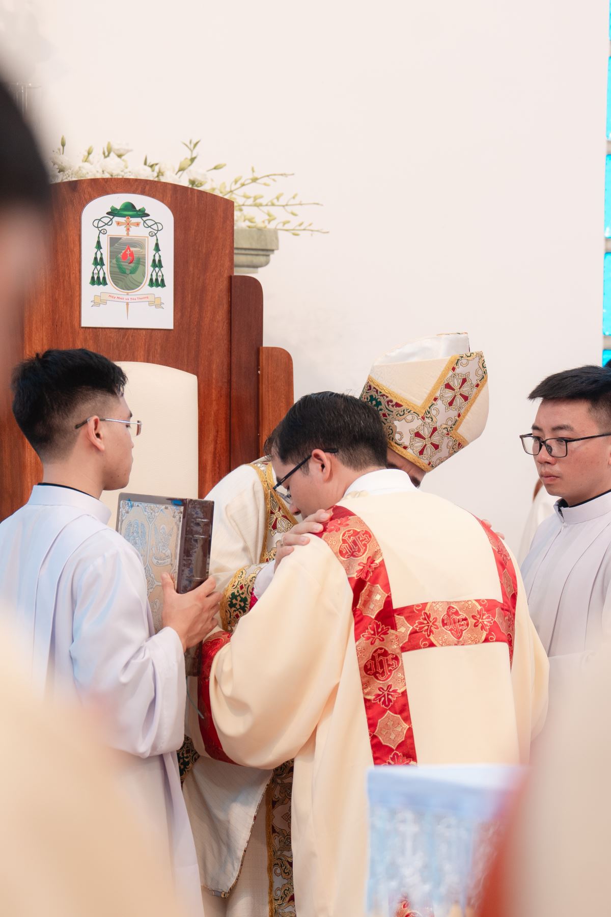 Các tân Phó tế được mặc phẩm phục phó tế. Sau đó, ĐGM trao sách Phúc âm và trao hôn bình an. Khi trao sách Phúc Âm, ĐGM căn dặn các tân chức: