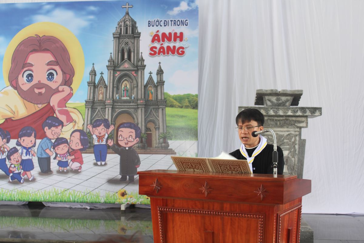 Trước khi đánh trống khai mạc, Cha Giuse Bảo nhấn mạnh tầm quan trọng của việc học Giáo lý. Ngài mời gọi các em, bên cạnh việc học văn hóa ở trường, hãy siêng năng trau dồi Giáo lý, nuôi dưỡng đức tin qua các lớp học tại giáo xứ vào sáng Chúa nhật hàng tuần và tham dự thánh lễ. Cha cũng cảnh báo thực trạng nhiều bạn trẻ ngày nay sa đà vào trò chơi điện tử, thâu đêm suốt sáng, ảnh hưởng đến sức khỏe, việc học hành và đời sống đức tin, làm cha mẹ phiền lòng. Từ đó, Cha khuyến khích các em hãy noi gương vị thánh trẻ Carlo Acutis – bổn mạng của Xứ đoàn, biết sử dụng các phương tiện truyền thông, internet và công nghệ hiện đại để học hỏi Giáo lý, yêu mến Giáo hội và góp phần xây dựng Nước Chúa.