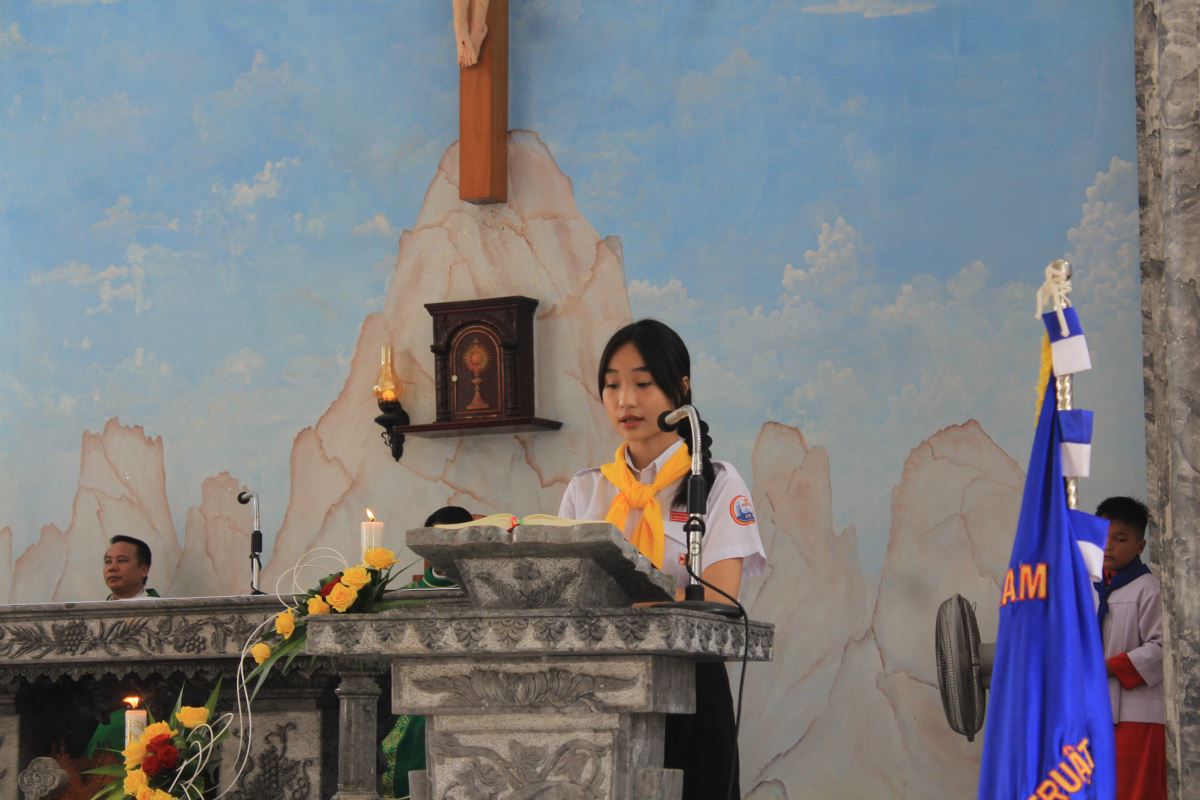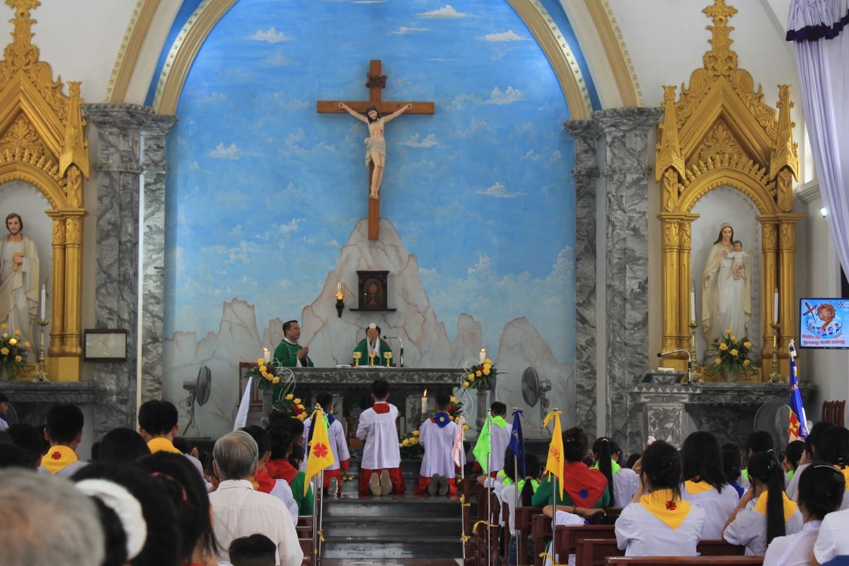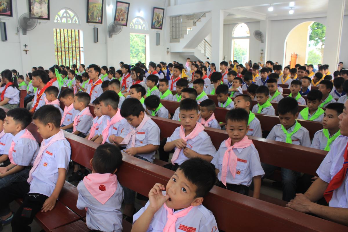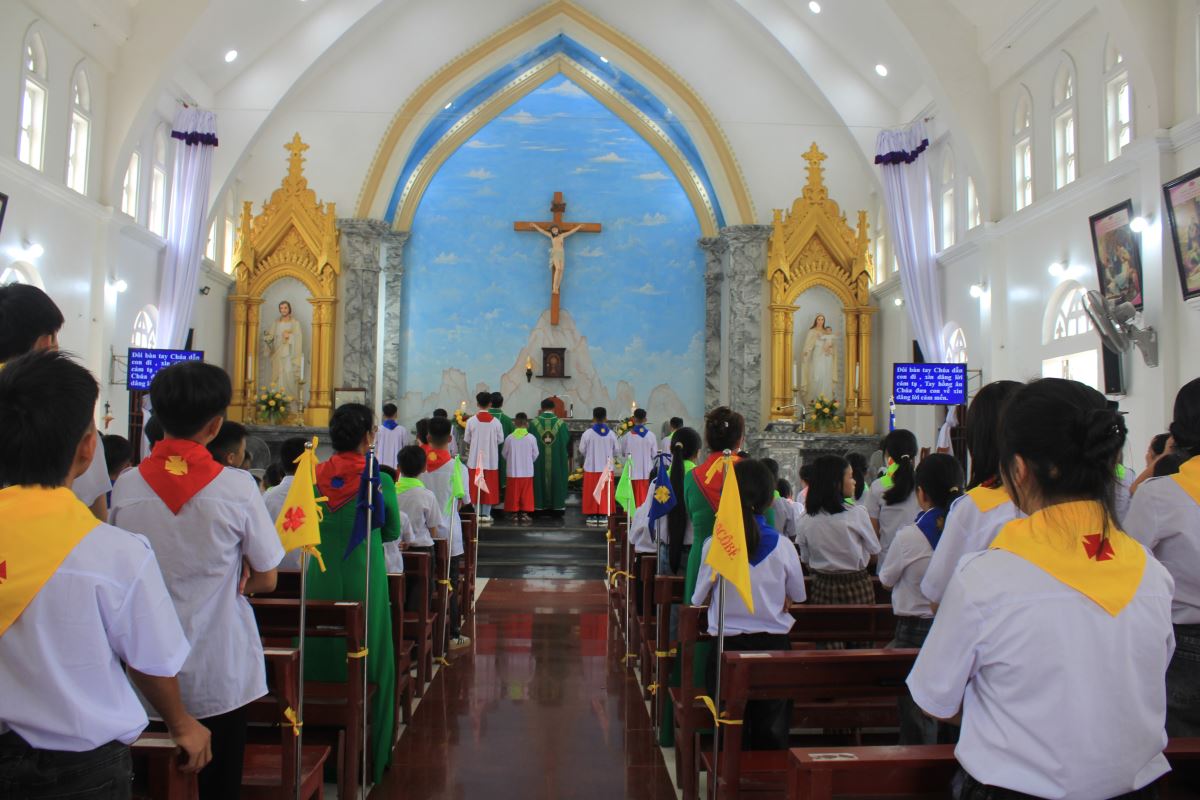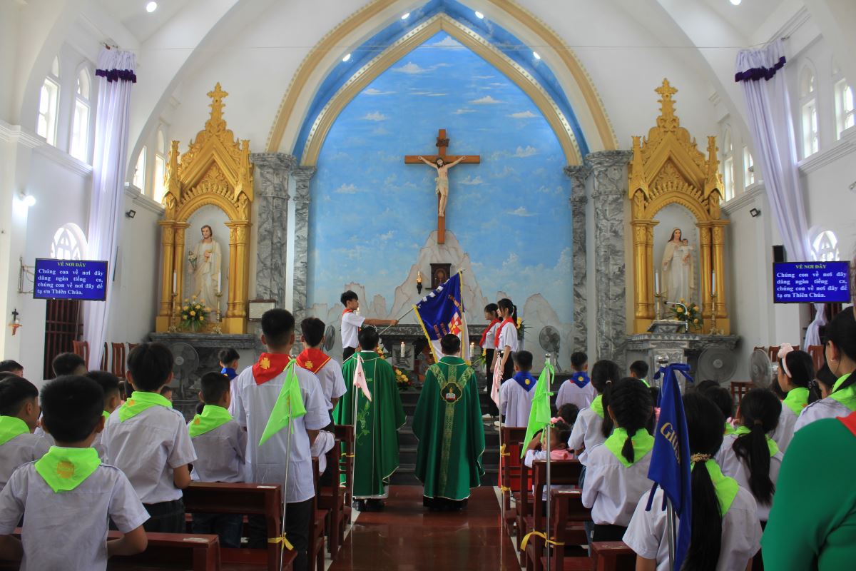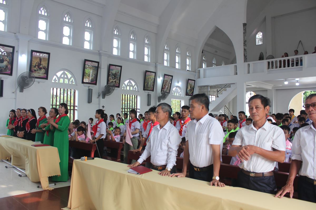 Trước Thánh lễ, cộng đoàn và các em thiếu nhi đã trang nghiêm cử hành nghi thức chào cờ phong trào Thiếu Nhi Thánh Thể.