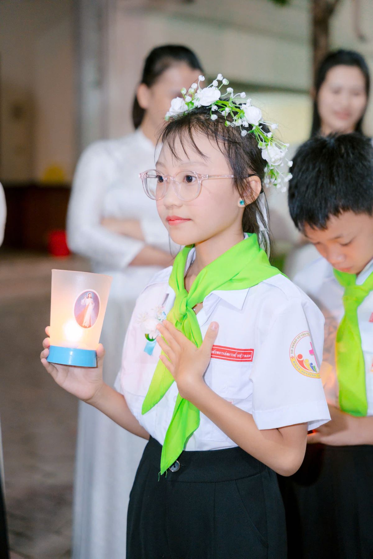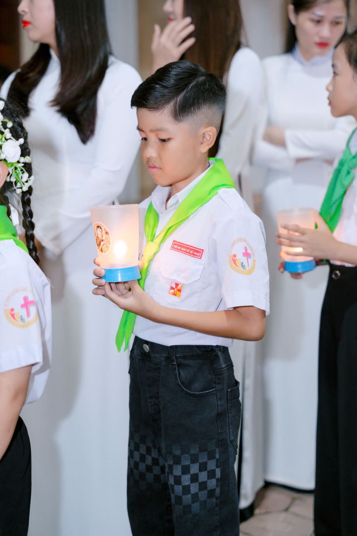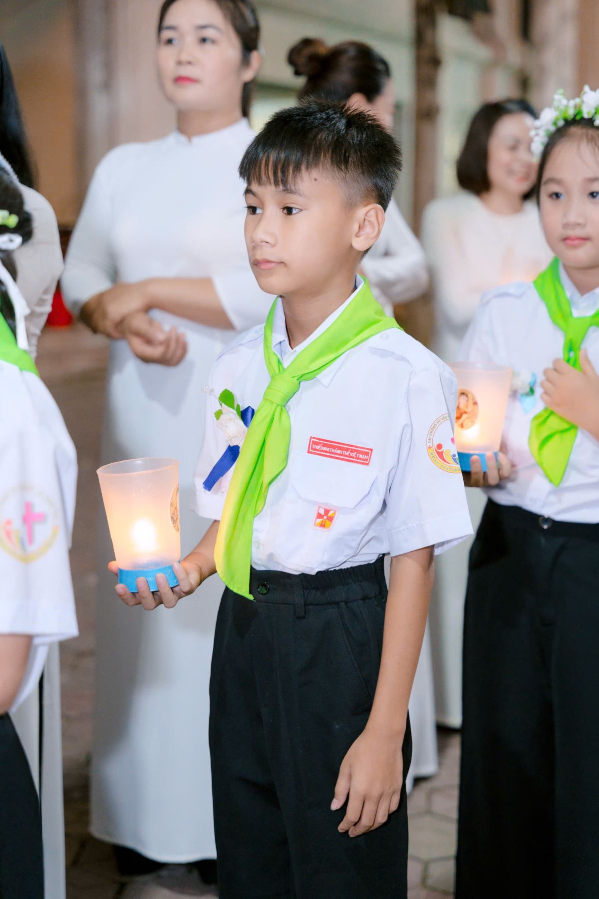 Các em thiếu nhi thành kính tiến dâng lễ vật lên bàn thờ