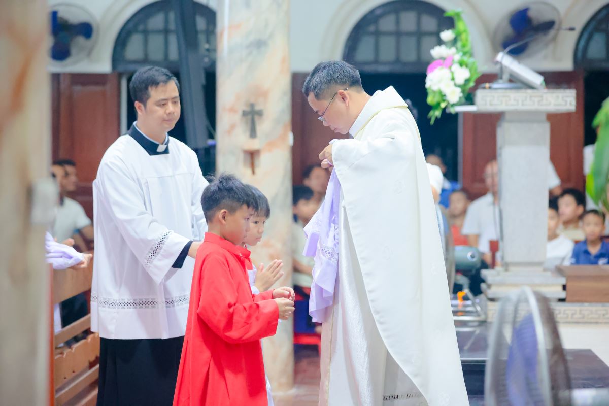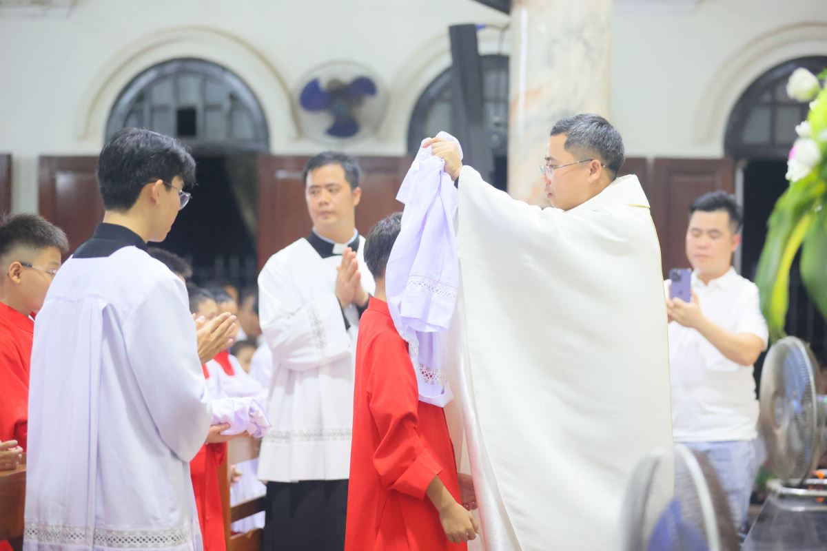Trước khi bước vào Thánh lễ là nghi thức tiếp nhận, làm phép và trao áo lễ sinh cho các em.