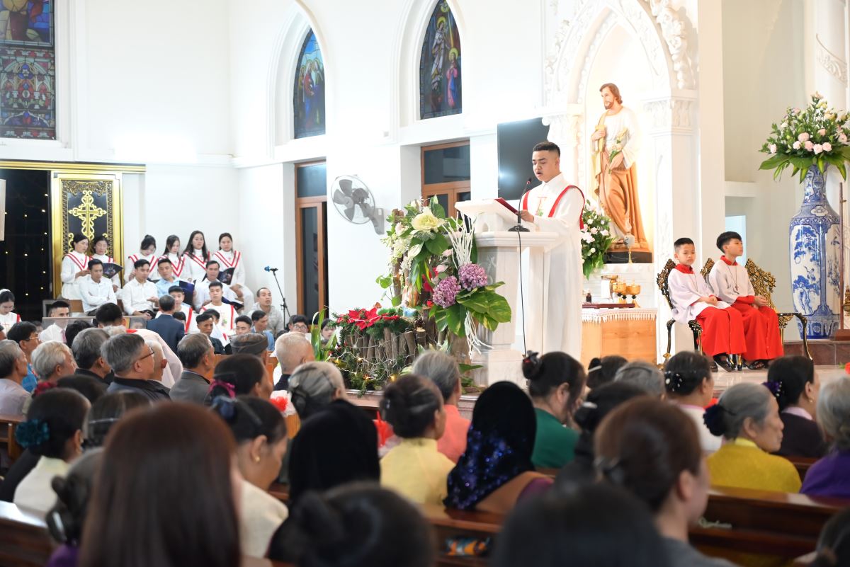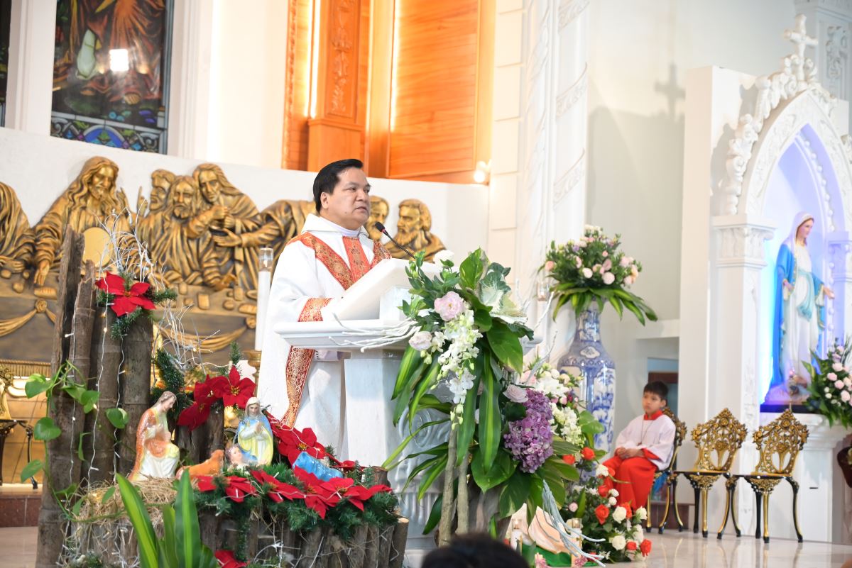 Trong bài giảng, Cha xứ Đaminh đã cho cộng đoàn thấy được niềm vui trong đêm Thánh huyền diệu, niềm vui ấy thật thiêng liêng với ba điểm nhấn “Ánh sáng – Bình an – Hy vọng”. Cha Đaminh chia sẻ, đêm nay mừng Ngôi Hai Thiên Chúa xuống thế làm người là đêm của “Ánh sáng”, “Ánh sáng” ấy không đến từ thế gian mà là từ Thiên Chúa, sức mạnh “Ánh sáng” đến từ quyền năng Thiên Chúa không phải con người. Cha xứ Đaminh cũng khẳng định, đêm Giáng sinh là đêm của “Bình an”, bình an đến từ Hài Nhi Giêsu không cậy dựa vào tiền tài, vật chất mà bình an thực sự là trở về bên Thiên Chúa, bình an từ chính tâm mỗi mỗi qua qua việc để Chúa bước vào và hướng dẫn cuộc đời mỗi người. Đêm Chúa xuống thế làm người cũng là đêm của “Hy vọng”, hy vọng vào Thiên Chúa sẽ không bao giờ làm ta thất vọng.