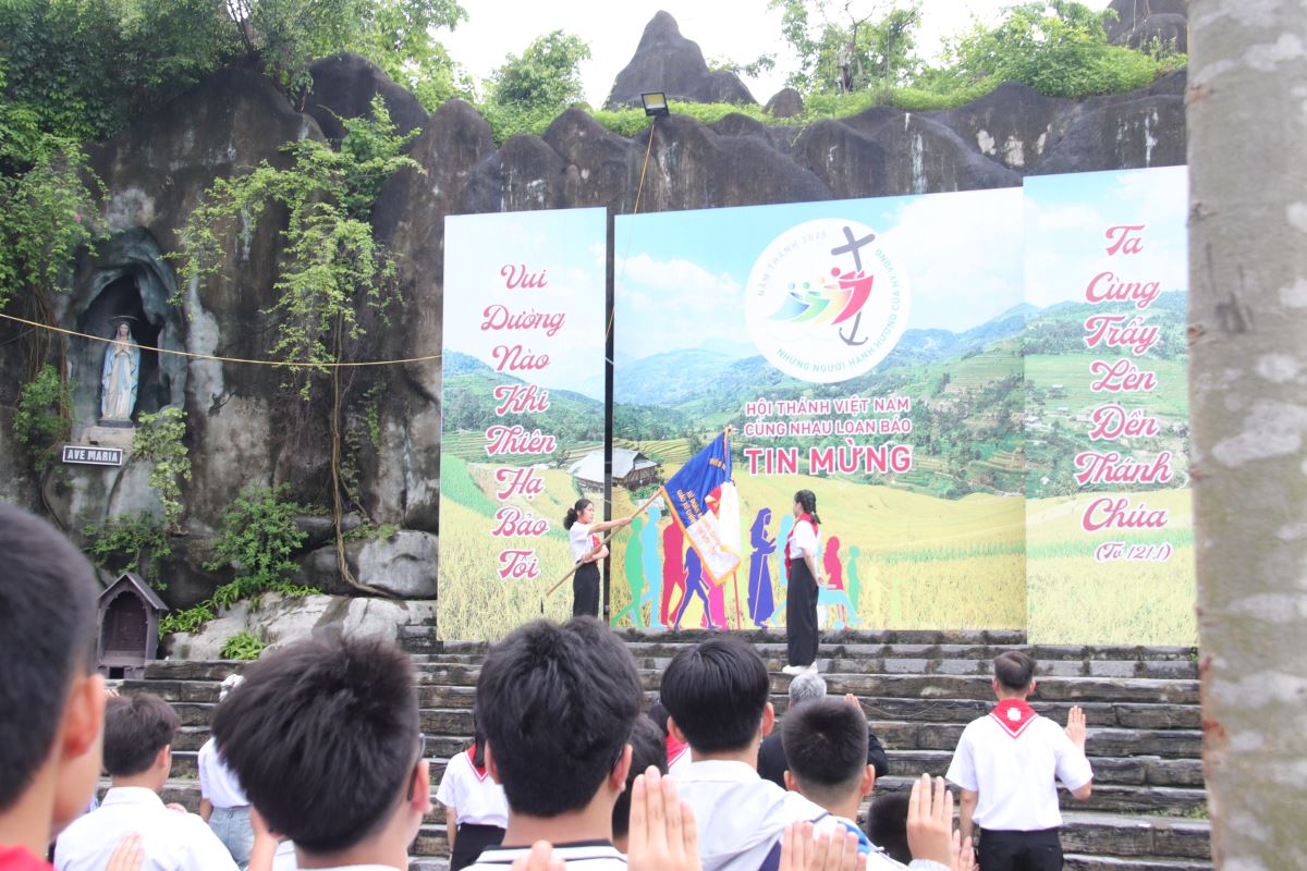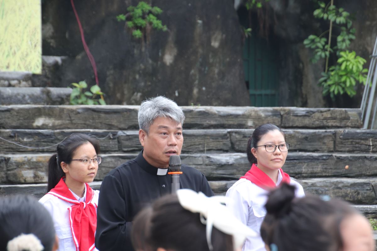 Sau đó, thầy xứ Phaolô công bố chủ đề chính của ngày hội: “Thiếu nhi tiến bước – Hy vọng nở hoa”, khơi gợi tinh thần hăng hái, đoàn kết và vui tươi cho các em trong suốt chương trình.