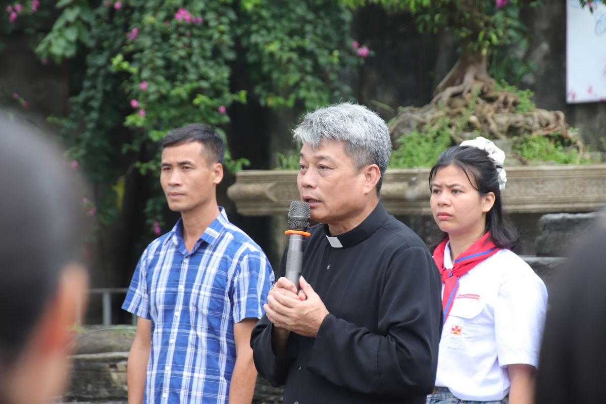 Phần chào cờ trang nghiêm diễn ra với sự hiện diện của cha xứ Giuse Nguyễn Đình Tuyến, thầy xứ Phaolô Cao Đức Toàn, quý dì trợ úy và các em thiếu nhi.