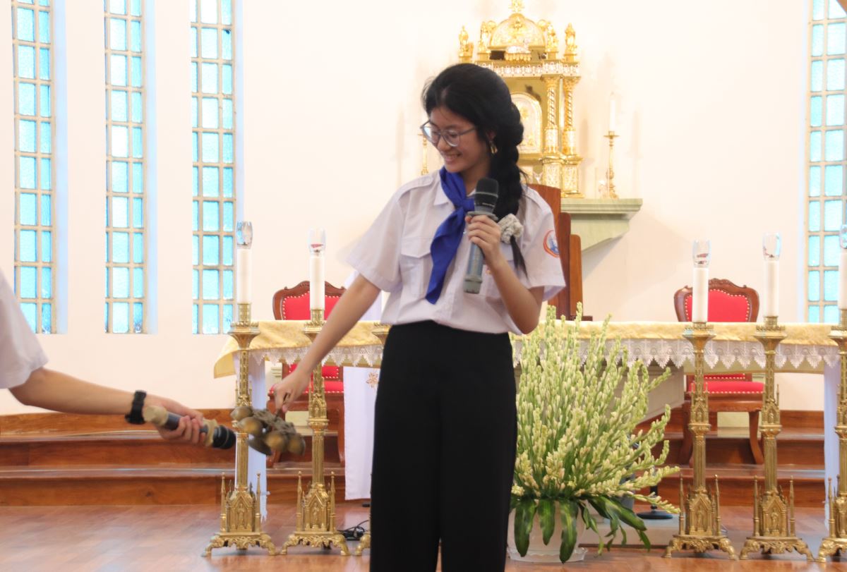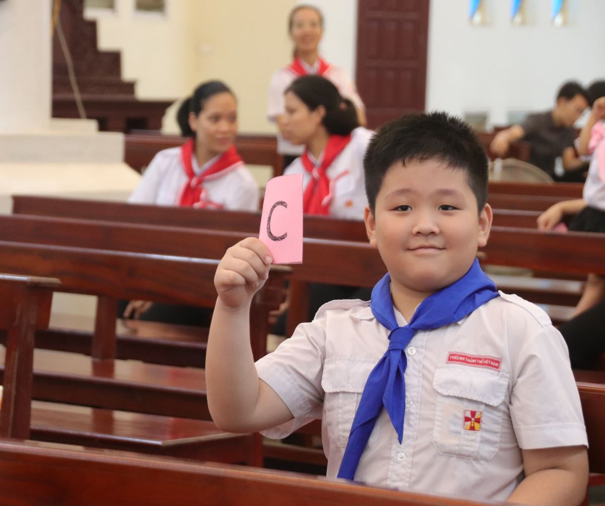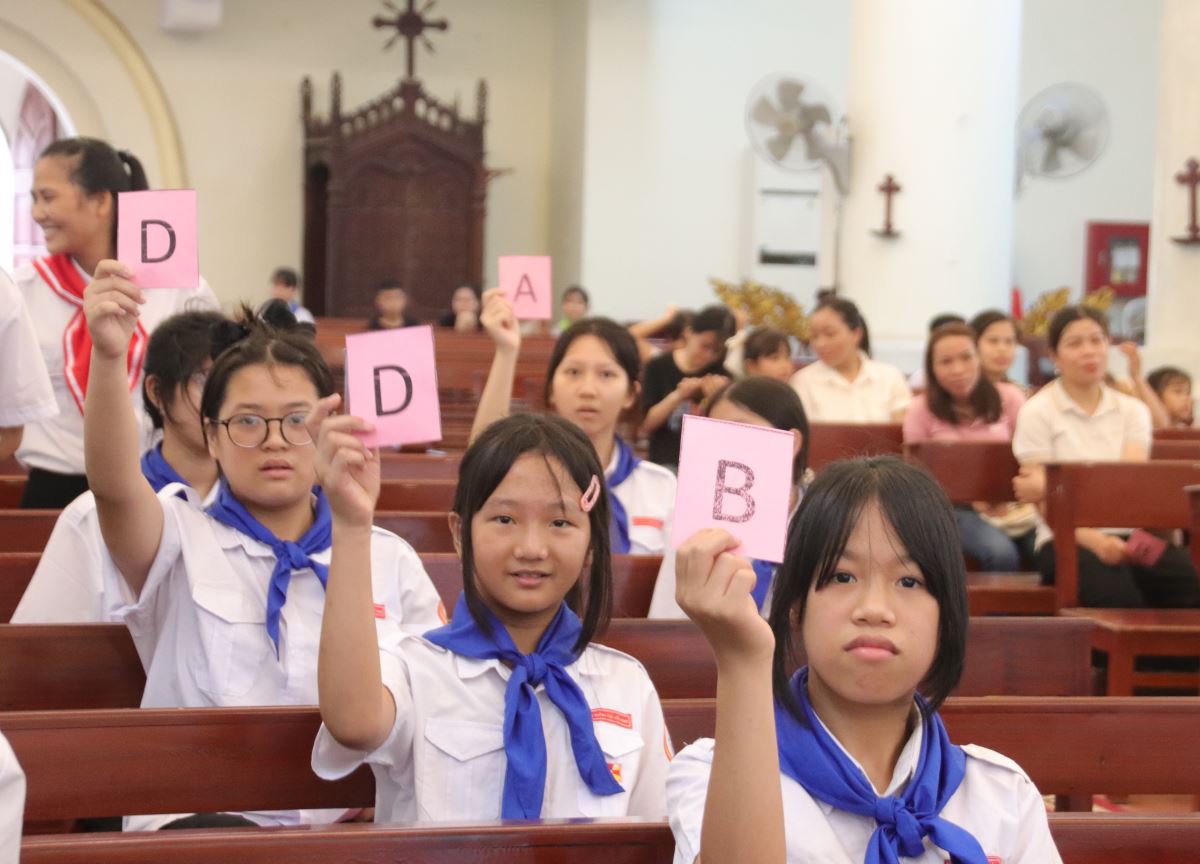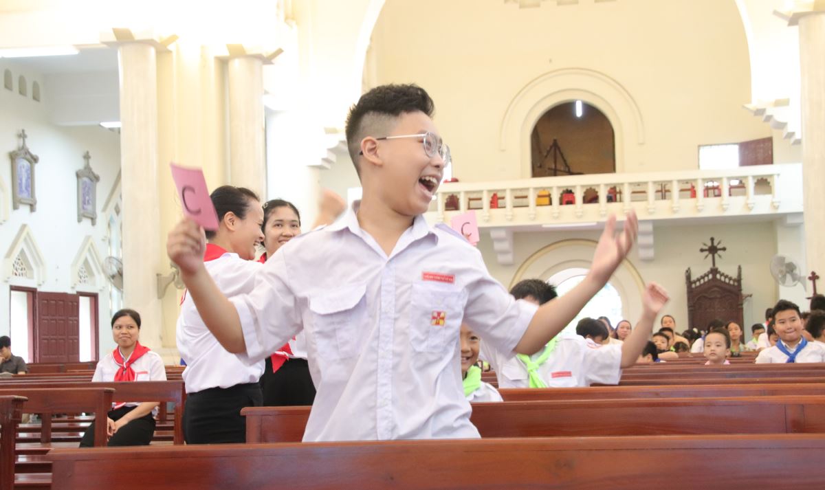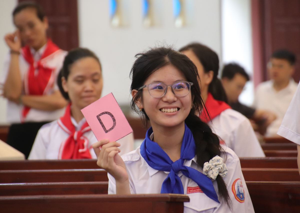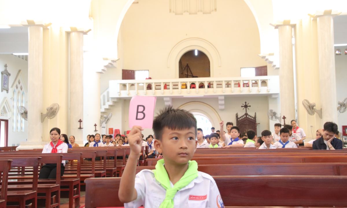 Tiếp theo, các em bước vào phần thi “Rung chuông vàng” tại nhà thờ với không khí thi đua sôi nổi. Trải qua các câu hỏi đầy kịch tính, vượt qua các đối thủ, bạn Maria Hoàng Thanh Ngọc – thiếu nhi thuộc giáo họ Kim Sơn – đã xuất sắc trả lời đúng đến phút cuối cùng và vinh dự rung chuông vàng, nhận phần thưởng đặc biệt từ ban tổ chức.