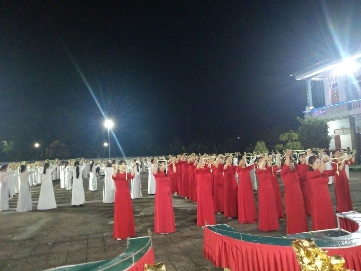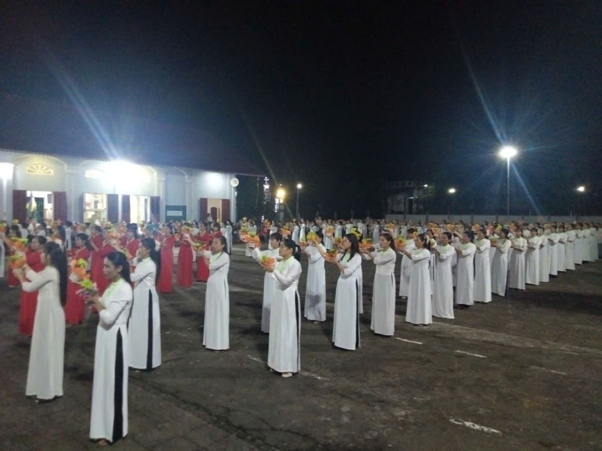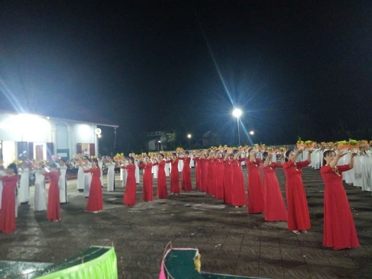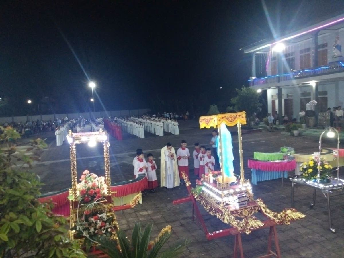 Đúng 18g00, tiếng chuông, tiếng trống vang lên rộn rã, thôi thúc và mời gọi mọi người cùng quy tụ. Trong bầu khí hân hoan thánh thiện, vừa trang nghiêm vừa sốt sắng, đoàn rước với sự hiện diện của cha xứ Giuse Dương Đắc Tiến, các hội đoàn, cùng 140 chị em Hiền Mẫu trong đội hoa giáo xứ và đông đảo cộng đoàn dân Chúa trong và ngoài giáo xứ.