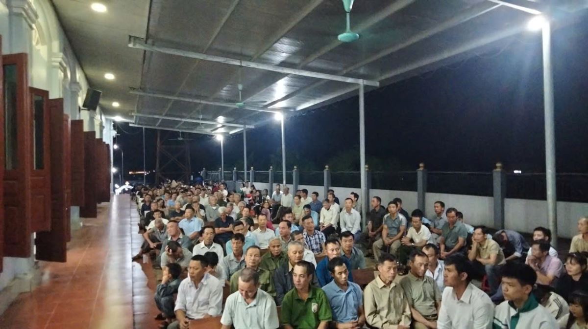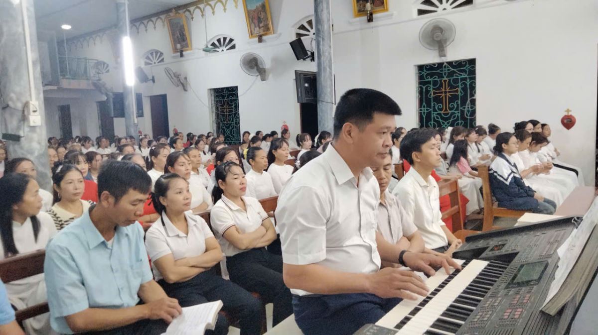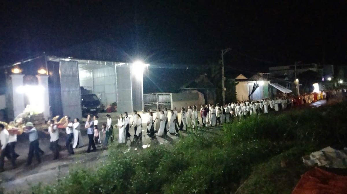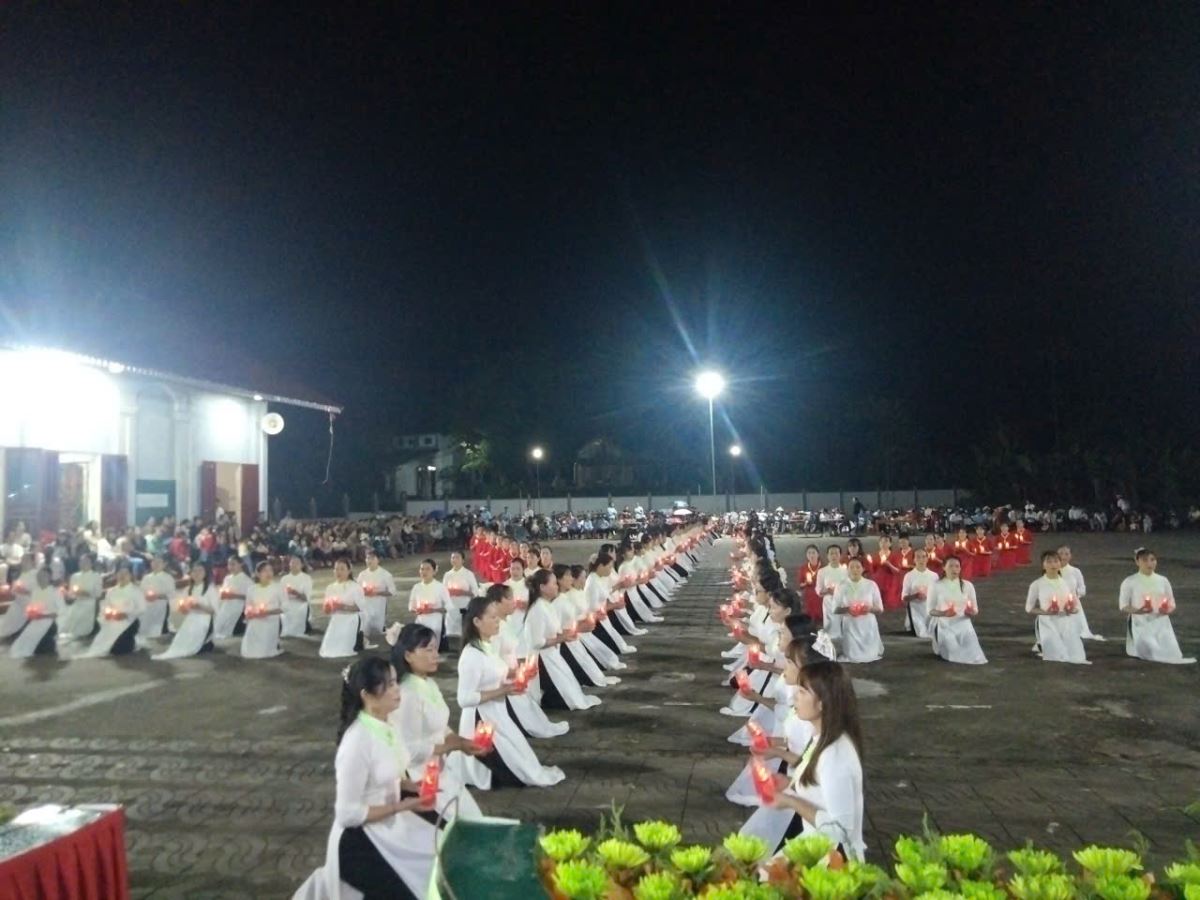 Đúng 18g00, tiếng chuông, tiếng trống vang lên rộn rã, thôi thúc và mời gọi mọi người cùng quy tụ. Trong bầu khí hân hoan thánh thiện, vừa trang nghiêm vừa sốt sắng, đoàn rước với sự hiện diện của cha xứ Giuse Dương Đắc Tiến, các hội đoàn, cùng 140 chị em Hiền Mẫu trong đội hoa giáo xứ và đông đảo cộng đoàn dân Chúa trong và ngoài giáo xứ.