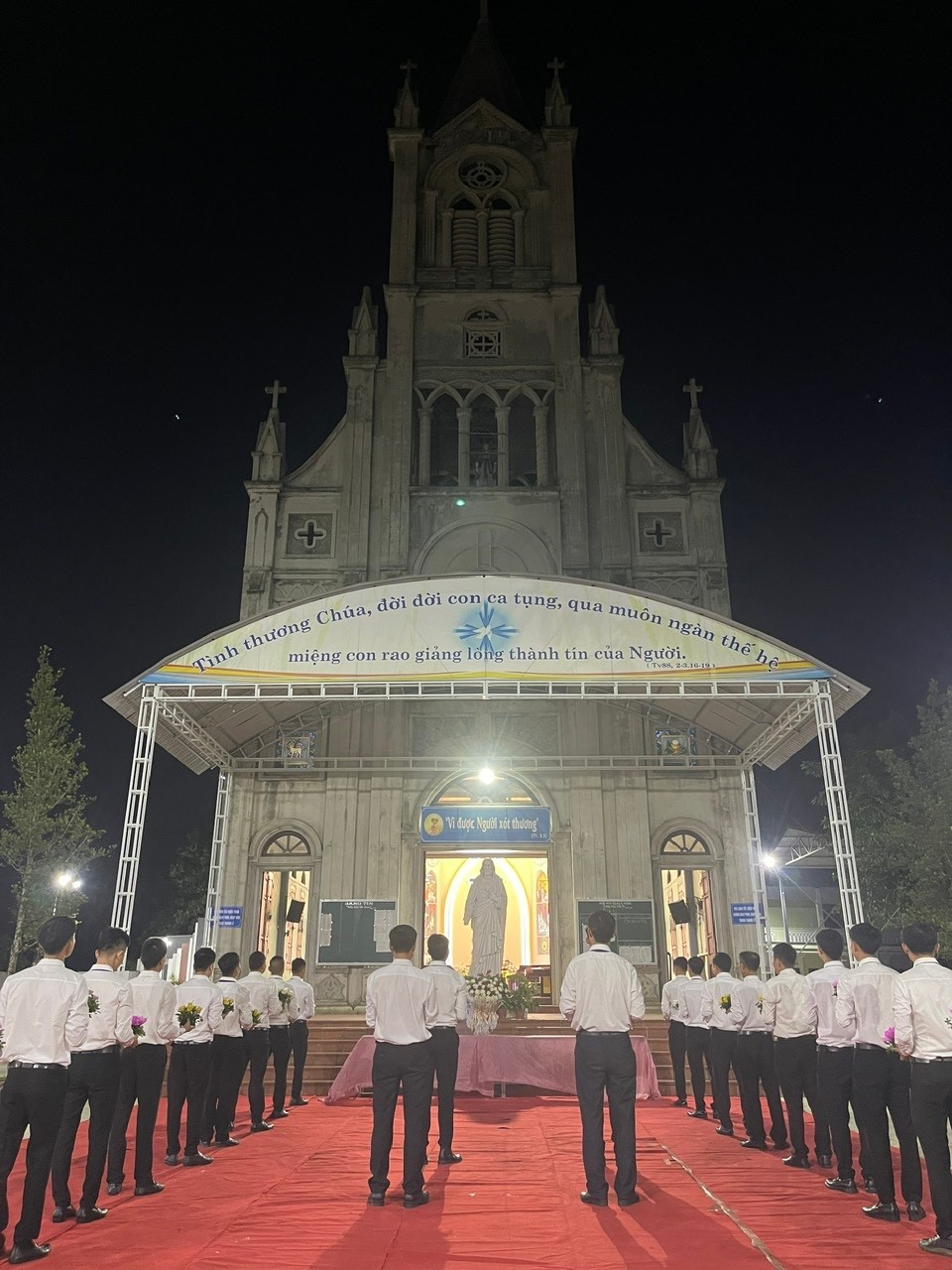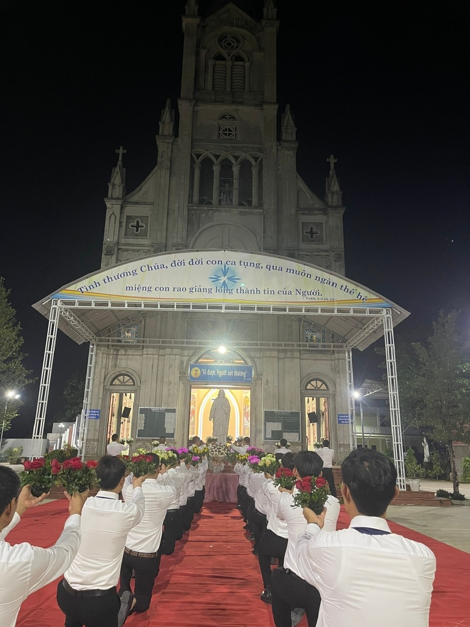 Đúng 19g00, trong tiếng nhạc trầm lắng, đội dâng hoa gồm các ông trong ban gia trưởng đã trang nghiêm tiến bước. Những động tác uyển chuyển, từng cử điệu trang trọng hòa trong tiếng hát sống động của các ca viên diễn tả lòng thành kính, niềm tin yêu mà cộng đoàn giáo xứ muốn dâng lên Thánh Tâm Chúa.