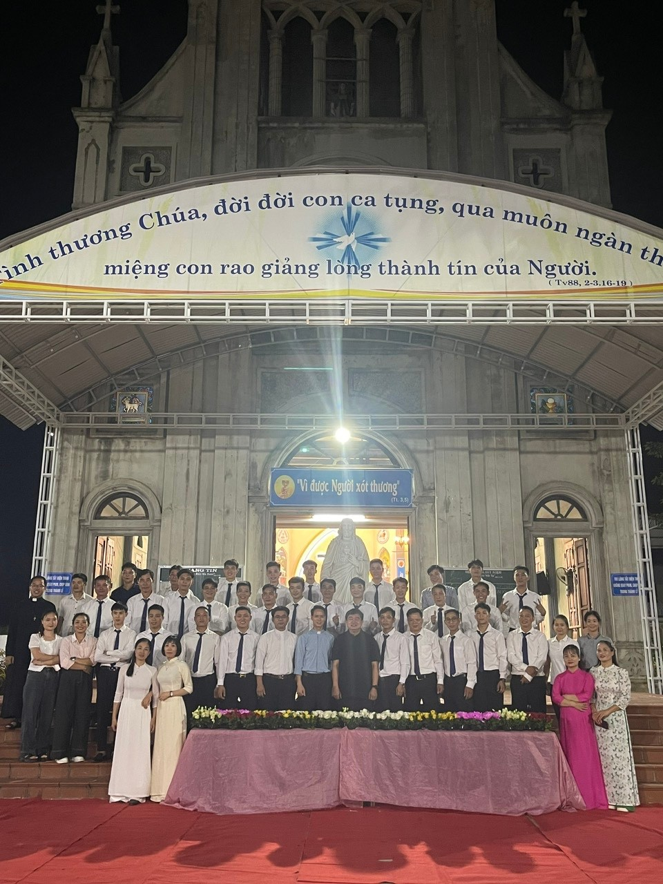 WGPHH – Chúa Nhật Mình Máu Thánh đã khép lại, nhưng ngọn lửa yêu mến nơi trái tim người tín hữu vẫn tiếp tục cháy sáng qua những ngày tôn kính Thánh Tâm Chúa Giêsu. Trong tâm tình đó, tối ngày 23/6/2025, giáo xứ Đồn Vàng đã long trọng tổ chức buổi dâng hoa và Thánh lễ tôn kính Thánh Tâm Chúa.