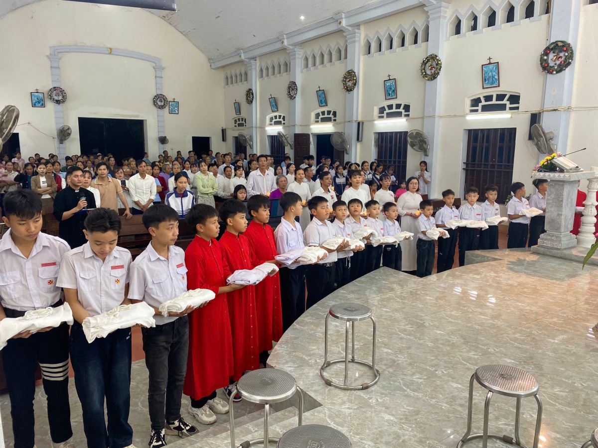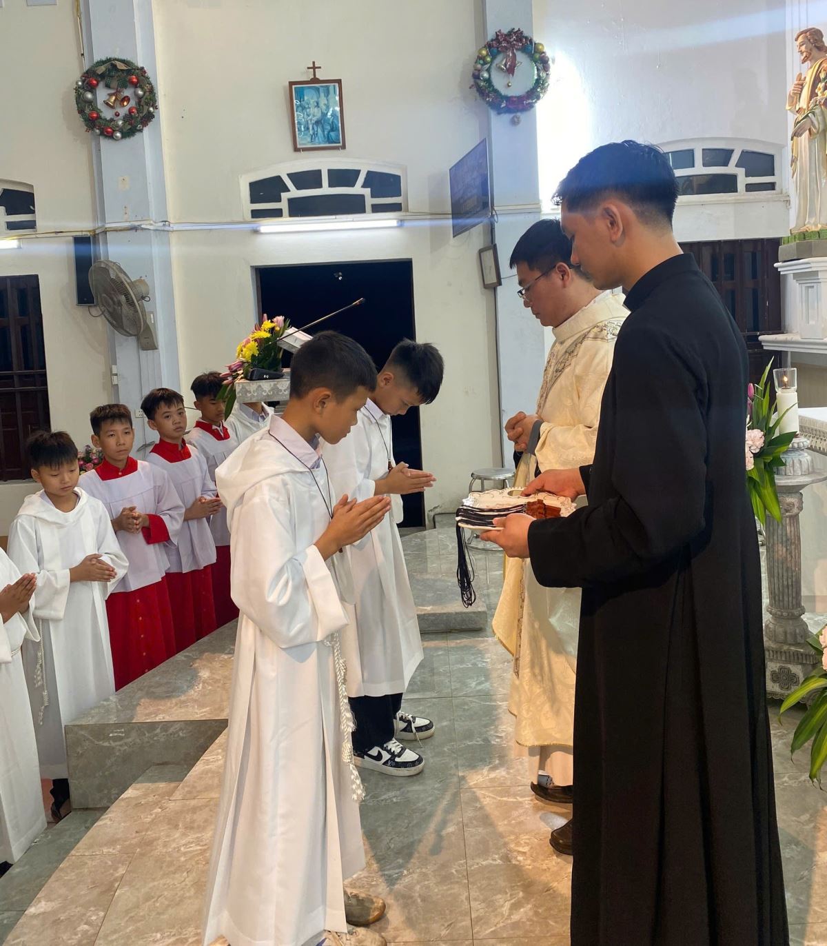 Trong bầu khí trang nghiêm và sốt sắng, cha xứ Phêrô Phan Văn Vẻ chủ sự nghi thức tiếp nhận. Các em, trong bộ lễ phục trắng tinh như lời nguyện thầm dâng lên Thiên Chúa: “Xin cho con được nên tinh tuyền và trung thành khi phục vụ Chúa.”