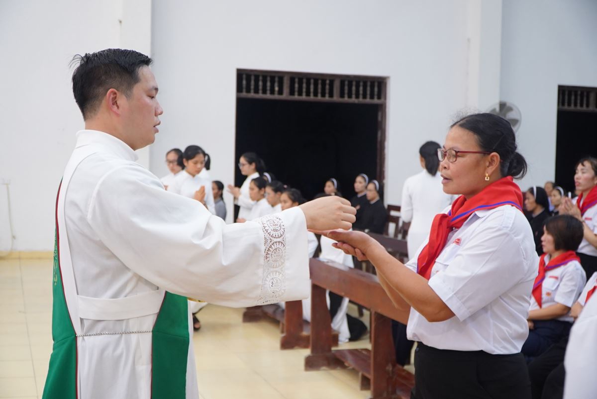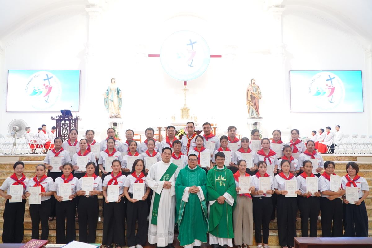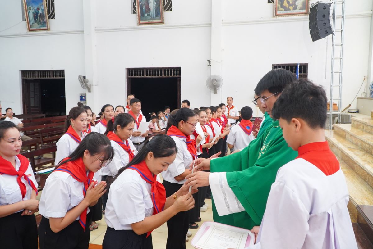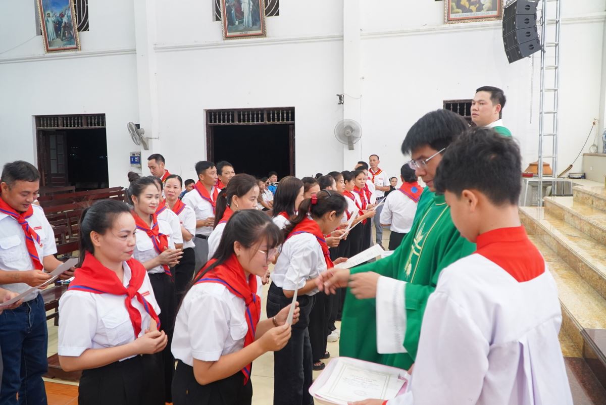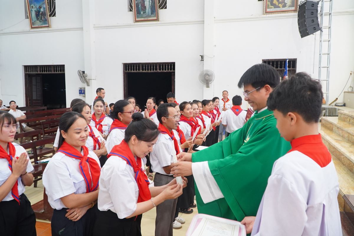 Từng người lãnh nhận nghi thức đặt tay chúc lành của quý Cha, rồi trang nghiêm tiến lên nhận khăn Trợ tá và chứng chỉ giáo lý viên cấp I. Từ giây phút ấy, họ chính thức trở thành những tân giáo lý viên – những “người thợ gặt” mới được sai đi vào cánh đồng truyền giáo nơi quê hương mình.