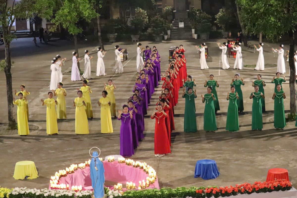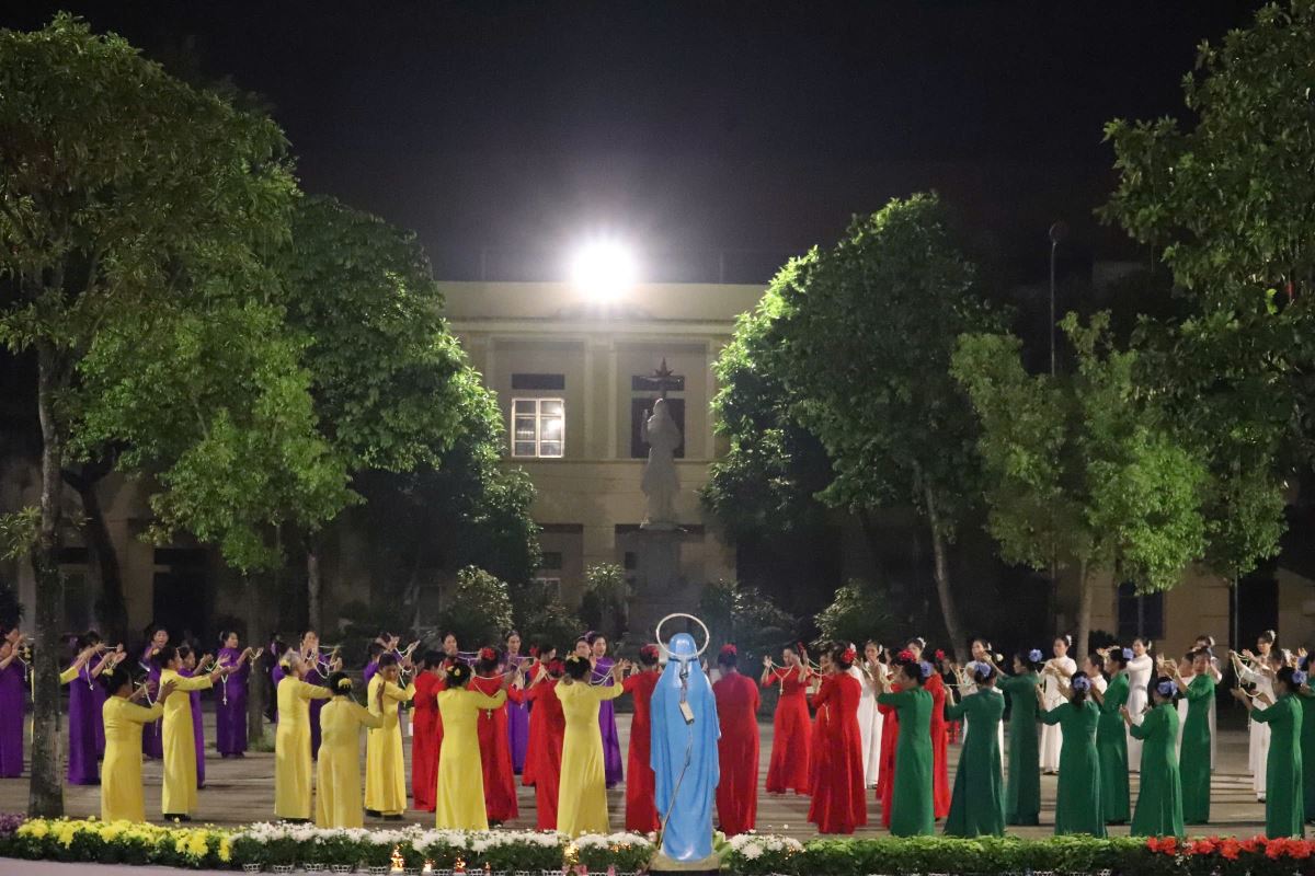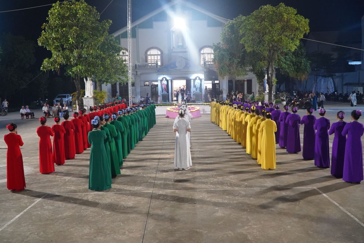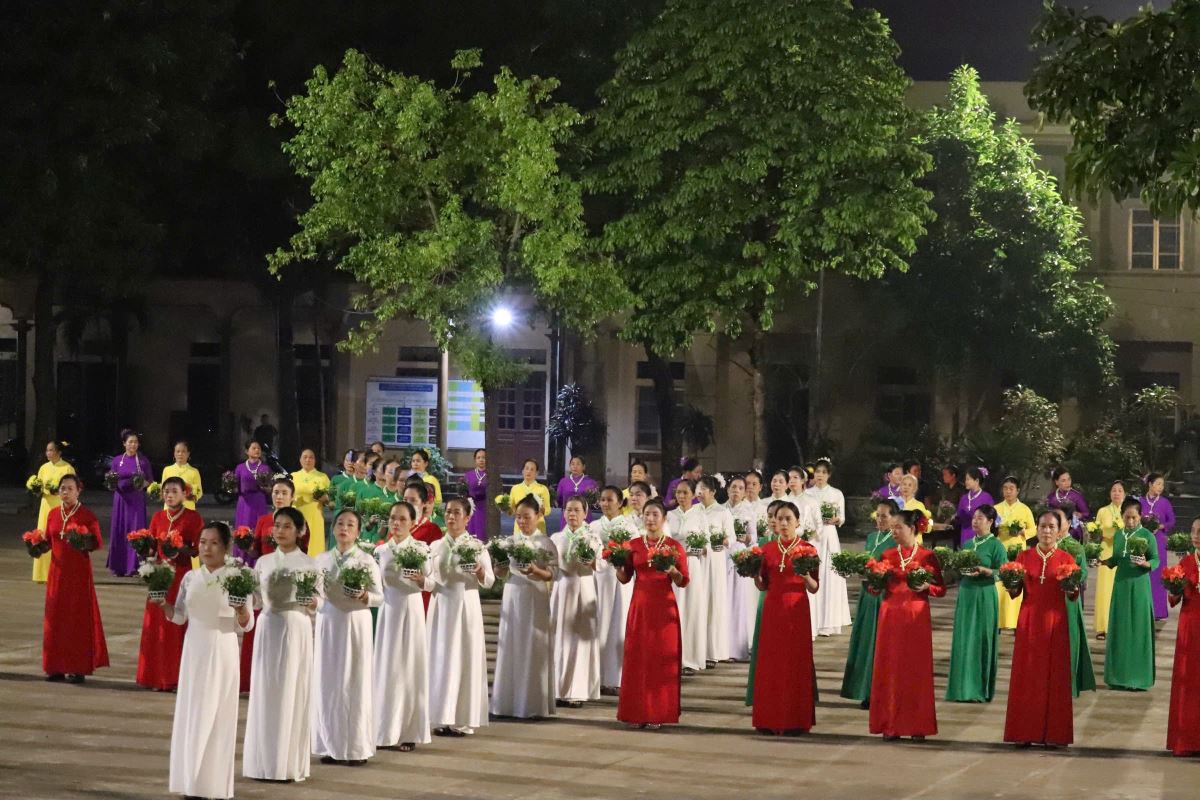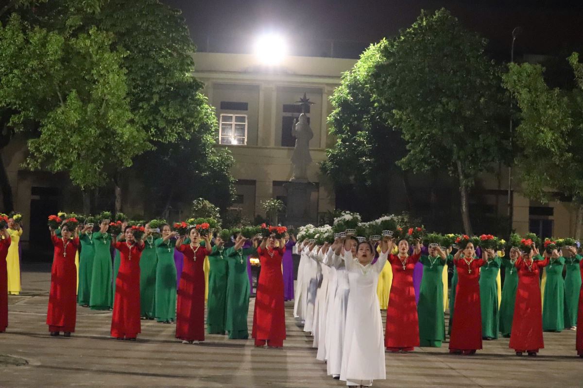 Trong bầu khí linh thiêng và trang trọng, vào lúc 19g15 tại sân quảng trường giáo xứ Hoàng Xá, 100 hoa viên là các bà, các chị đến từ giáo xứ Hoàng Xá cùng các chuẩn xứ Ba Đông, Tiền Phong và Minh Xuân đã cùng đồng diễn dâng hoa Kính Đức Mẹ.