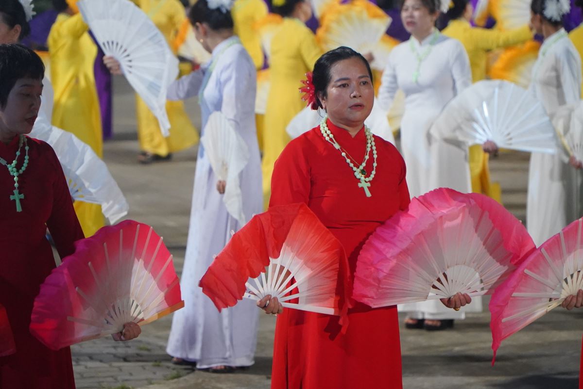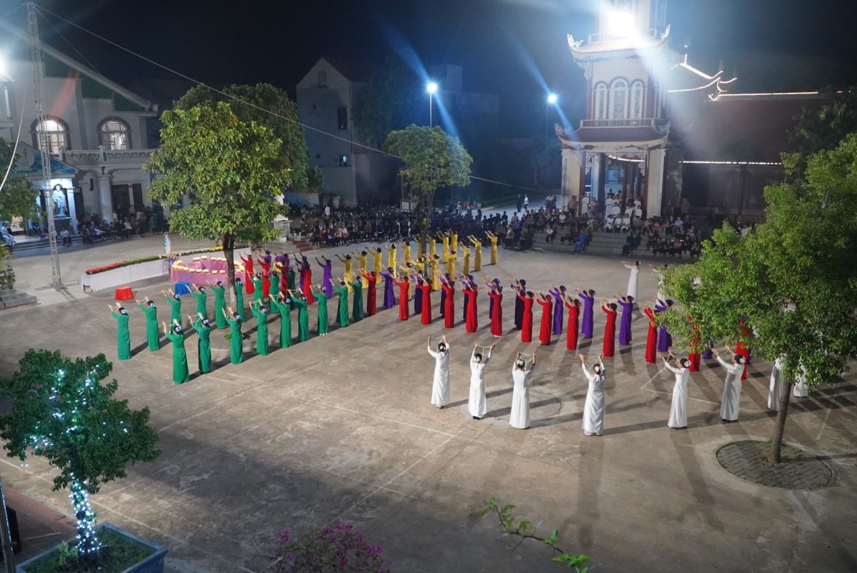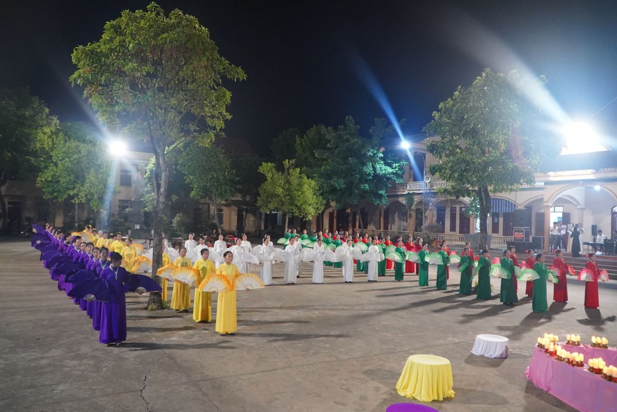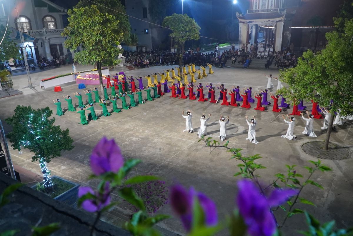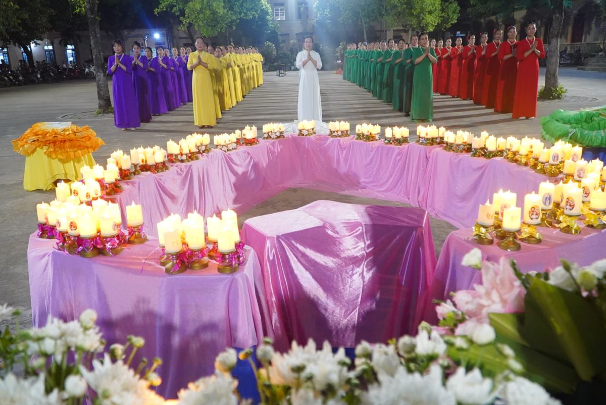 Trong bầu khí linh thiêng và trang trọng, vào lúc 19g15 tại sân quảng trường giáo xứ Hoàng Xá, 100 hoa viên là các bà, các chị đến từ giáo xứ Hoàng Xá cùng các chuẩn xứ Ba Đông, Tiền Phong và Minh Xuân đã cùng đồng diễn dâng hoa Kính Đức Mẹ.