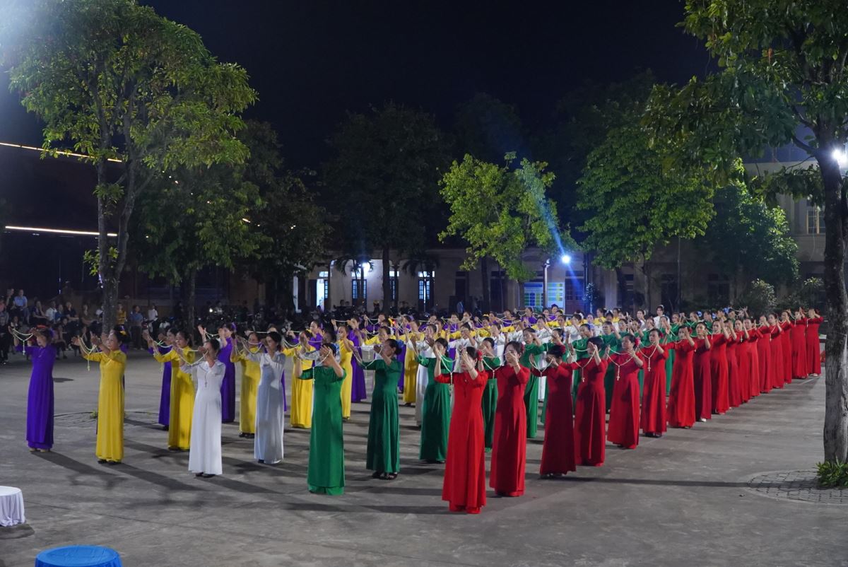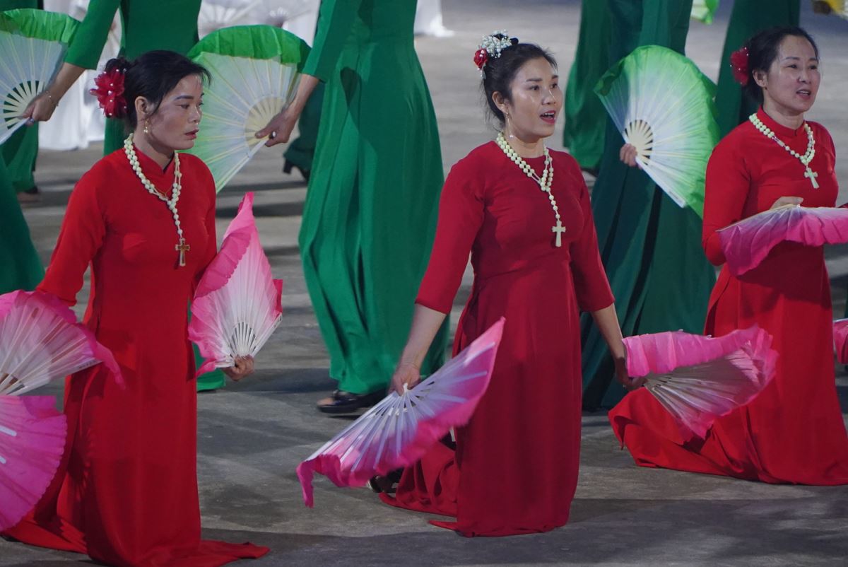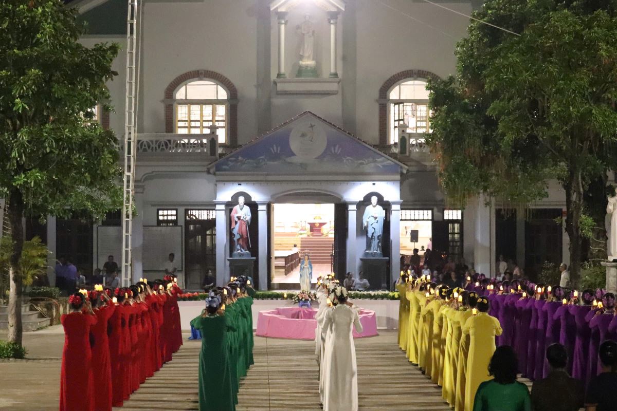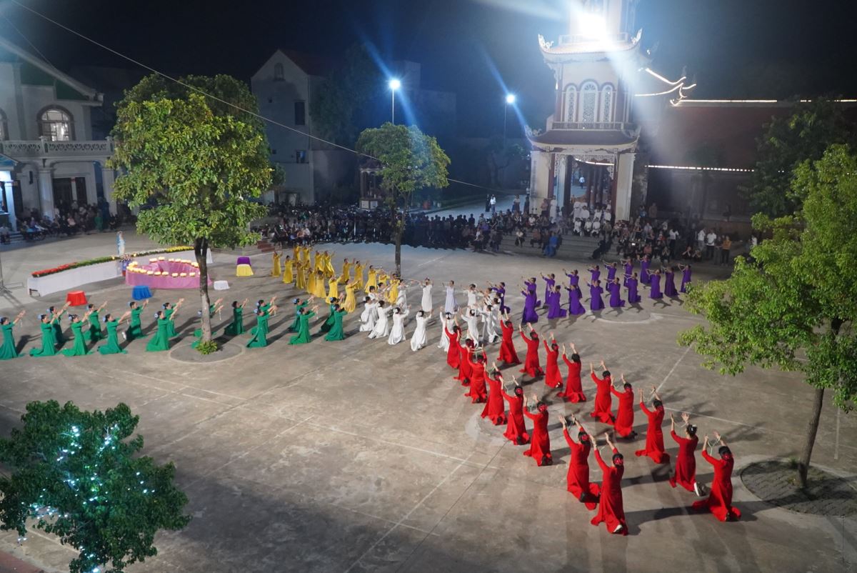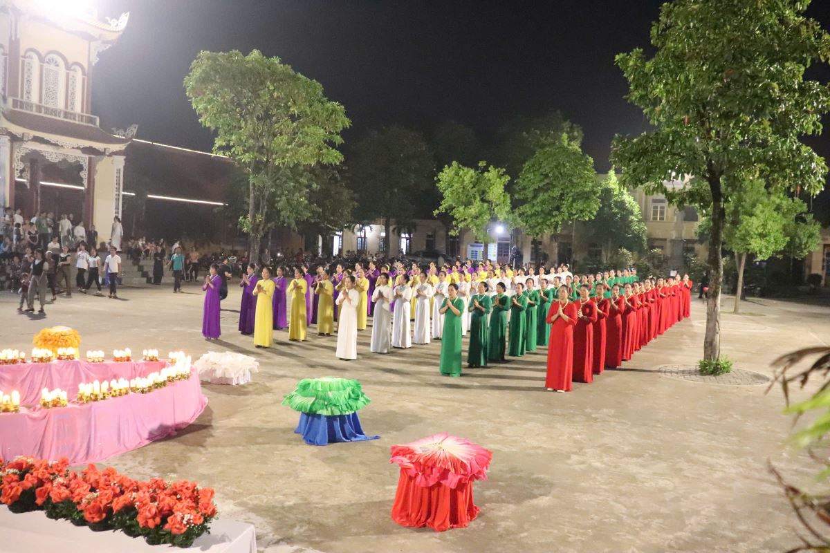 Trong bầu khí linh thiêng và trang trọng, vào lúc 19g15 tại sân quảng trường giáo xứ Hoàng Xá, 100 hoa viên là các bà, các chị đến từ giáo xứ Hoàng Xá cùng các chuẩn xứ Ba Đông, Tiền Phong và Minh Xuân đã cùng đồng diễn dâng hoa Kính Đức Mẹ.
