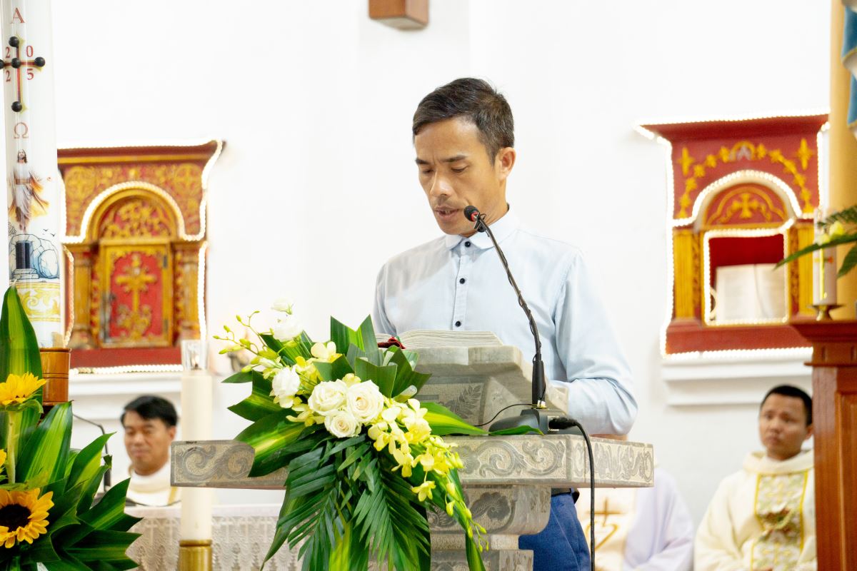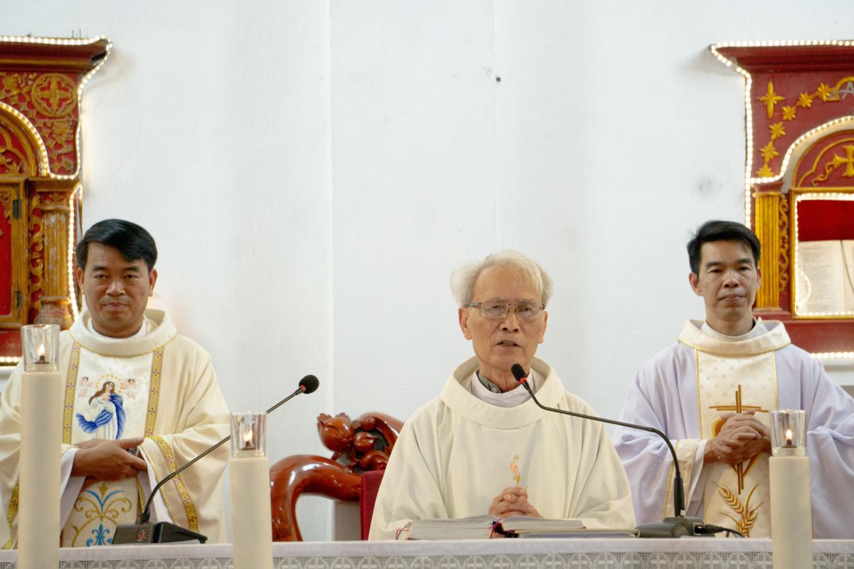 Cha Giuse Đỗ Văn Khuê giảng lễ. Khởi đi từ Bài Tin Mừng theo thánh Gioan, cha chia sẻ về phép lạ hóa bánh ra nhiều, nhấn mạnh hình ảnh Chúa Giêsu là một vị Thầy tinh tế, gần gũi và đầy lòng thương xót, luôn lo lắng cả phần hồn lẫn phần xác cho dân. Cha khích lệ cộng đoàn: