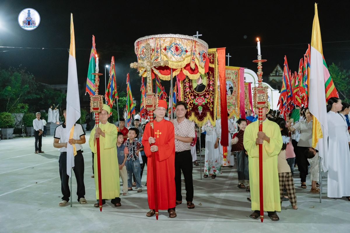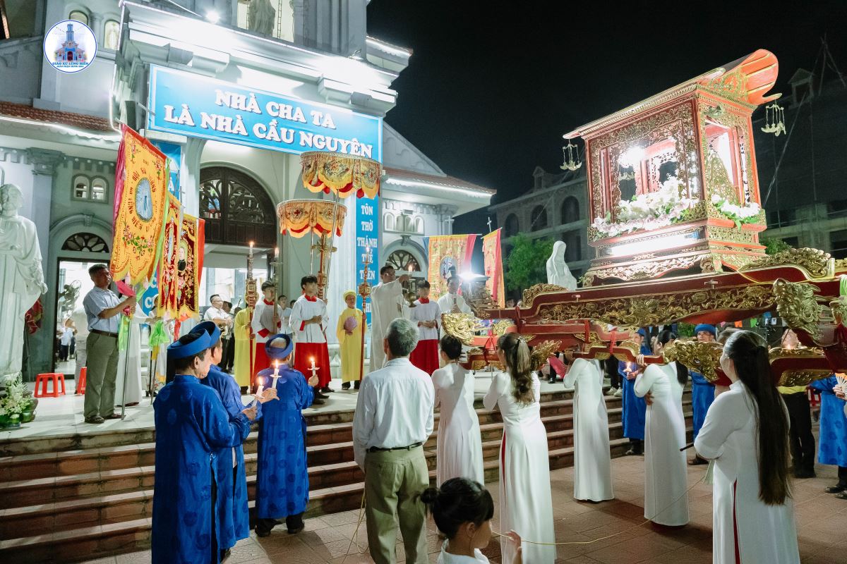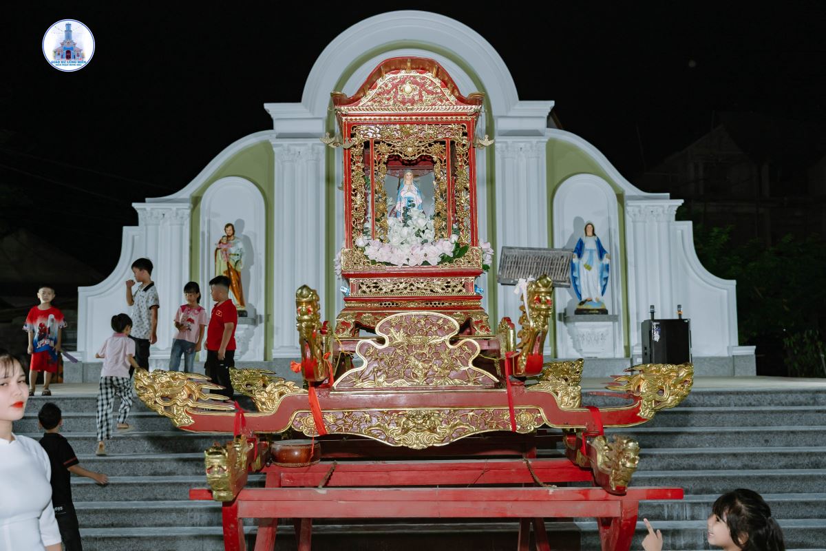 Sau nghi thức làm phép tượng là cuộc rước kiệu Đức Mẹ quanh nhà xứ. Đi đầu đoàn rước là đội trống, sau là hội Bát âm, tiếp là Thánh giá nến cao, quý cộng đoàn Dân Chúa, các hội đoàn giáo xứ, tiếp nữa là Ca đoàn, và cuối cùng là Kiệu Đức Mẹ.