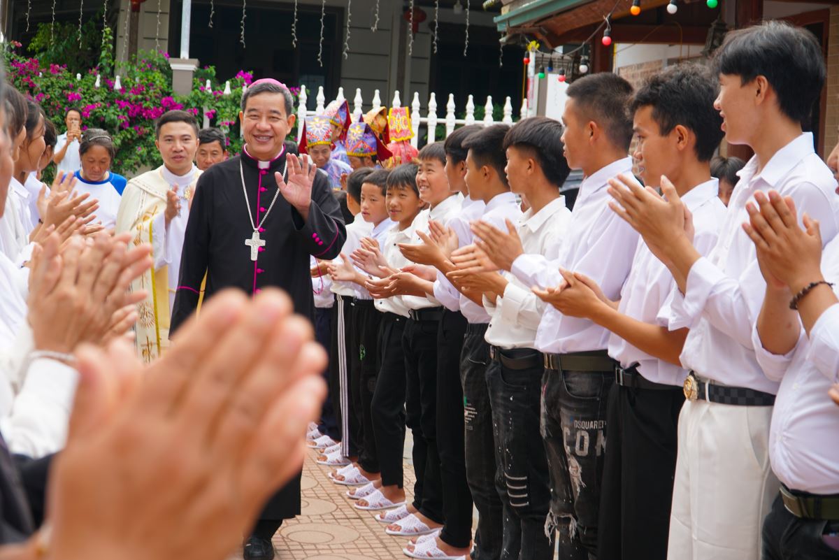 WGPHH - Sáng thứ Hai, ngày 18.8.2025, cộng đoàn Giáo xứ Mai Yên hân hoan chào đón Đức cha Đaminh Hoàng Minh Tiến Giám mục Giáo phận Hưng Hóa về thăm mục vụ và chủ sự Thánh lễ ban Bí tích Thêm Sức cho 65 em thiếu nhi trong Giáo xứ. Đặc biệt, hôm nay còn có 91 anh chị dự tòng được lãnh nhận các bí tích Khai Tâm Kitô giáo.