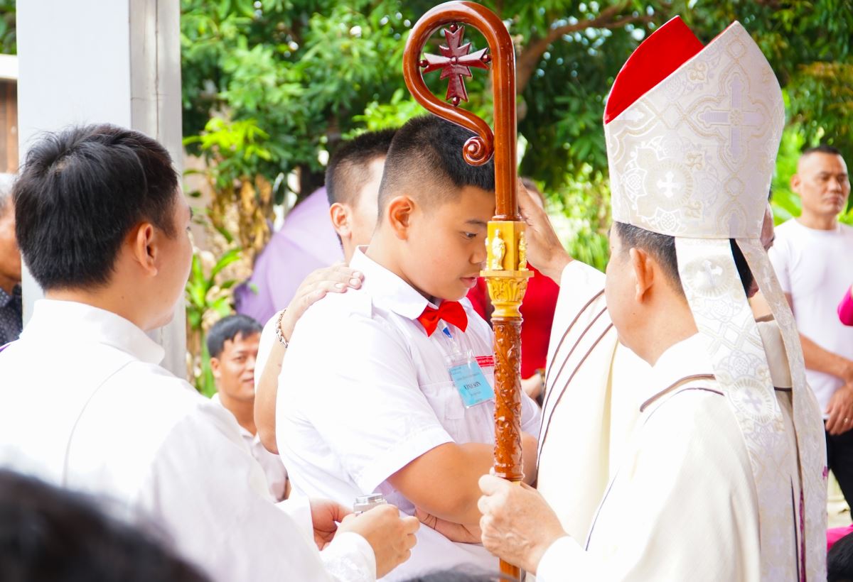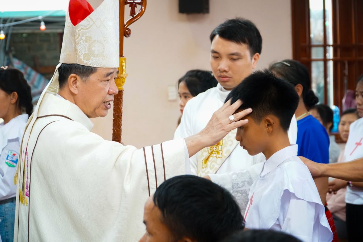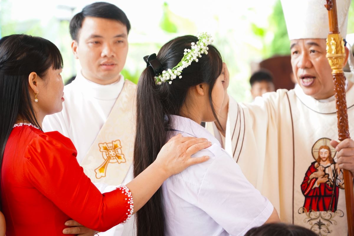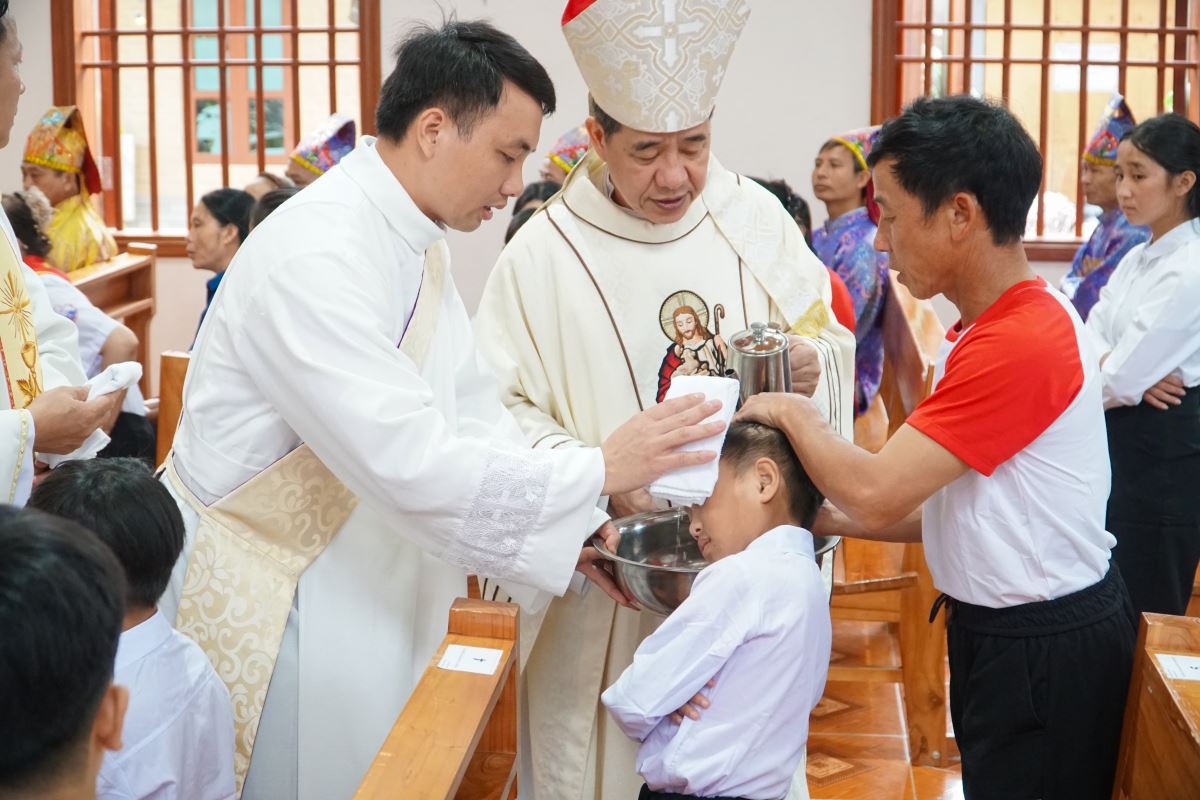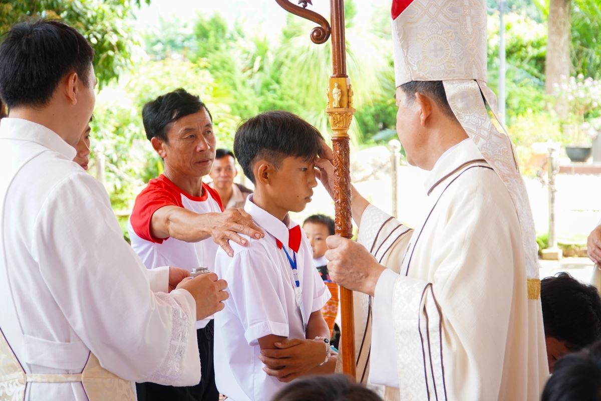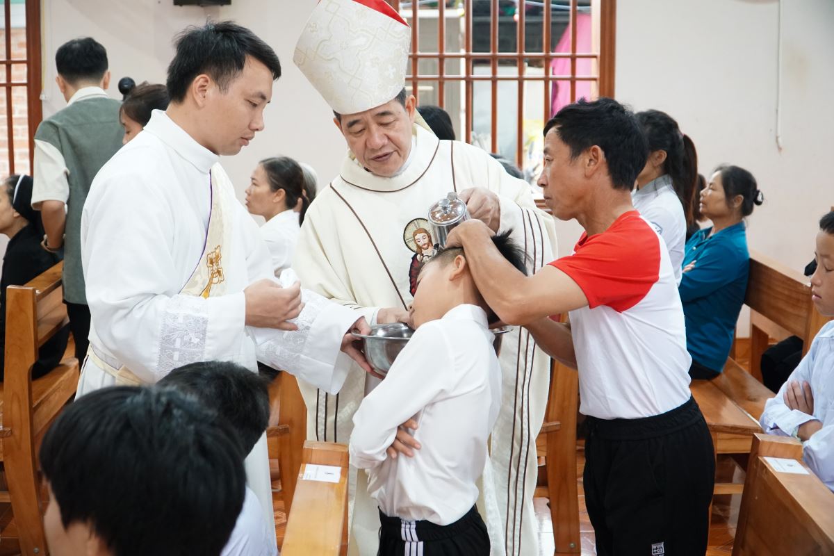 Tiếp đến Đức cha Đaminh chủ sự nghi thức ban Bí tích Thêm Sức cho 65 em thiếu nghi của giáo xứ. Đức cha Đaminh đã đặt tay cầu nguyện và xức Dầu Thánh trên trán các em – dấu chỉ của ơn Chúa Thánh Thần, giúp các em được củng cố đức tin và bền vững hơn trong đời sống Ki-tô hữu.