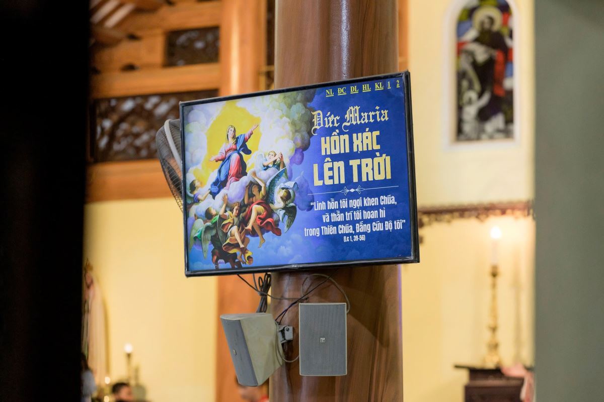 Đúng 19g30, cộng đoàn cùng hiệp dâng thánh lễ trọng mừng kính Đức Maria Hồn Xác Lên Trời do cha Giuse Nguyễn Ngọc Bích chủ tế.