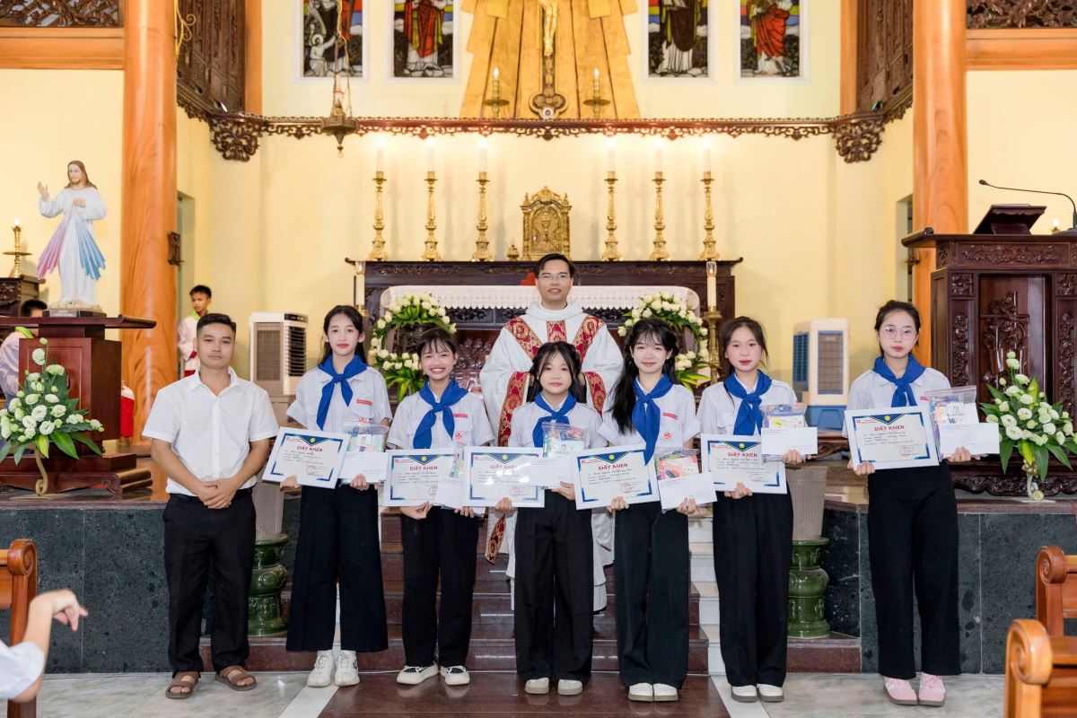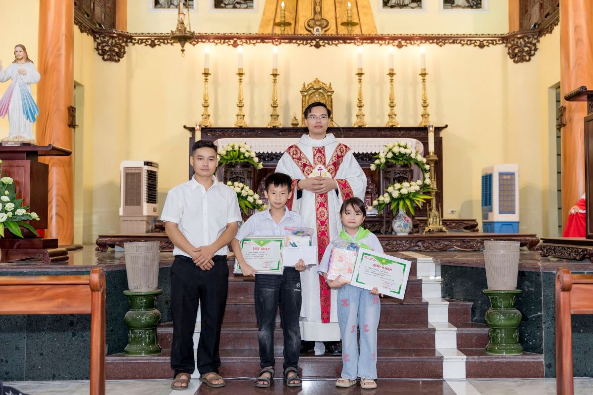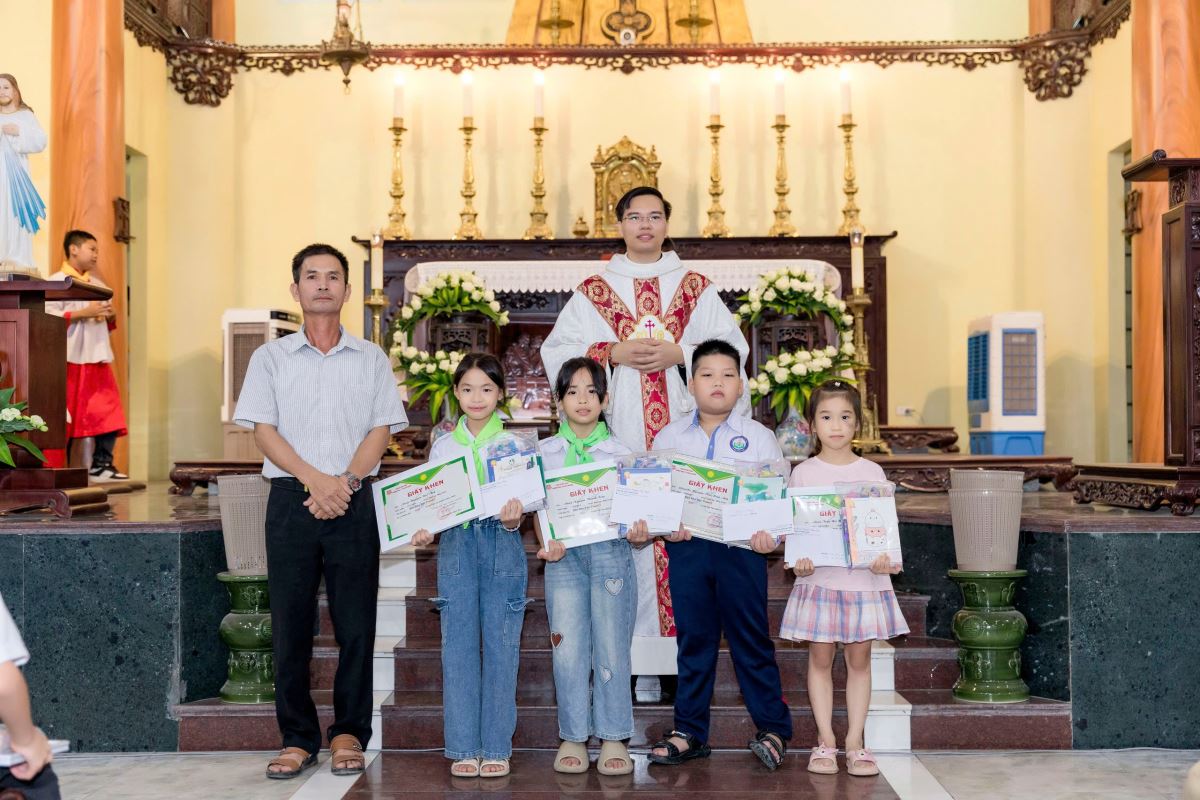 Cuối thánh lễ, giáo xứ trao giấy khen giáo lý và quà thưởng cho các em giáo lý sinh đạt thành tích giỏi và xuất sắc trong năm học 2024 - 2025 vừa qua. Toàn giáo xứ có 32 em đạt loại giỏi và 6 em đạt xuất sắc. Những phần quà này là sự ghi nhận cho nỗ lực và cố gắng của các em trong suốt năm học vừa qua, cũng là sự khích lệ để tất các em giáo lý sinh khác cùng cố gắng trong năm học giáo lý tới đây.