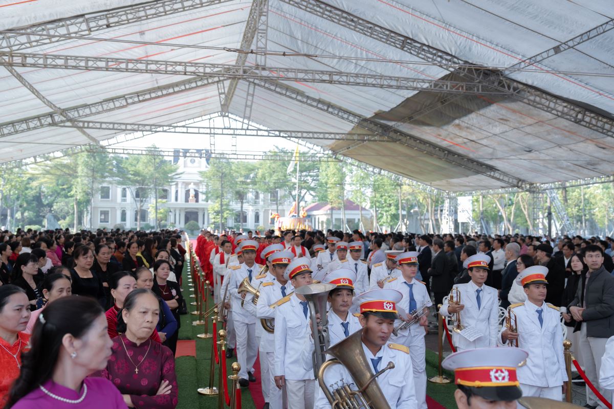 Đúng 9g00, đoàn đồng tế tiến vào lễ đài trong tiếng kèn trống rộn rã.