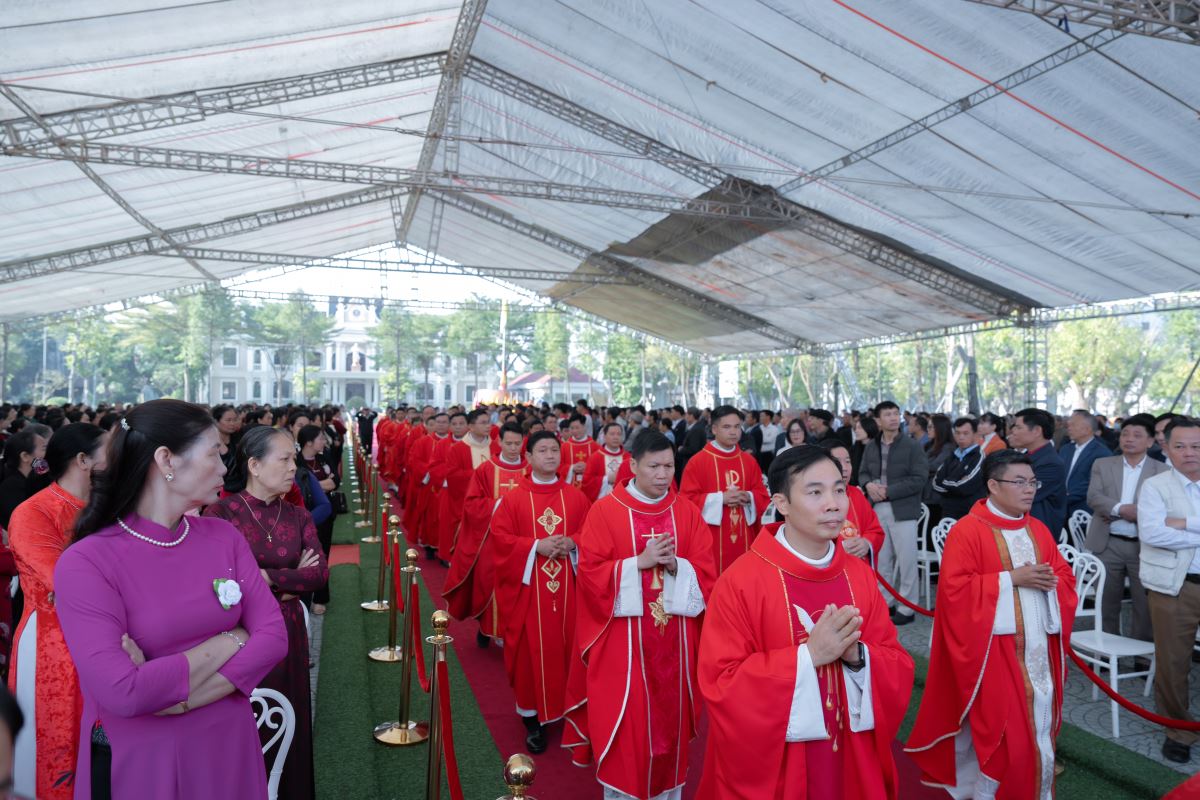 Kết thúc nghi thức, Đức cha và quý cha tiến về nhà mục vụ để chuẩn bị phẩm phục cho Thánh lễ.