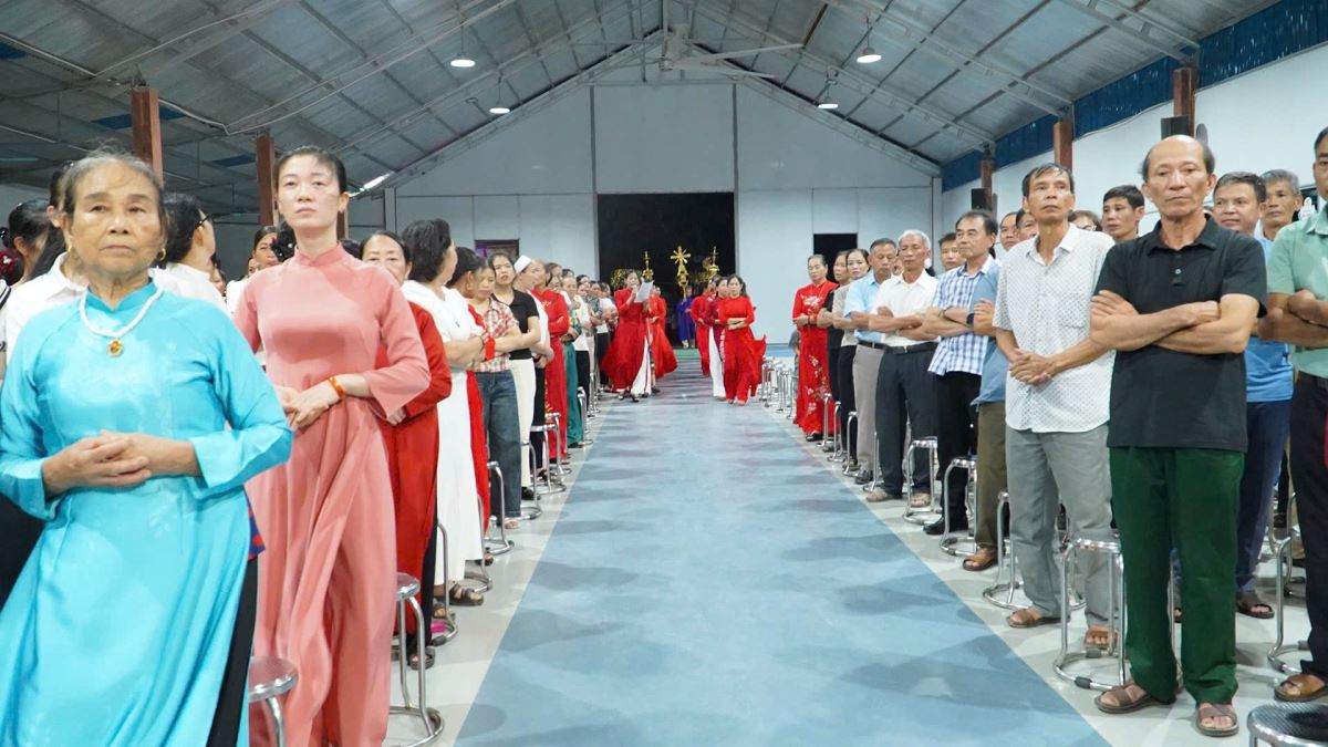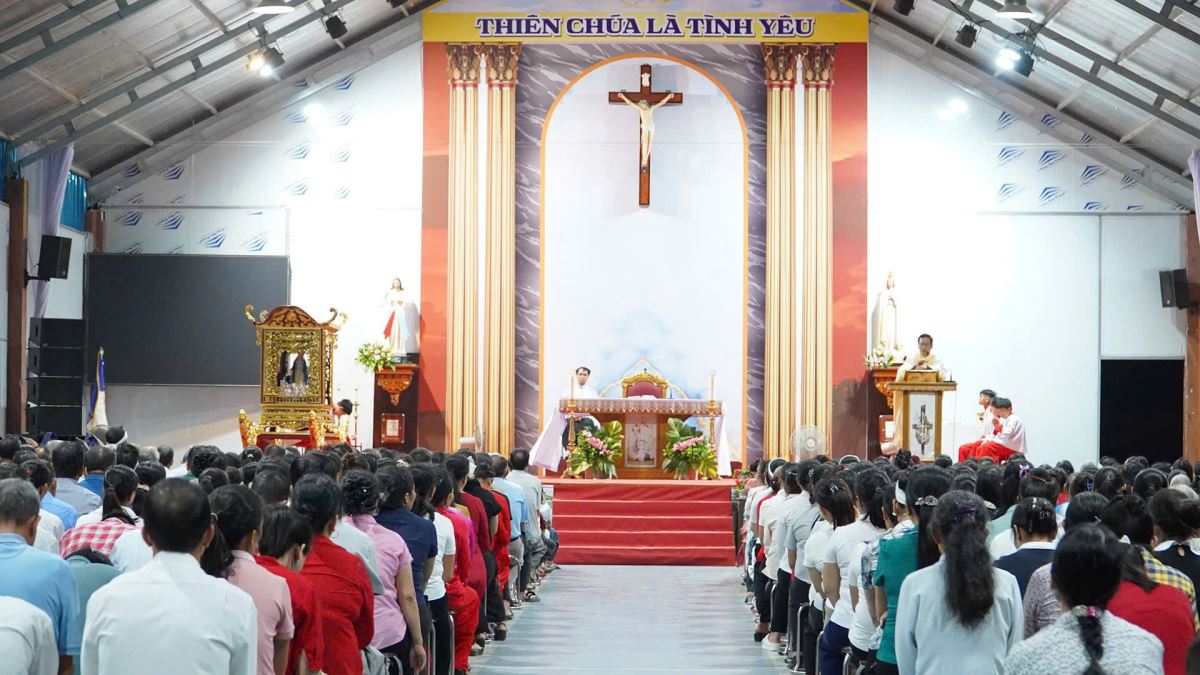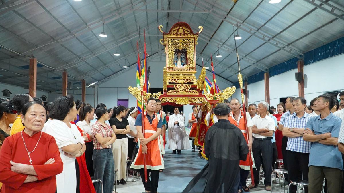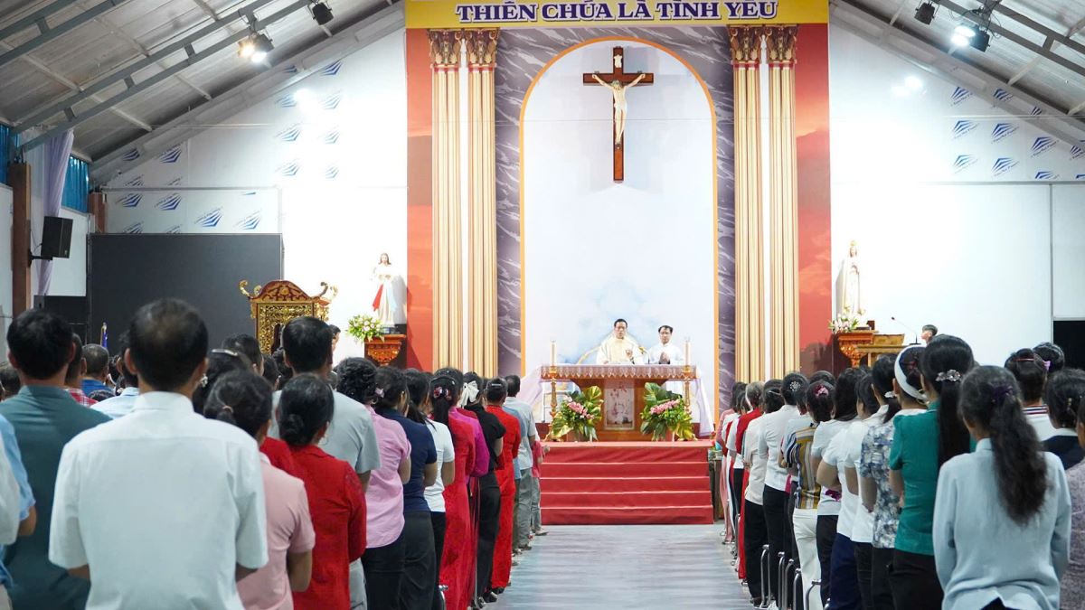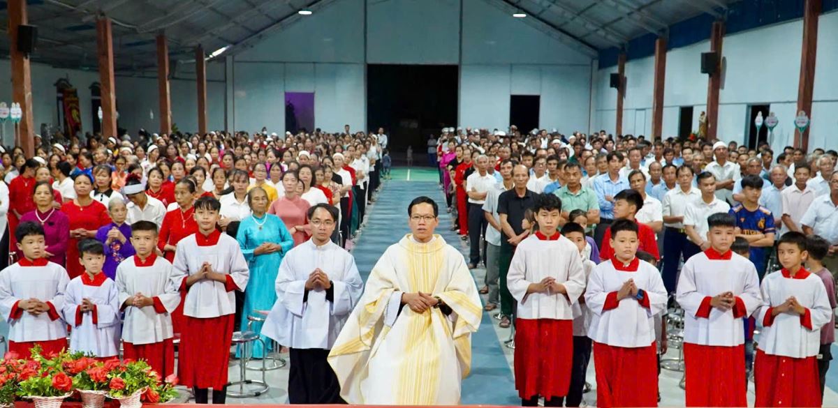 Kết thúc cuộc rước, cộng đoàn quy tụ trong ngôi nhà đa năng của giáo xứ để hiệp dâng Thánh lễ mừng kính trọng thể Đức Mẹ Mân Côi, do cha xứ Giuse chủ tế.