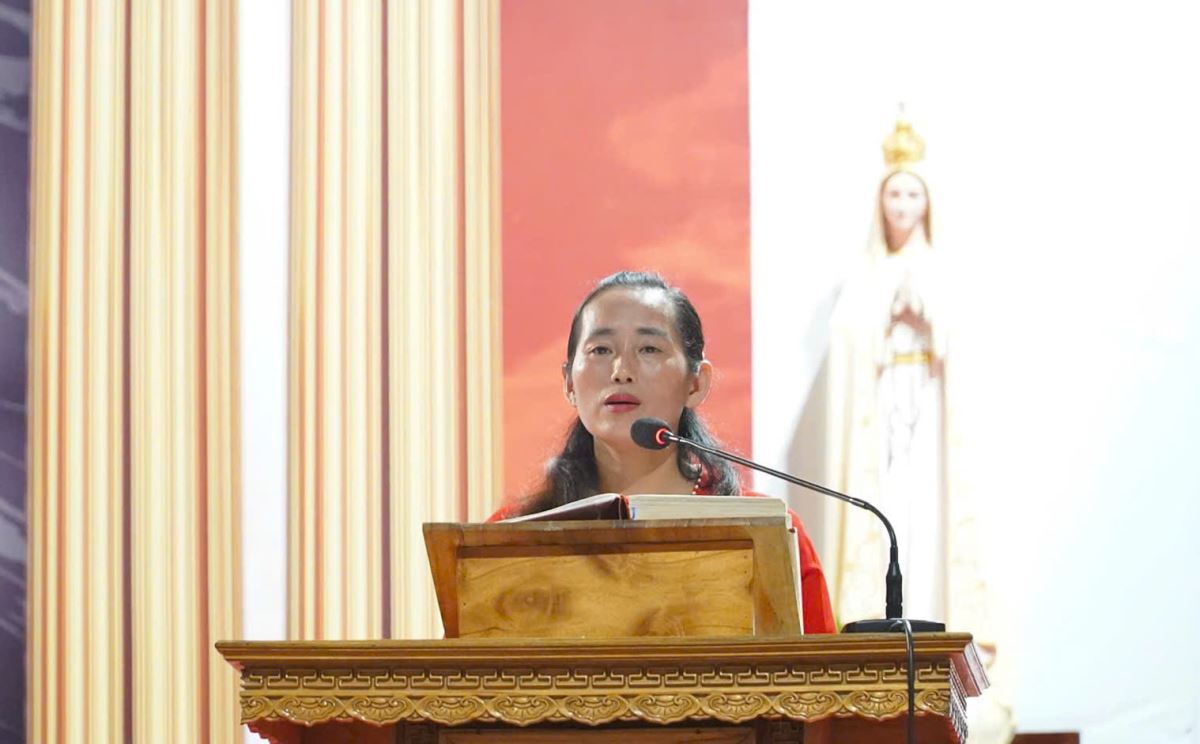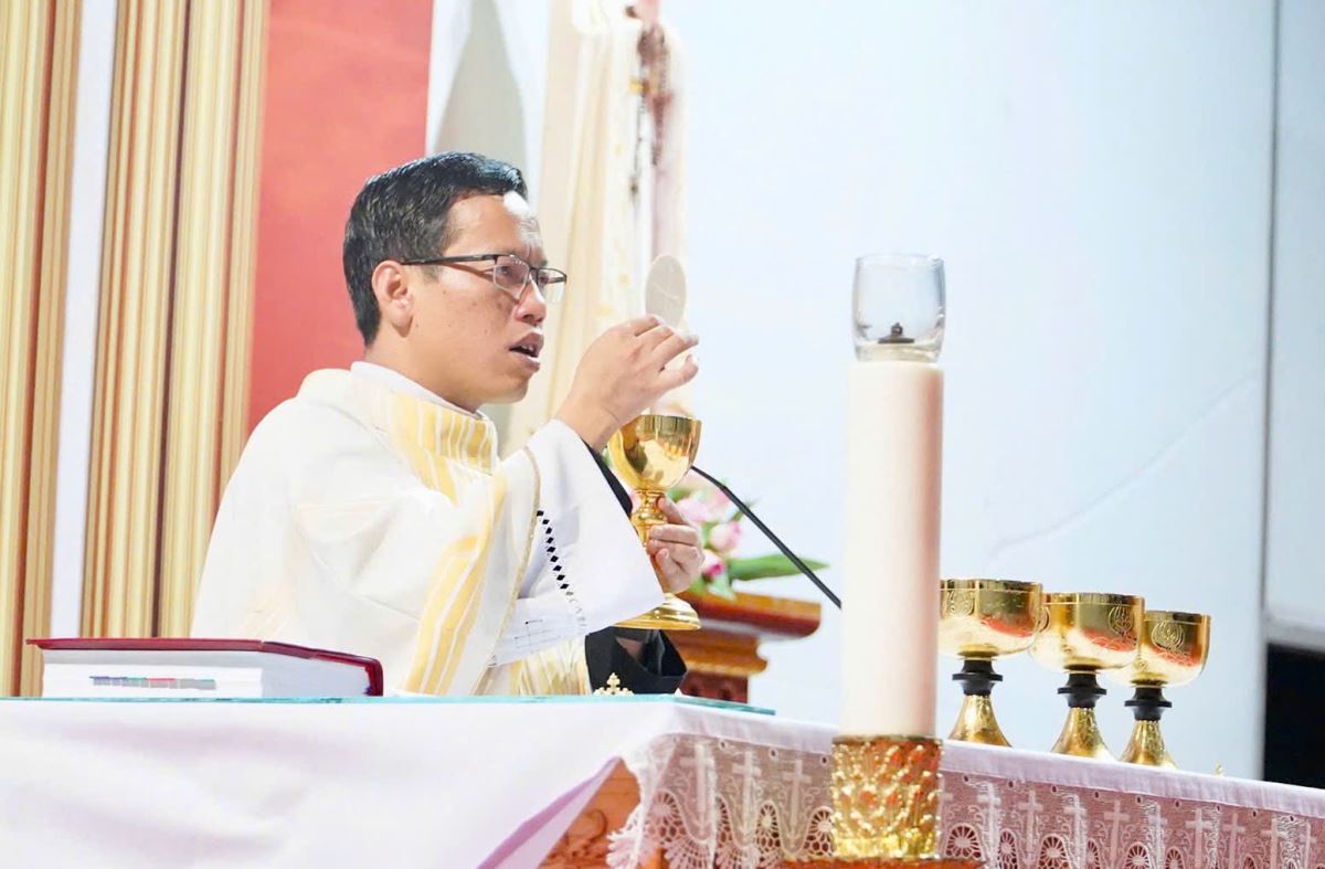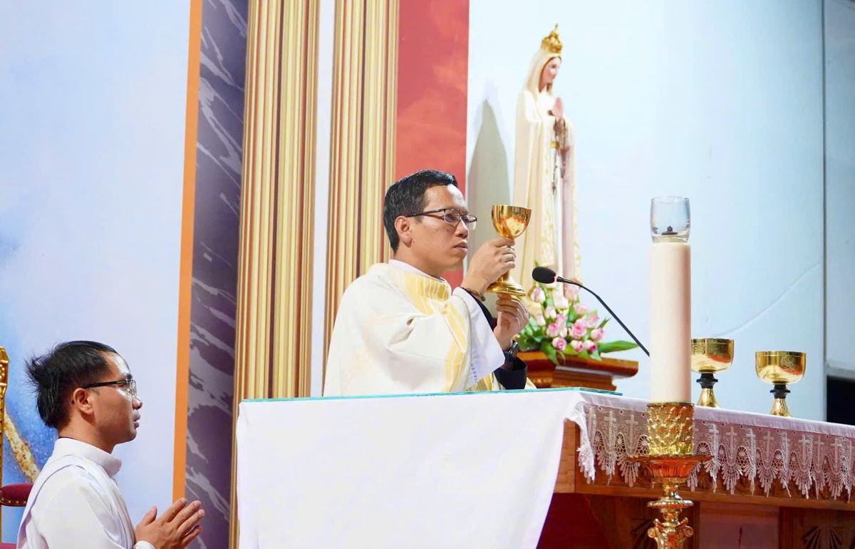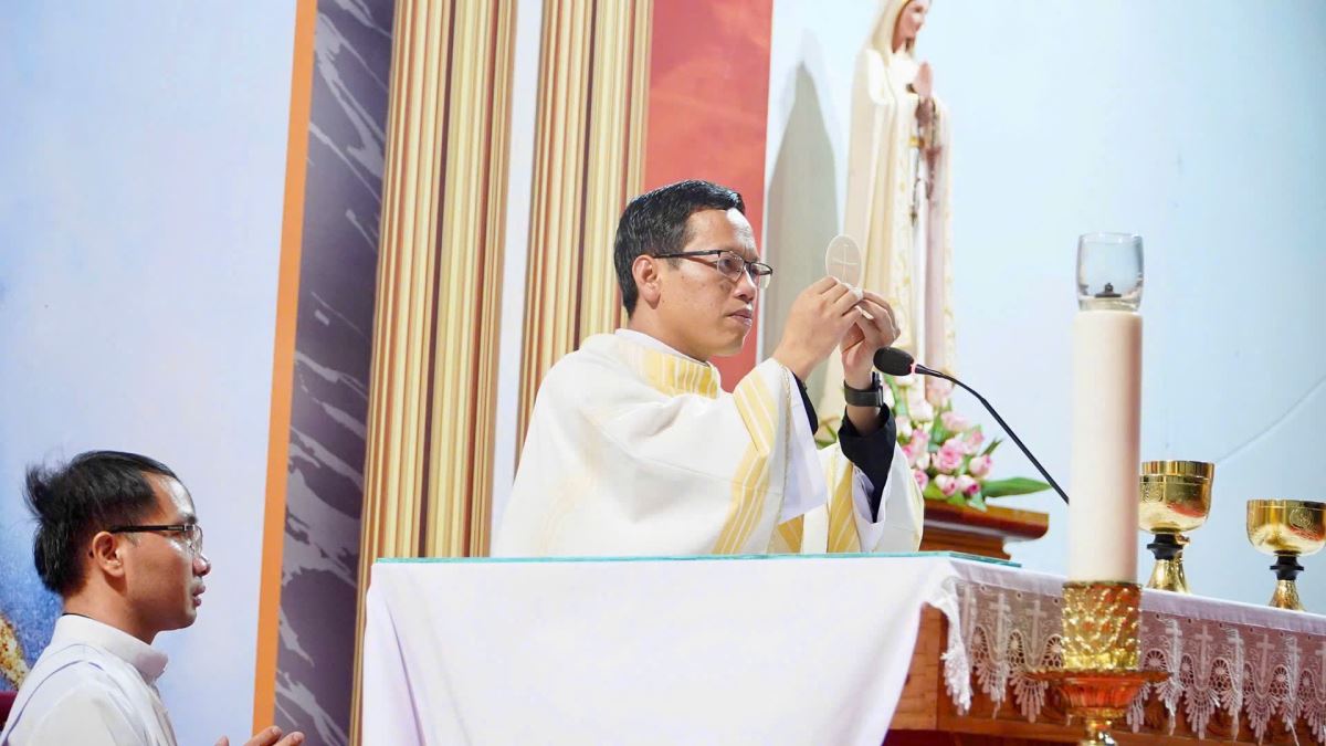 Kết thúc cuộc rước, cộng đoàn quy tụ trong ngôi nhà đa năng của giáo xứ để hiệp dâng Thánh lễ mừng kính trọng thể Đức Mẹ Mân Côi, do cha xứ Giuse chủ tế.