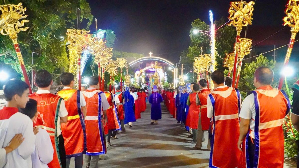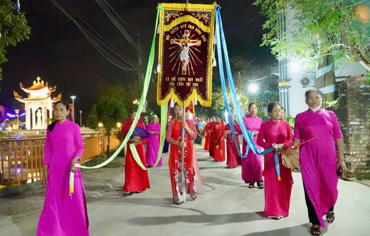 Đúng 19g00, sau hồi chuông ngân vang báo hiệu, cộng đoàn dân Chúa quy tụ đông đảo tại phía cuối ngôi nhà thờ cổ kính. Sau khi cùng nhau sốt sắng nguyện kinh, đoàn rước trang trọng tiến bước trong âm vang rộn rã của đội kèn đồng, hòa quyện với tiếng hát du dương của ca đoàn và lời kinh Mân Côi của toàn thể cộng đoàn.