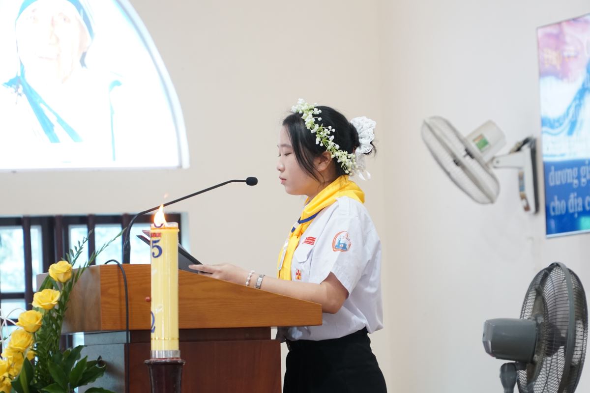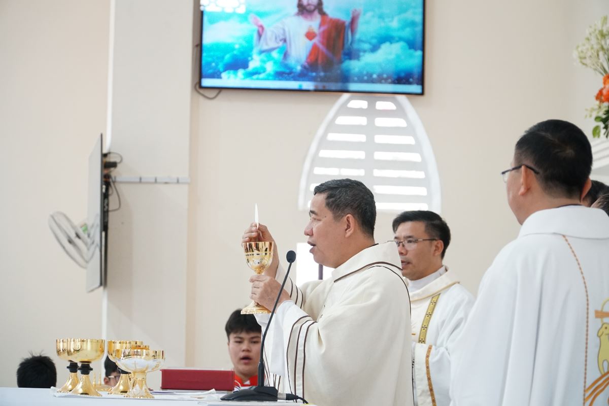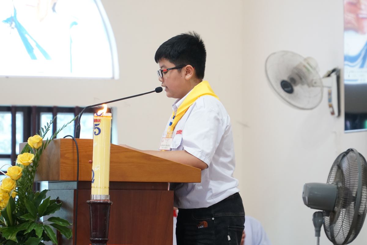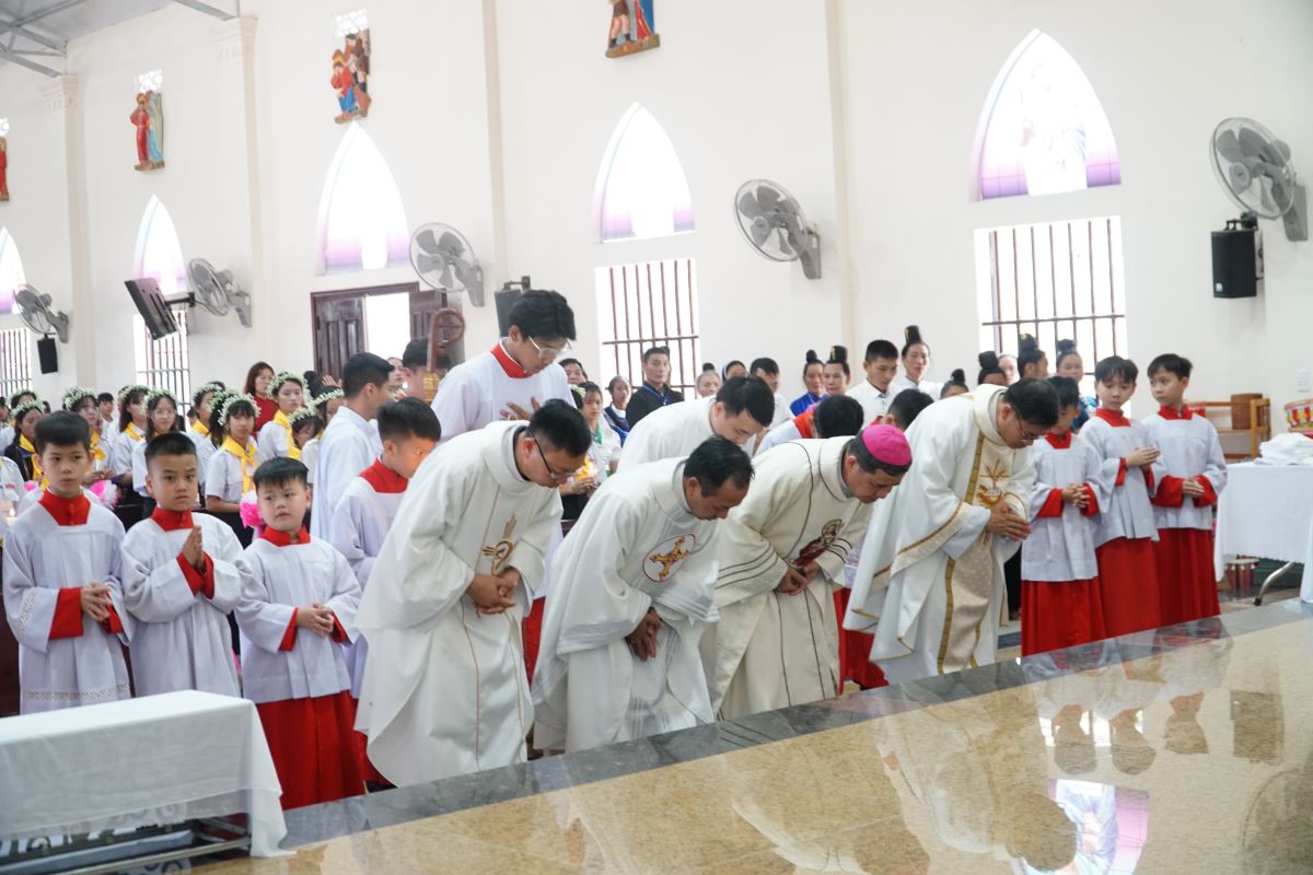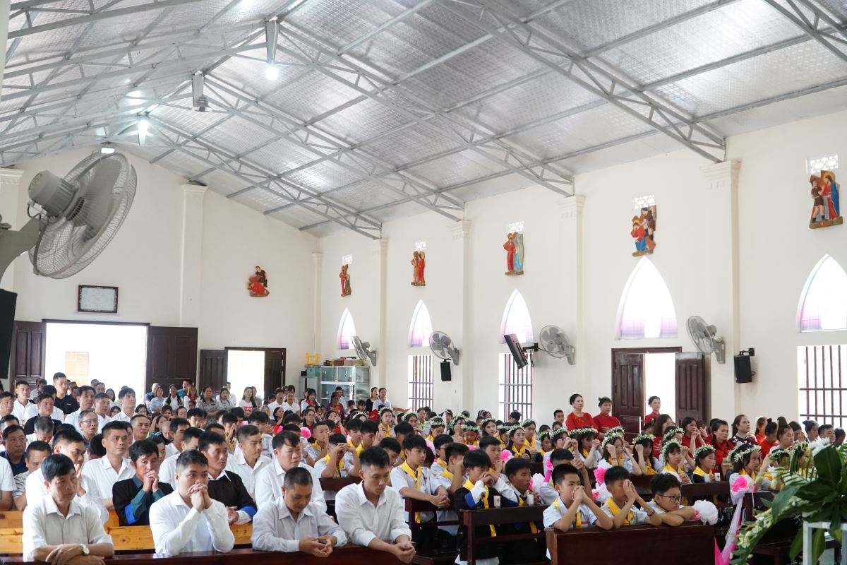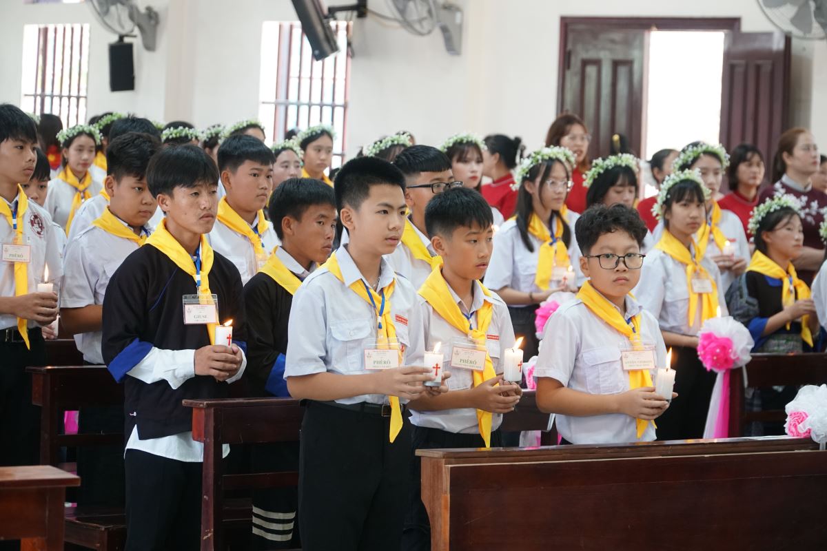 Đúng 09g00, trong tay cầm nến sáng, các em cùng đoàn rước long trọng tiến vào ngôi thánh đường, tham dự Thánh lễ do Đức cha chủ sự. Hiệp thông trong Thánh lễ có cha xứ Giuse Đỗ Tiến Quyền, quý cha phó, thầy phó tế, quý dì, quý chức và đông đảo cộng đoàn dân Chúa.