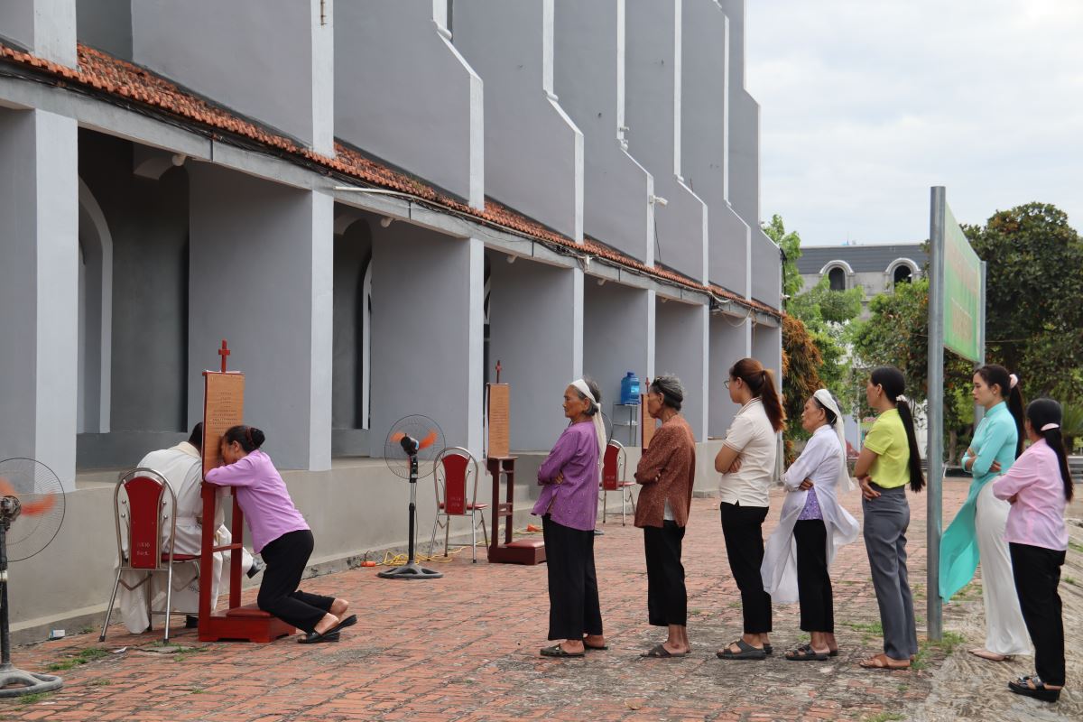 Nghi thức mở đầu đã khơi lên tinh thần sẵn sàng lên đường, để mỗi người bước vào ngày hành hương như một hành trình đức tin, đón nhận muôn vàn hồng ân Năm Thánh. Tiếp đó, cộng đoàn sốt sắng tiến vào thánh đường, tham dự giờ tĩnh tâm – xét mình do quý Dì Dòng Mến Thánh Giá hướng dẫn. Qua lời mời gọi sám hối, mọi người được nhắc nhớ trở về với Chúa, thanh luyện tâm hồn để xứng đáng lãnh nhận ơn toàn xá Năm Thánh nhờ bí tích Hòa giải do quý Cha trong giáo hạt phụ trách.