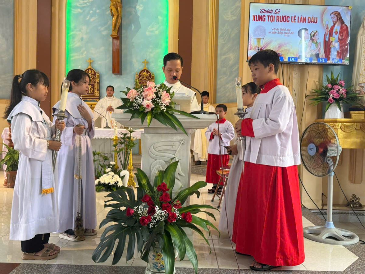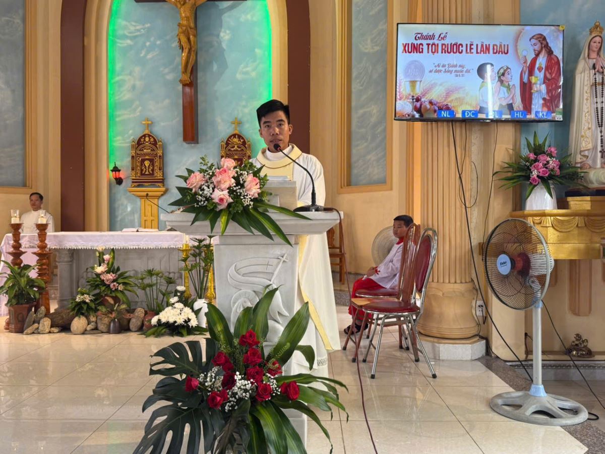 Mở đầu Thánh lễ, Cha xứ gửi lời chào chúc cộng đoàn, cách riêng là các em thiếu nhi - những người hôm nay được rước Mình Máu Thánh Chúa lần đầu tiên. Ngài nhắn nhủ: “Các con hãy giữ tâm hồn trong sạch, sống xứng đáng là con cái Chúa để được rước Chúa mỗi ngày.” Đối với quý phụ huynh, Cha Giuse mời gọi hãy là tấm gương sống đức tin, không bỏ lễ Chúa Nhật, thúc giục con cái đi lễ và học giáo lý.