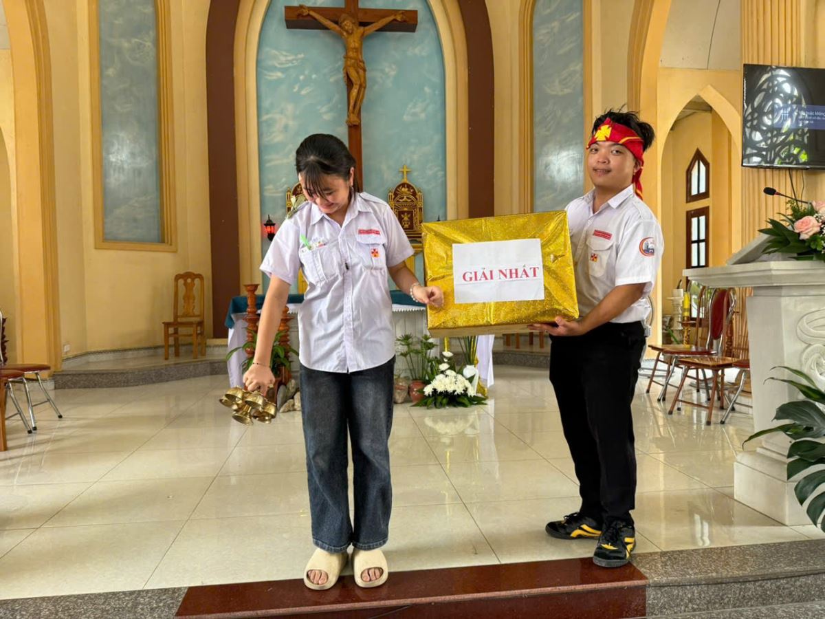 Sau hơn 2 giờ vui chơi sôi nổi, các em bước vào phần thi Rung Chuông Vàng – nơi các em được ôn lại giáo lý, luật Chúa và luật Hội Thánh qua các câu hỏi hấp dẫn và hồi hộp. Phần thi khép lại với niềm hân hoan khi tìm ra “Người rung chuông vàng”.