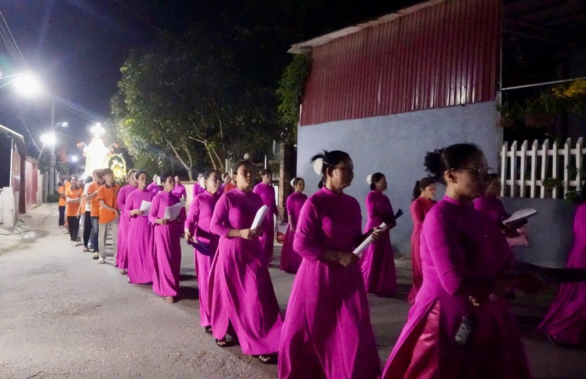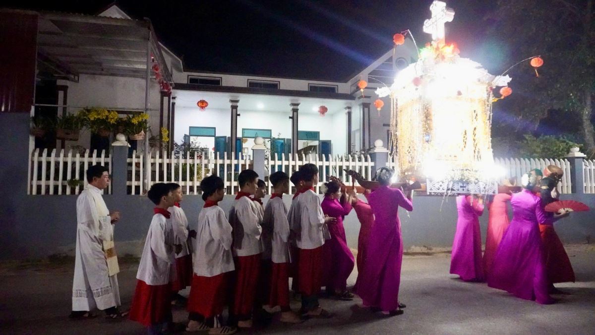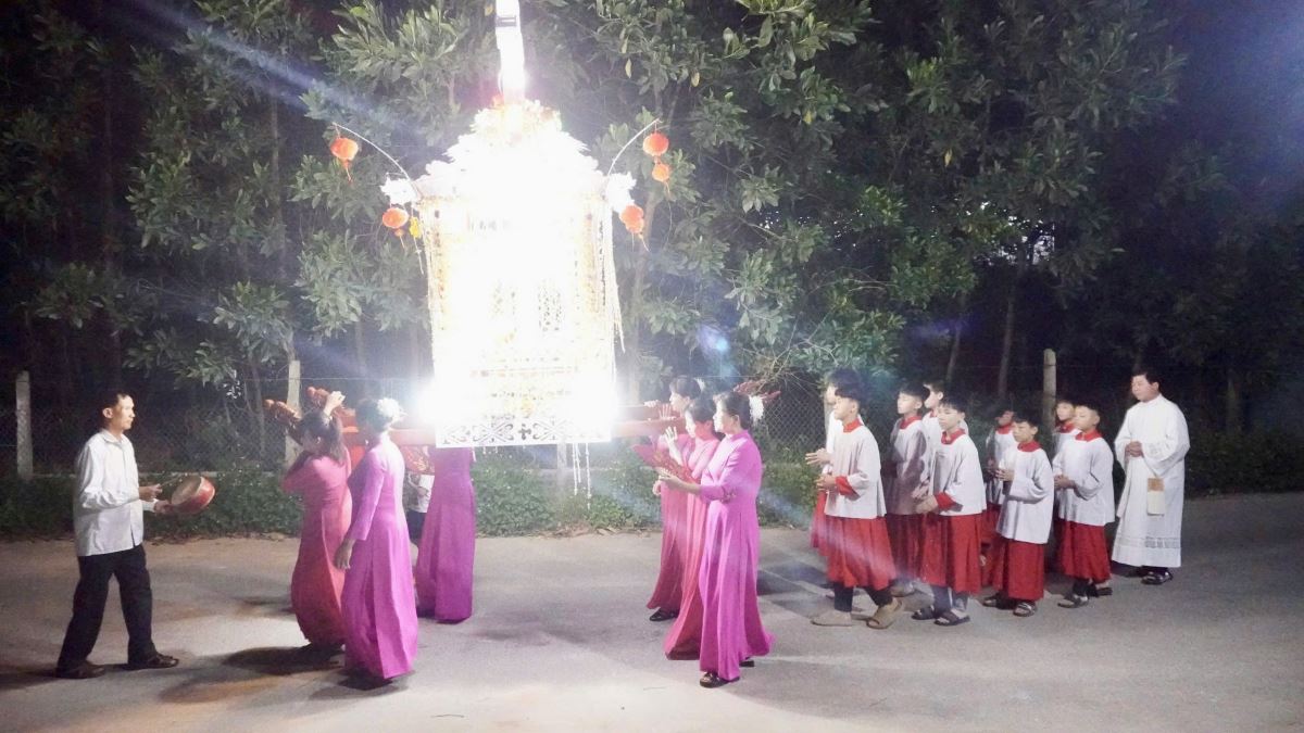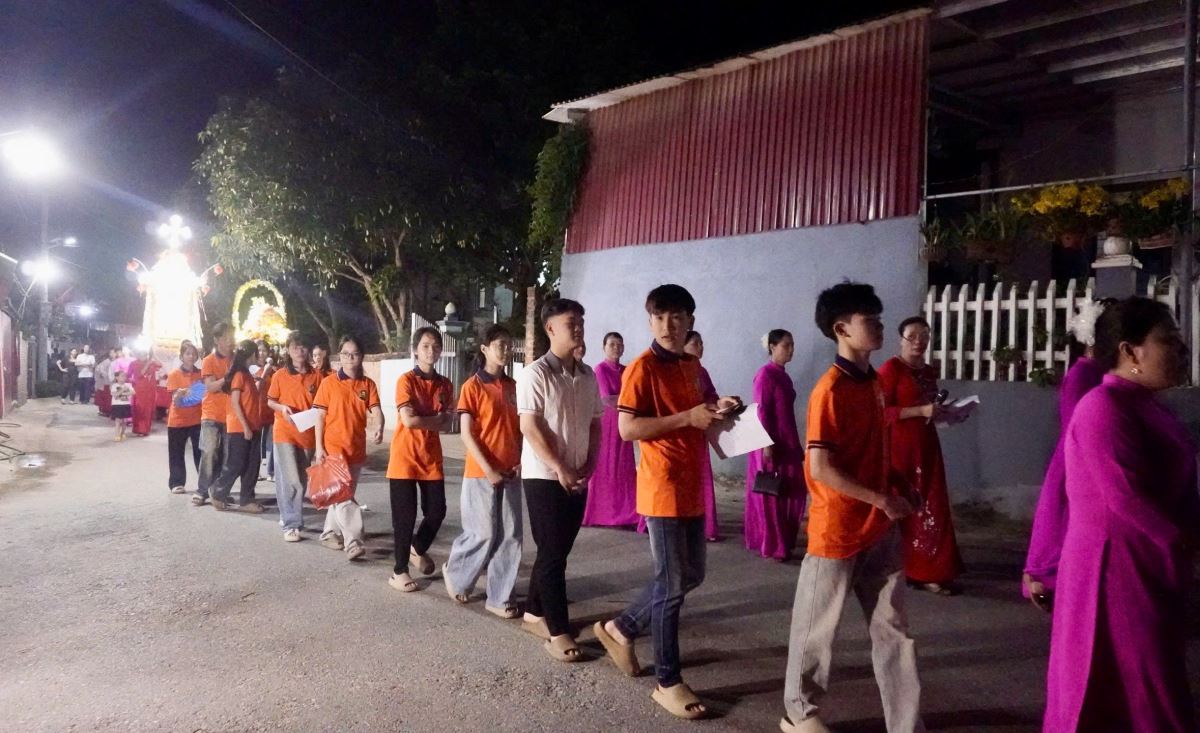 Trước khi bước vào cuộc rước kiệu, Cha xứ Phêrô Lã Công Viên đã chủ sự giờ nguyện kinh và xông hương kiệu Đức Mẹ tại điểm khởi hành kiệu. Quãng đường rước kiệu dài khoảng 1.000m quanh các ngõ xóm trong giáo xứ. Cuộc rước kiệu đã diễn ra trong bầu khí trang nghiêm với những tiếng hát, lời kinh và những bản hòa tấu từ đội kèn và đội trống của giáo xứ.