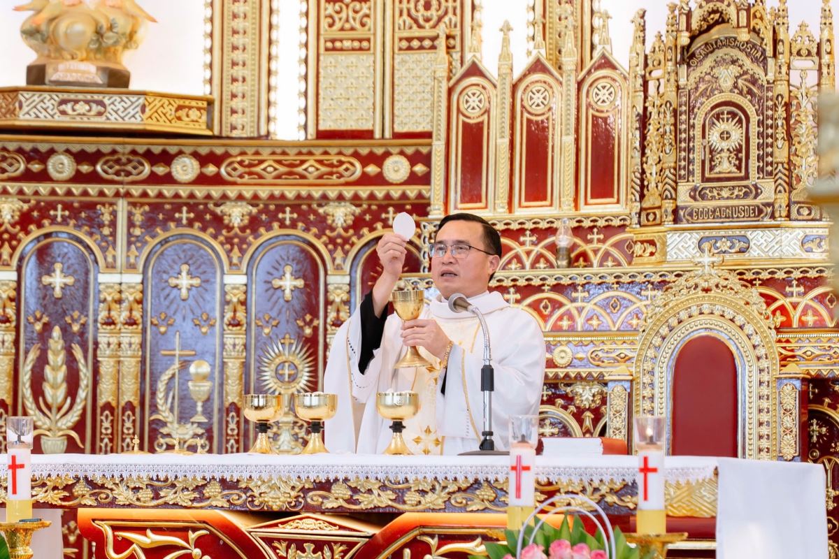 Kết thúc vãn hoa, cộng đoàn bước vào Thánh lễ kính trọng thể Đức Mẹ Mân Côi do Cha xứ Giuse chủ tế. Trong bài giảng, Cha Giuse mời gọi cộng đoàn cảm tạ Thiên Chúa vì đã ban cho nhân loại người Mẹ thánh thiện, khiêm nhường và luôn vâng phục thánh ý Chúa. Cha nhấn mạnh rằng: Kinh Mân Côi là bản tóm lược Tin Mừng, là lời kinh vừa ca tụng, cảm tạ, vừa giúp người tín hữu chiêm ngắm các mầu nhiệm cứu độ của Đức Kitô cùng Mẹ Maria. Qua mỗi chuỗi Mân Côi, người tín hữu được mời gọi kết hiệp mật thiết hơn với Chúa và noi gương Mẹ sống khiêm nhường, yêu thương và tín thác.