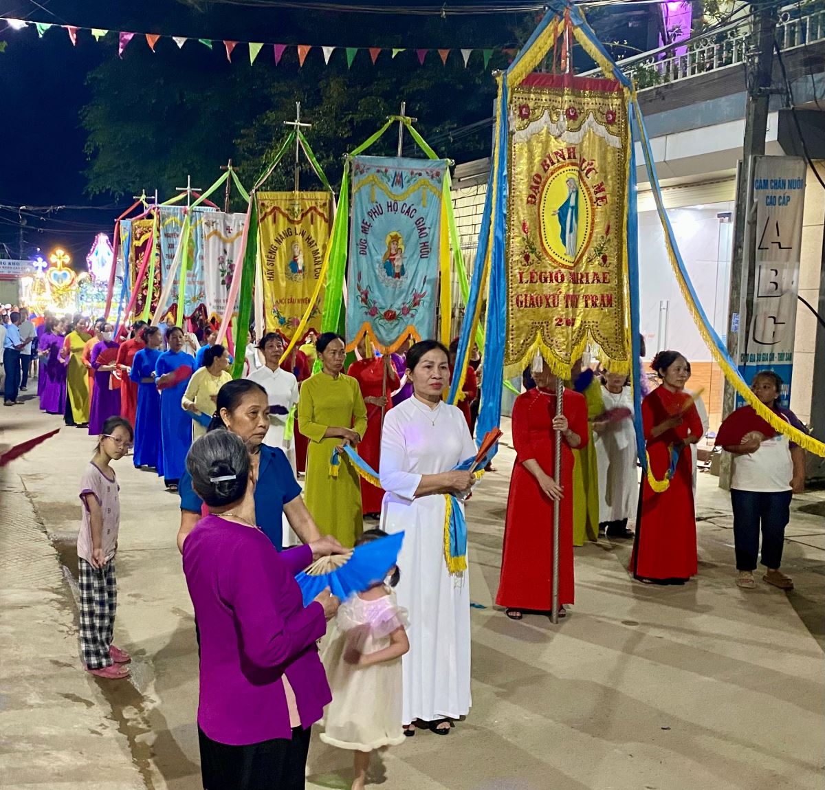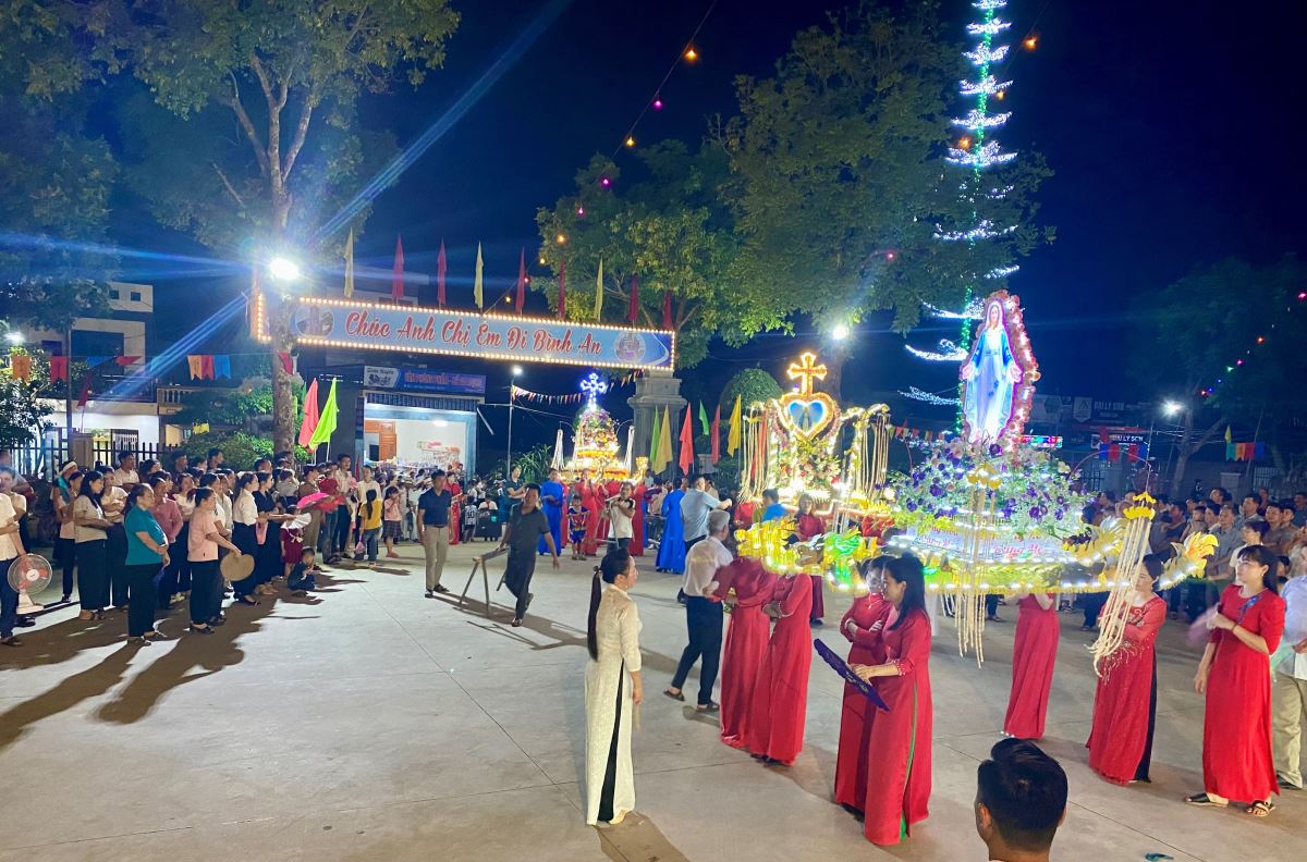 Đúng 19g00, cuộc rước được bắt đầu do cha xứ Giuse chủ sự, khởi hành từ ngã tư nhà Hội đồng. Đi đầu đoàn rước là đội trống trắc với những nhịp trống trầm hùng và các cử điệu sênh tiền - mõ lộn, cờ, gậy nhịp nhàng uyển chuyển, tiếp nối theo sau là bình tẩu hương - Thánh giá nến cao, khối cờ của các Hội đoàn, Hội hoa, ba kiệu hoa, ban kèn và kiệu tượng Đức Mẹ, sau cùng là lễ sinh và Cha chủ sự. Các thành phần giáo dân xếp thành hàng đôi hàng ba đi hai bên, trên đoạn đường khoảng ngót một ngàn mét tiến về nhà thờ.