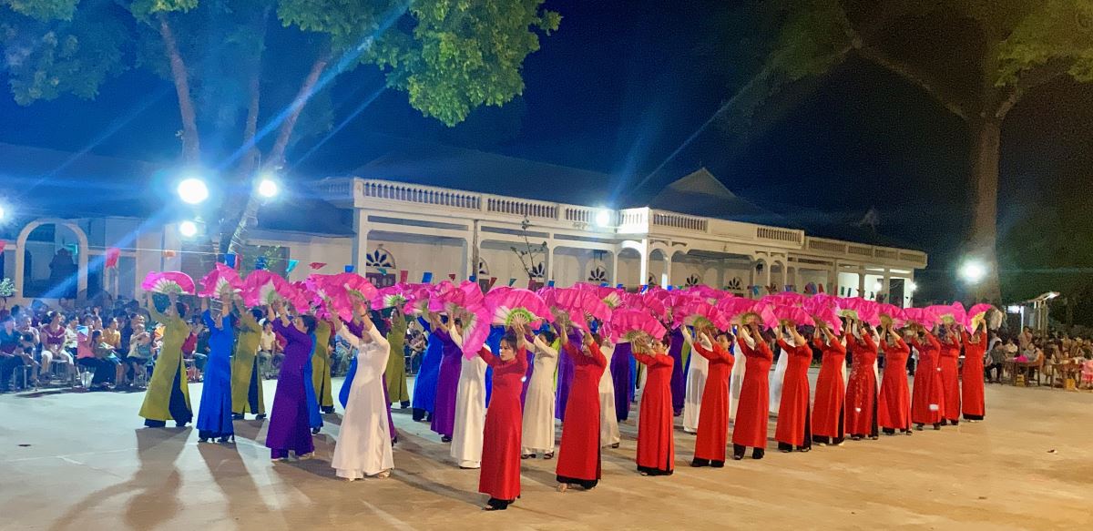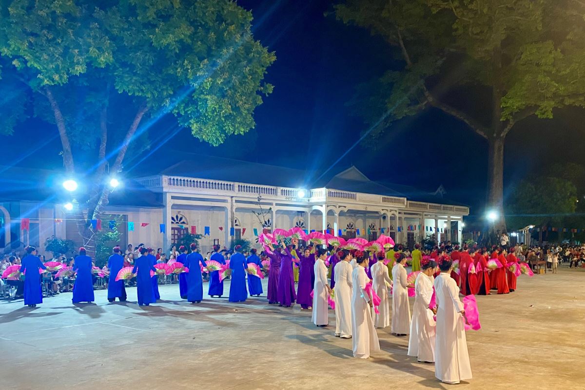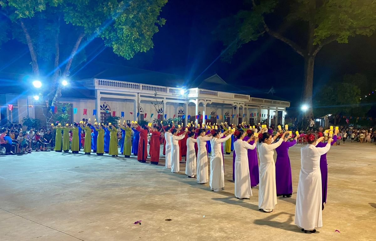 Khi đoàn rước đã về tề tựu trong khuôn viên nhà xứ, Hội hoa tiến hành dâng lên Mẹ: hoa - hương - nến - quạt tượng trưng cho muôn đóa hoa lòng của đoàn con cái Mẹ, với những cử điệu uyển chuyển nhịp nhàng theo tiết tấu làn điệu của các bản nhạc ca từ lúc vui tươi dịu dàng, khi trầm bổng thiết tha dẫn cộng đoàn vào chiêm ngắm và nguyện cầu được nương nhờ bên Mẹ, kết hiệp với Mẹ.