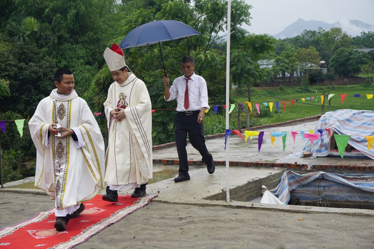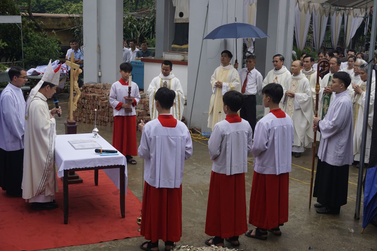 Đúng 09g00, Đức cha Đaminh Hoàng Minh Tiến đã chủ sự nghi thức làm phép đất nơi sẽ xây dựng nhà học Giáo lý. Ngài cầu xin Thiên Chúa chúc lành, bảo vệ và hướng dẫn công trình từ lúc khởi sự đến khi hoàn thành.