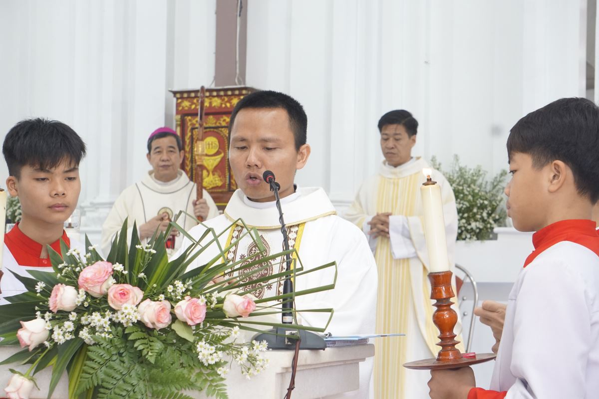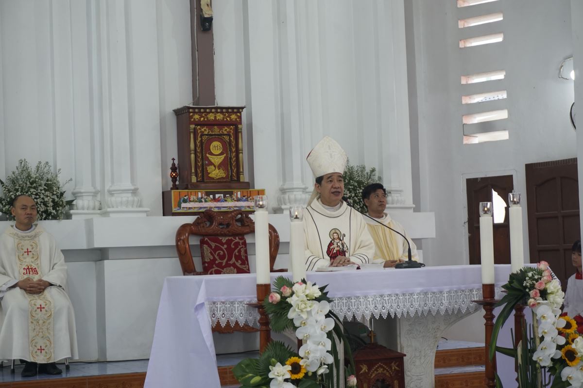 Trong bài giảng lễ, Đức cha Đaminh đã chia sẻ về ý nghĩa của lao động trong đời sống Kitô hữu. Ngài nhấn mạnh rằng, trong thời đại ngày nay, dù là lao động chân tay hay trí óc, mỗi công việc đều mang giá trị thiêng liêng, bởi chính qua lao động, con người cộng tác với Thiên Chúa trong công trình sáng tạo. Dẫn lại sách Sáng Thế, Đức cha nhắc rằng lao động là một ân huệ từ Thiên Chúa ban cho con người. Ngài cũng mời gọi cộng đoàn chiêm ngắm mẫu gương Thánh Giuse người thợ mộc khiêm nhường, âm thầm lao nhọc vì gia đình, nhờ đó đã góp phần hình thành nhân cách và đức tin nơi Đức Giêsu. Từ đó, Đức cha khẳng định: việc xây dựng ngôi nhà học giáo lý không chỉ là lo cho cơ sở vật chất, mà còn là sự đầu tư lâu dài cho công cuộc giáo dục đức tin giúp thế hệ trẻ hôm nay lớn lên trong niềm tin, tình yêu thương và sự hiểu biết vững vàng về Thiên Chúa.