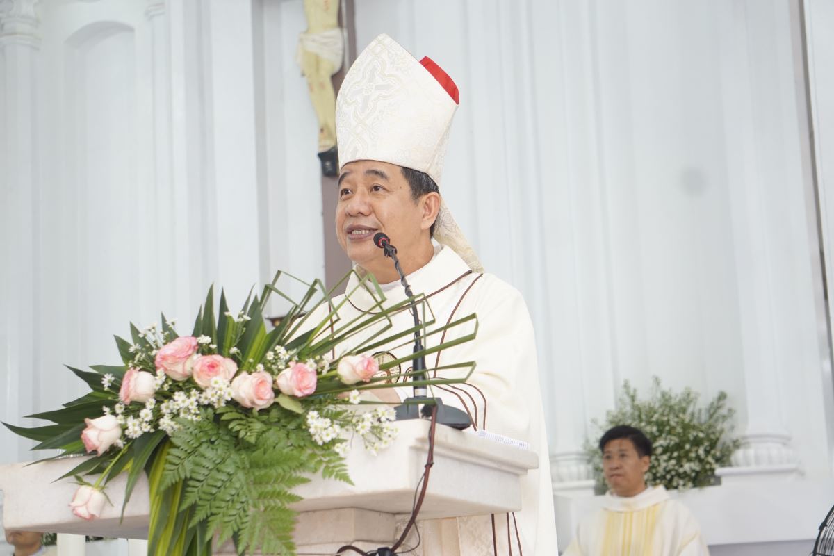 Đặc biệt hơn nữa, vào lúc 08g30 cộng đoàn dân Chúa và quý khách đã được đón người cha chung kính yêu của giáo phận - Đức cha Đaminh Hoàng Minh Tiến.