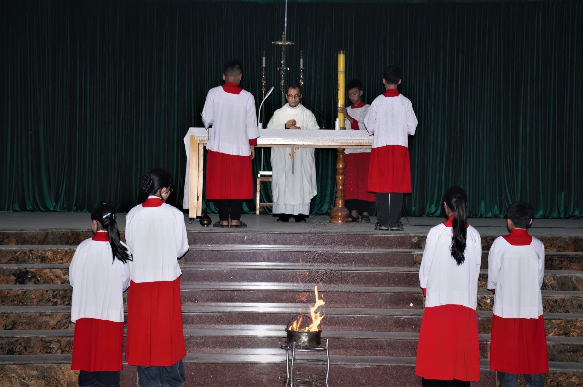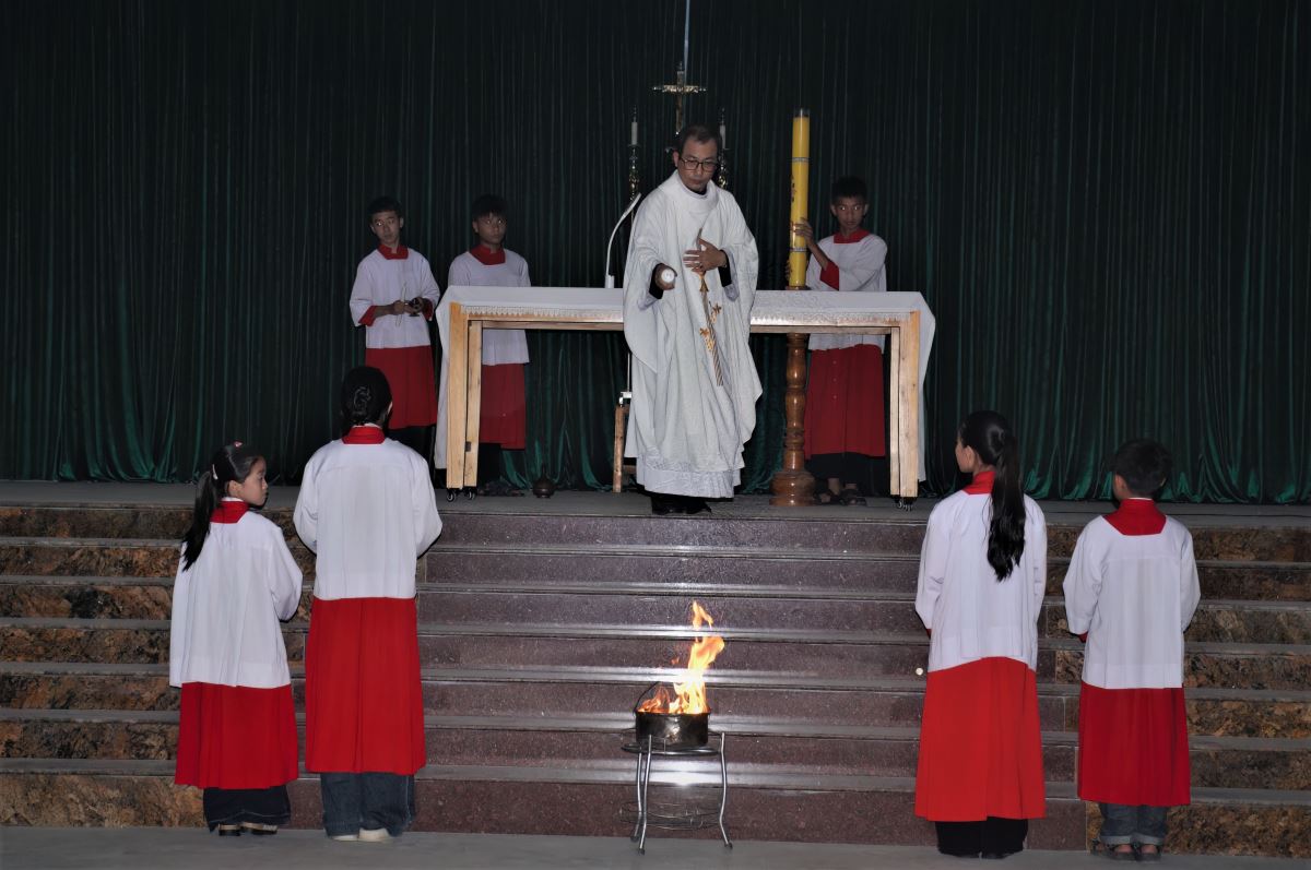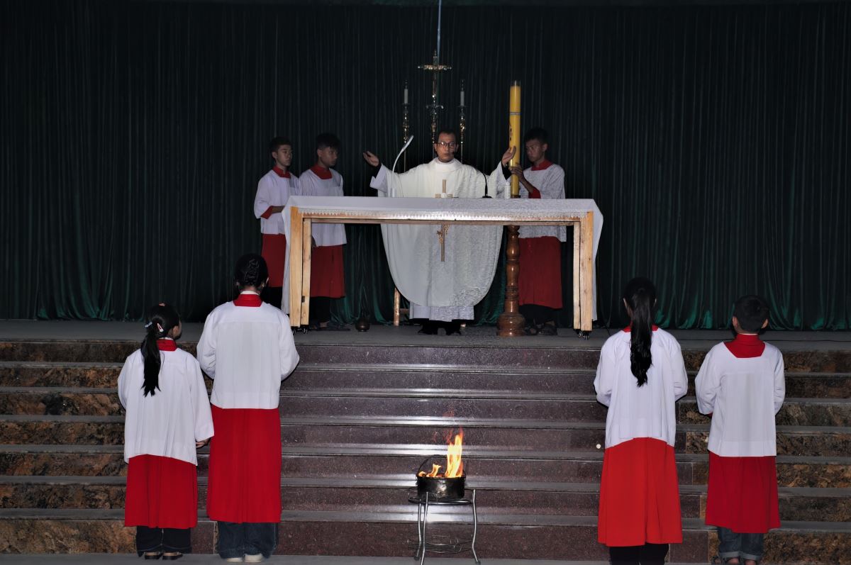 Mở đầu nghi thức, cộng đoàn quy tụ tại hội trường giáo xứ để tham dự nghi thức làm phép lửa và thắp Nến Phục Sinh.