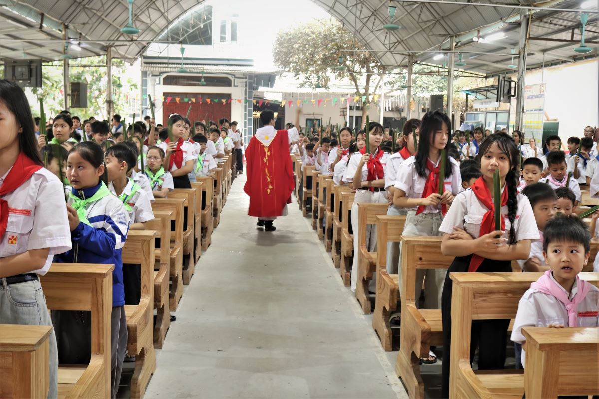 Ngay từ đầu thánh lễ, các em thiếu nhi đã cùng nhau cầm lá trên tay, rước vào nhà thờ, tái hiện lại hình ảnh Chúa Giêsu tiến vào thành Giêrusalem trong niềm hân hoan của dân chúng. Tuy nhiên, bầu khí vui tươi ấy dần lắng lại khi cộng đoàn bước vào phần phụng vụ Lời Chúa với bài Thương Khó Của Chúa Giêsu.