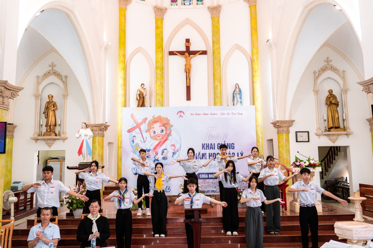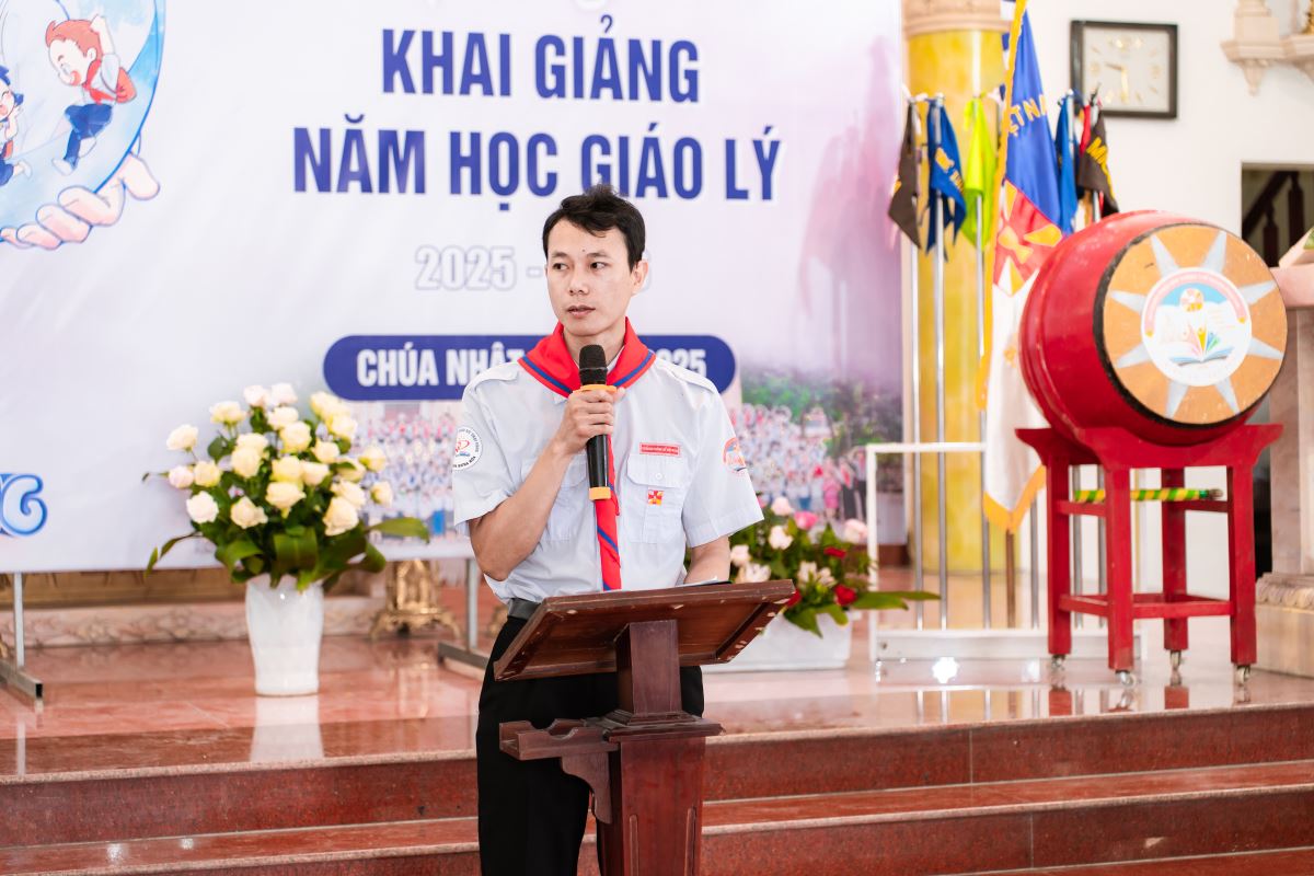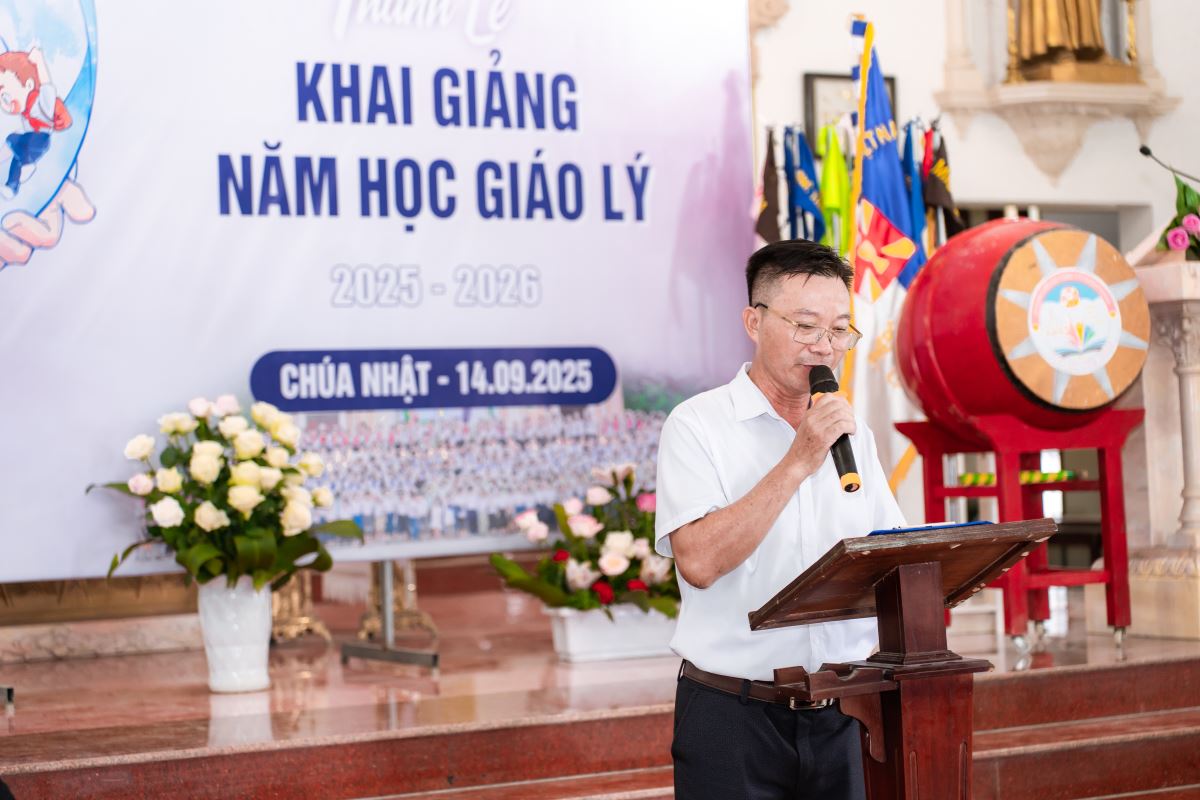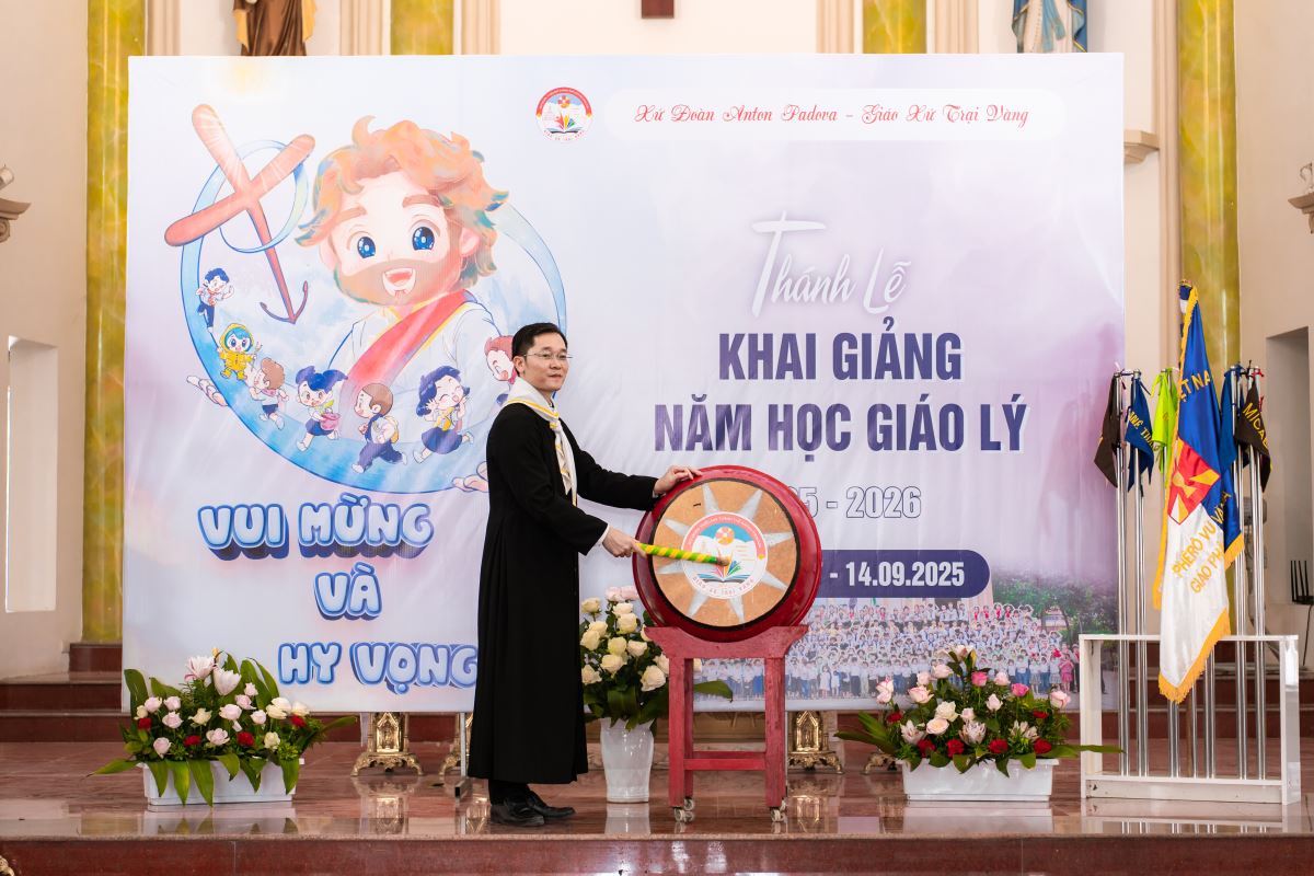 Kế đến, Cha Giuse Nguyễn Tiến Thành, đặc trách giáo xứ Trại Vàng đã nhấn mạnh chủ đề “Vui Mừng và Hy Vọng” là cốt lõi cho hành trình giáo dục đức tin trong năm học mới, và chính thức tuyên bố khai giảng năm học mới bằng hồi trống rộn rã.