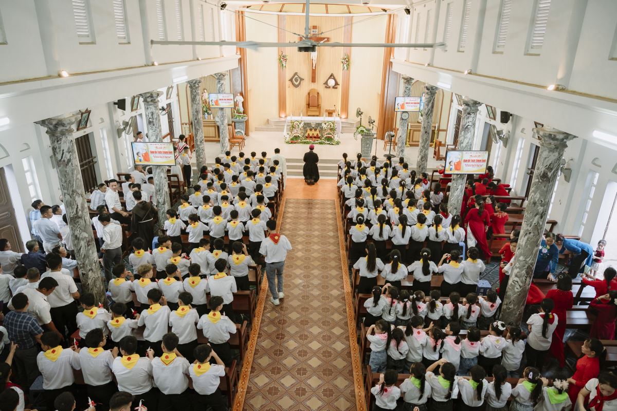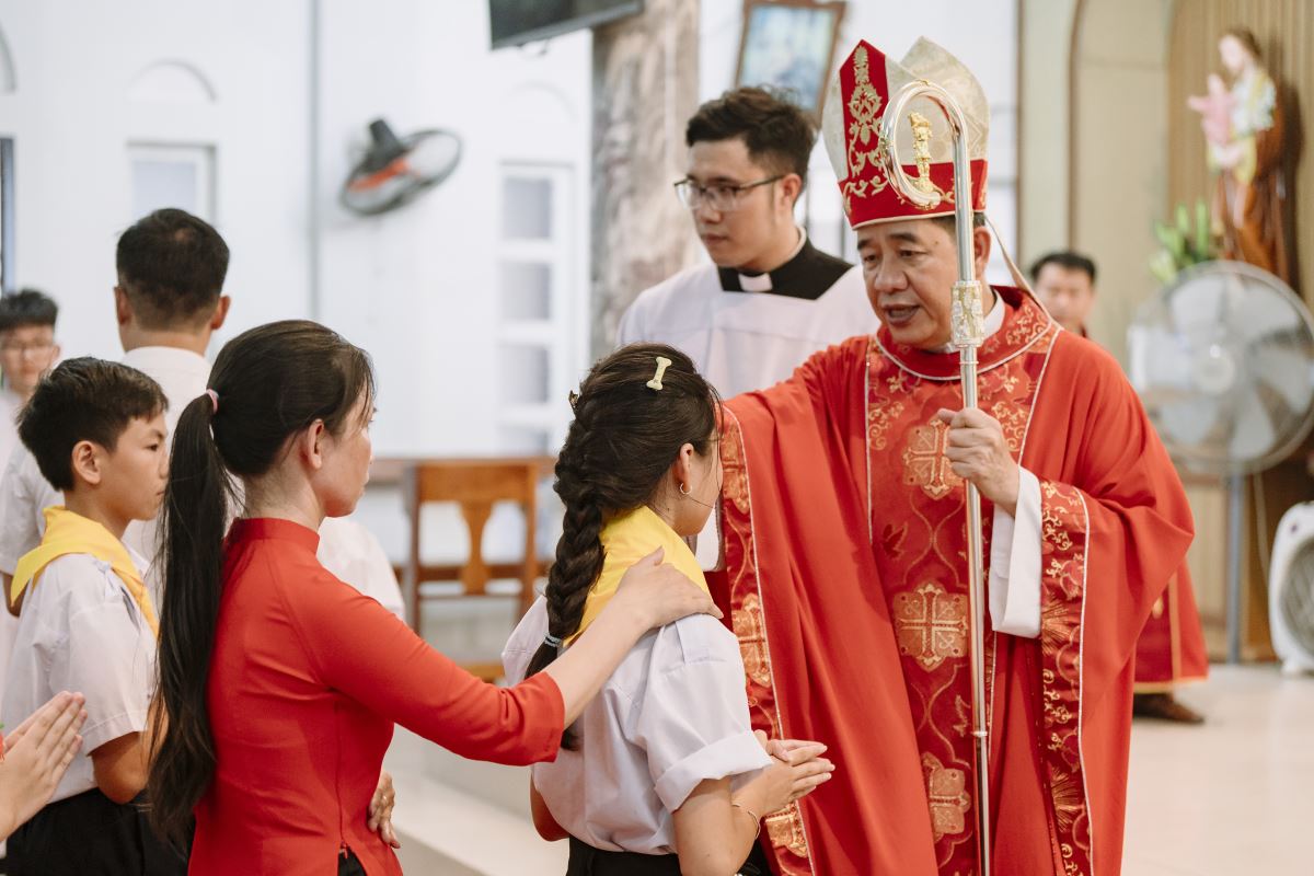 Trong bài giảng đầy tâm huyết và gần gũi, Đức Cha Đaminh đã nhắn nhủ các em thiếu nhi hãy luôn mở lòng đón nhận ơn Chúa Thánh Thần, sống đức tin mạnh mẽ, trưởng thành trong đời sống Kitô hữu, trở thành những chứng. Sau bao tháng ngày học hỏi giáo lý, rèn luyện đức tin và chuẩn bị tâm hồn, hôm nay các em đã chính thức được ghi dấu ấn thiêng liêng qua Bí tích Thêm Sức – một khởi đầu mới trên hành trình sống đạo trưởng thành.